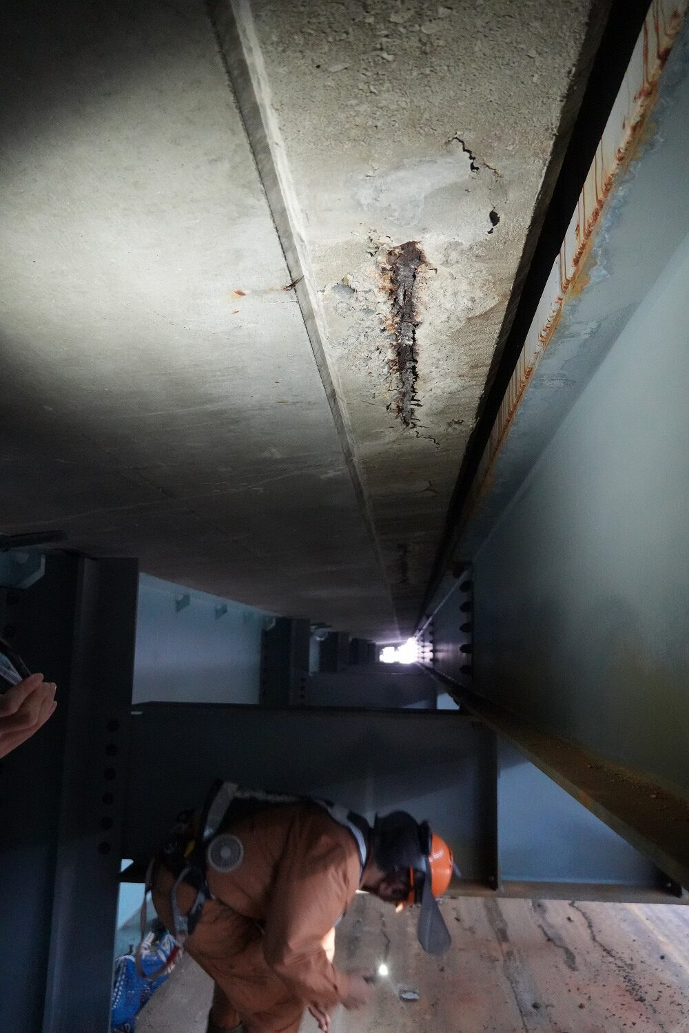 床版防水は中之口川橋(上下線)で2014年6月、小高高架橋(鋼橋区間、RC中空床版区間)で2010年9月、同橋(C-Box区間)で2014年6月にいずれもGⅠ相当を施工している。但し床版下面については、上面の浮きが生じている箇所に対応した位置において、塩化物イオンを確認しており、エフロレッセンスの析出や、亀甲状のひび割れ、さらにはコンクリートの剥落、鉄筋の露出、腐食による断面欠損が見られる箇所も生じていた。