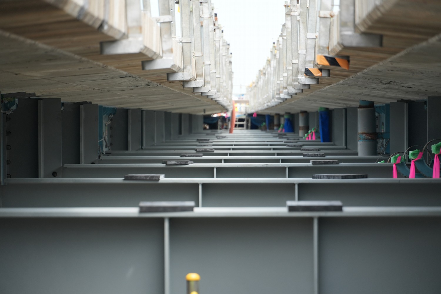 横桁で上下線を繋いで縦桁・覆工板・プレートを構築し舗装を支える