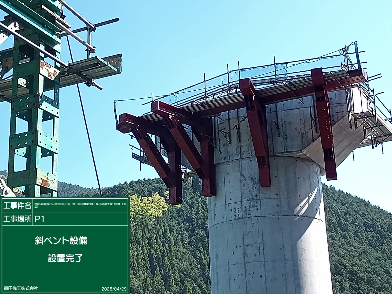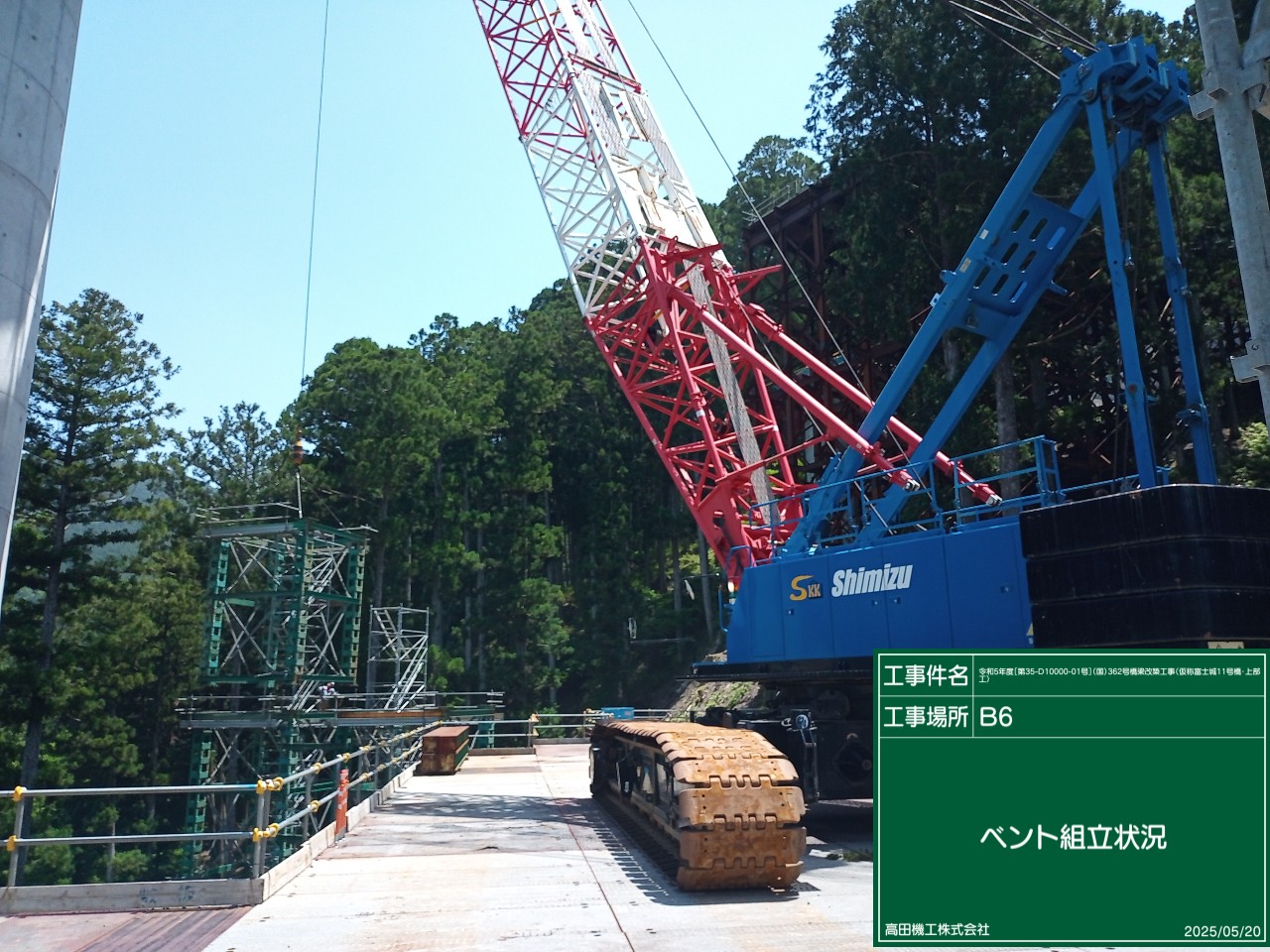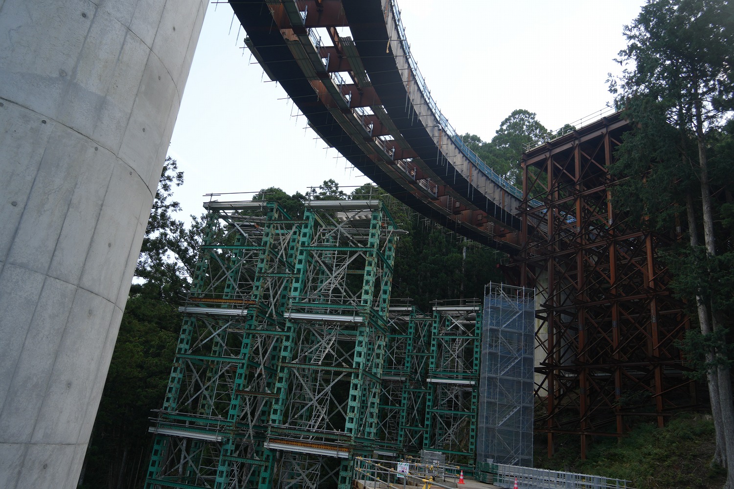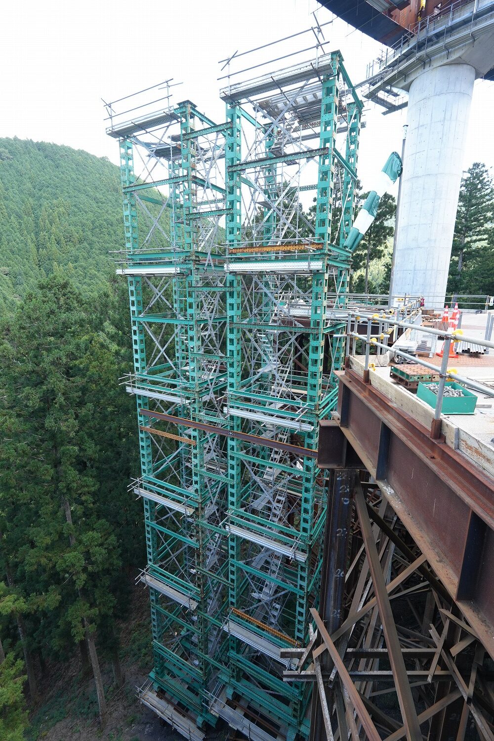 谷間に架かる橋梁のため、橋脚高も高い。最大のP1で53mに達する。そのためベント高も高く、最高地点で43mの高さに設置し、仮桟橋(エムオーテック)を構築していた。上部工にとって幸いなことに仮桟橋は下部工施工時に建設されており、上部工としては新たに仮桟橋をつくる必要はなかった。