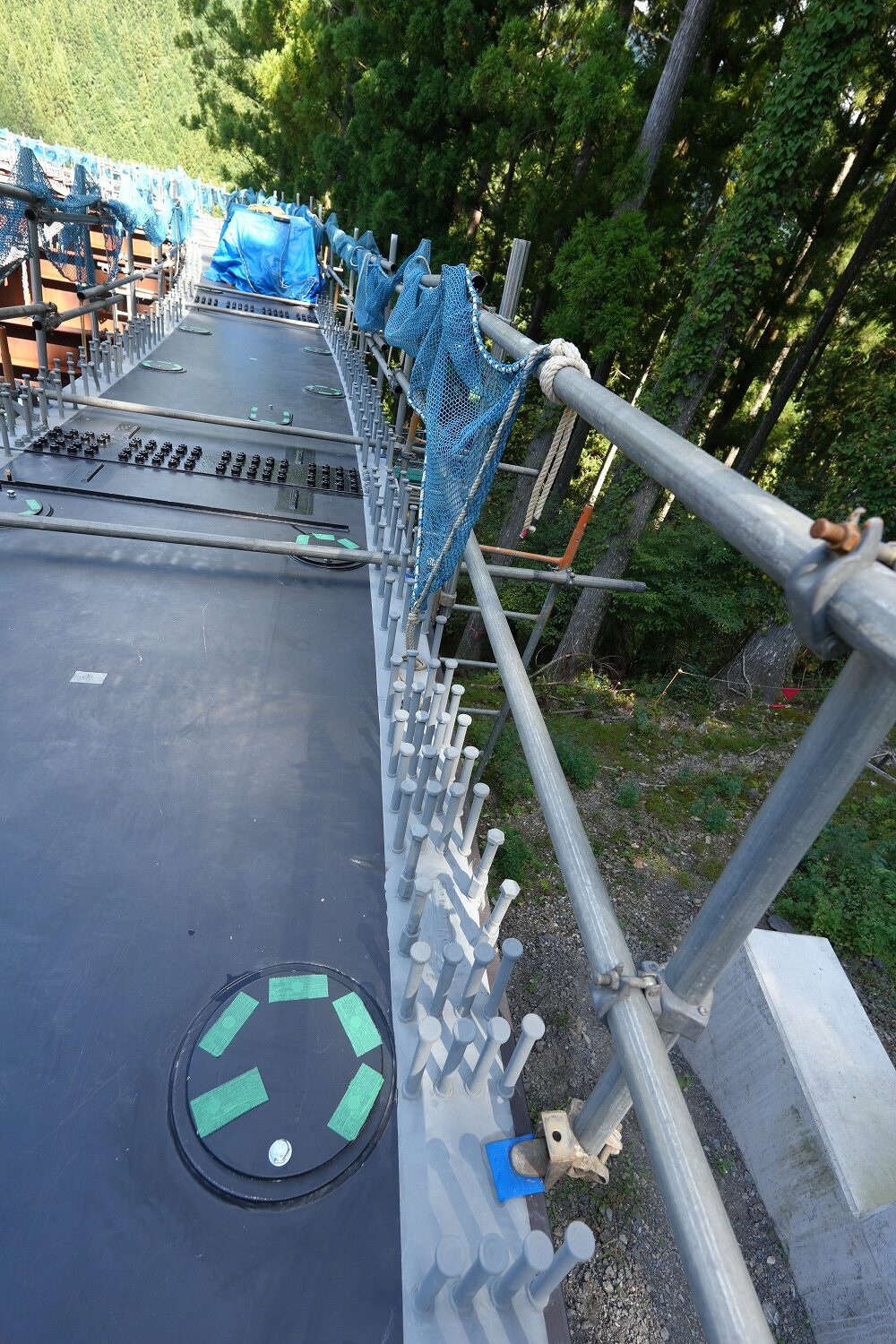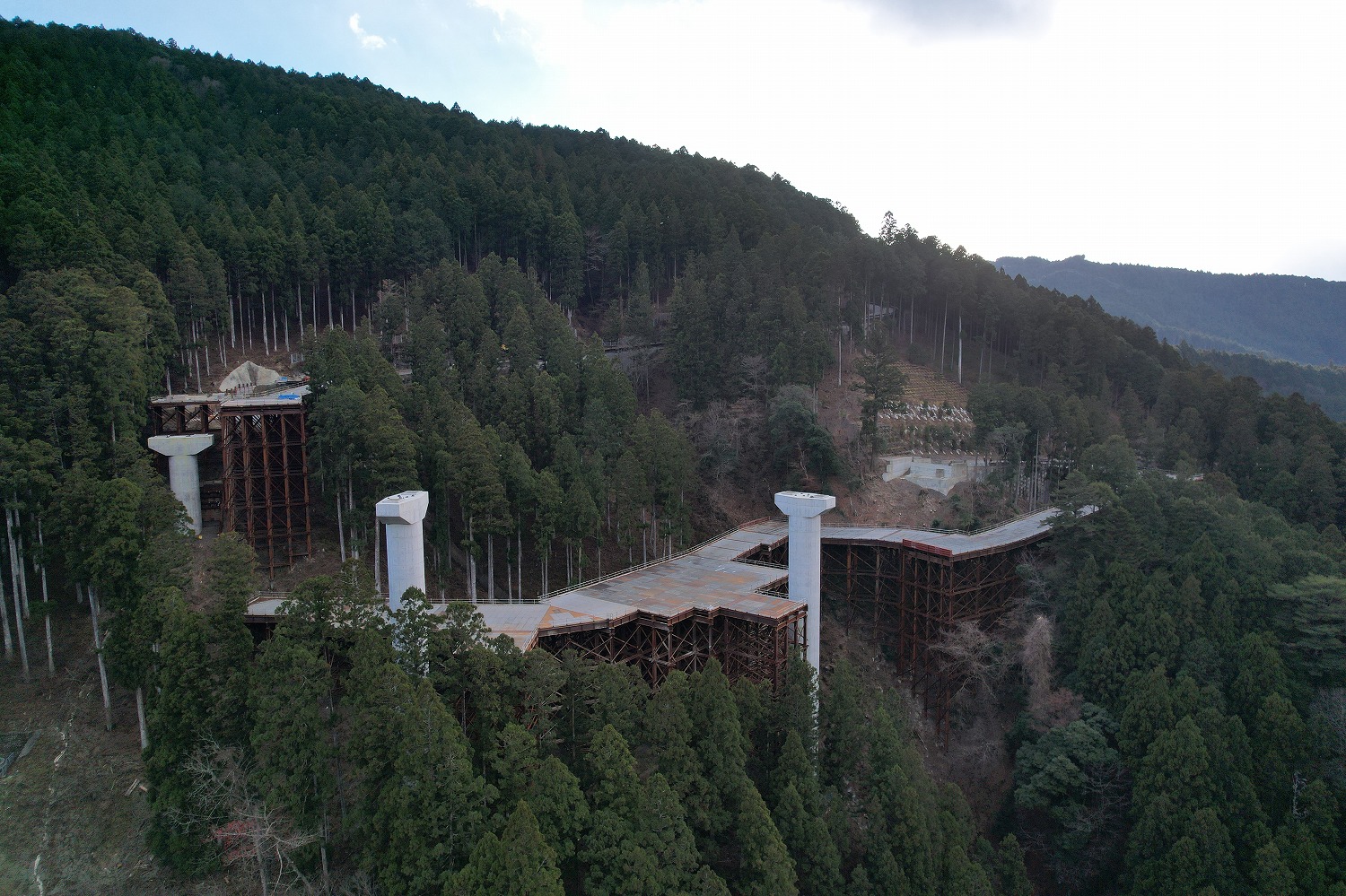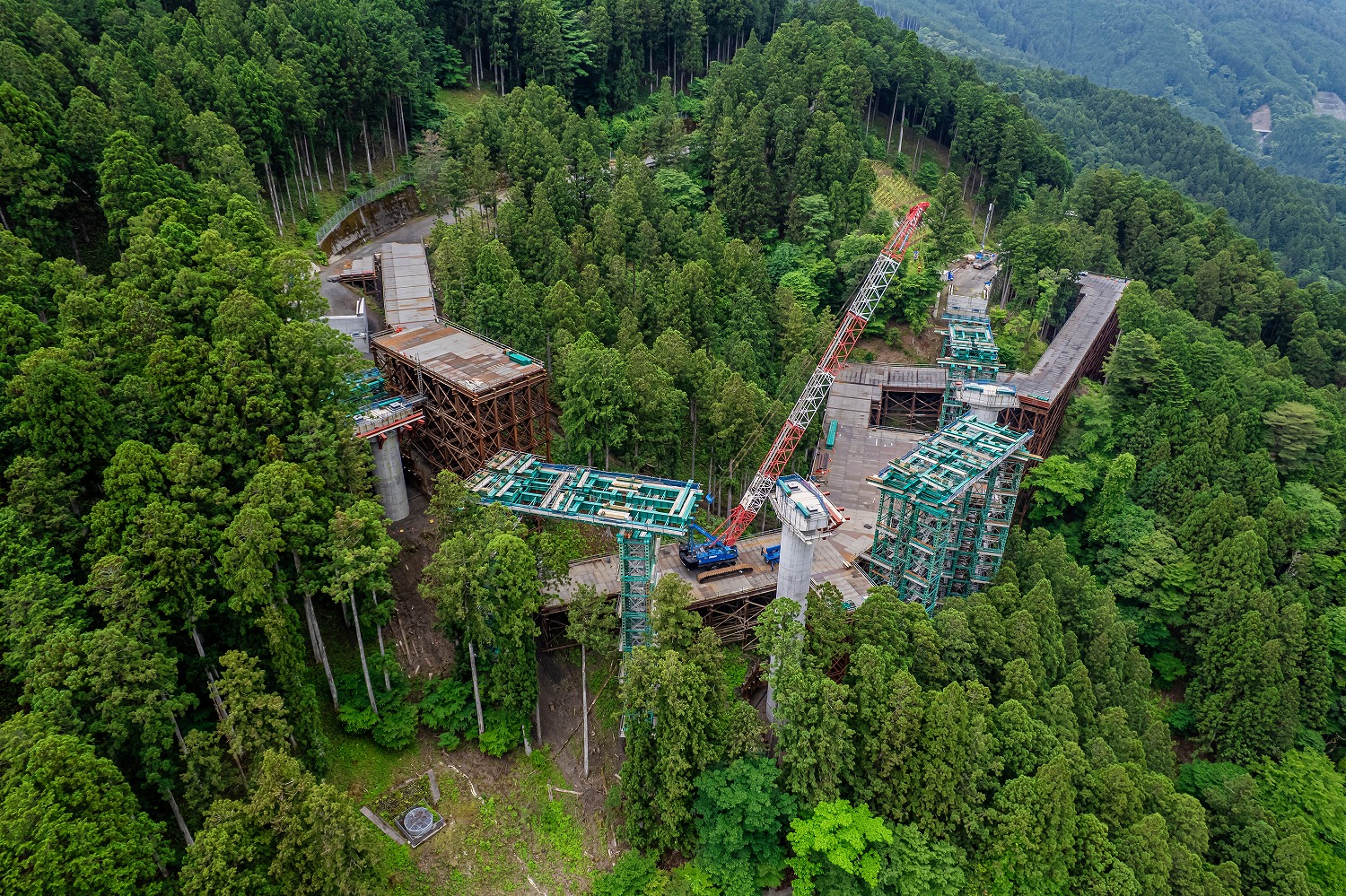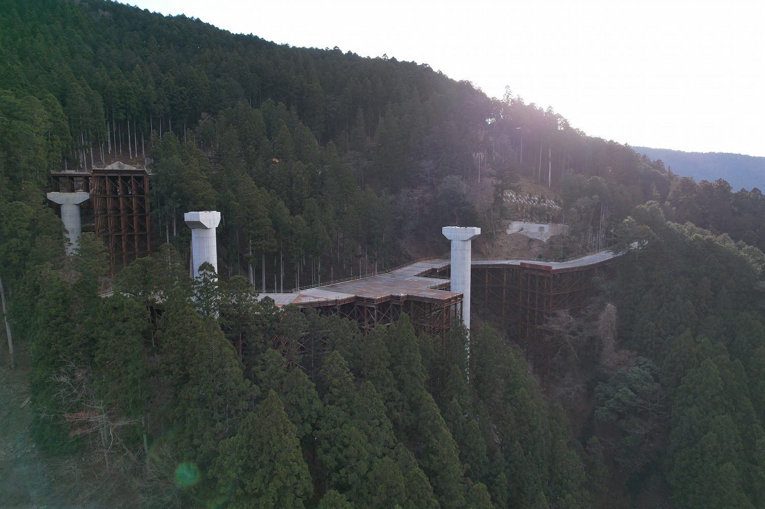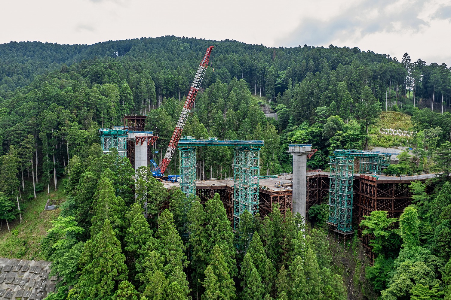 谷間に架かる橋梁のため、橋脚高も高い。最大のP1で53mに達する。そのためベント高も高く、最高地点で43mの高さに設置し、仮桟橋(エムオーテック)を構築していた。上部工にとって幸いなことに仮桟橋は下部工施工時に建設されており、上部工としては新たに仮桟橋をつくる必要はなかった。