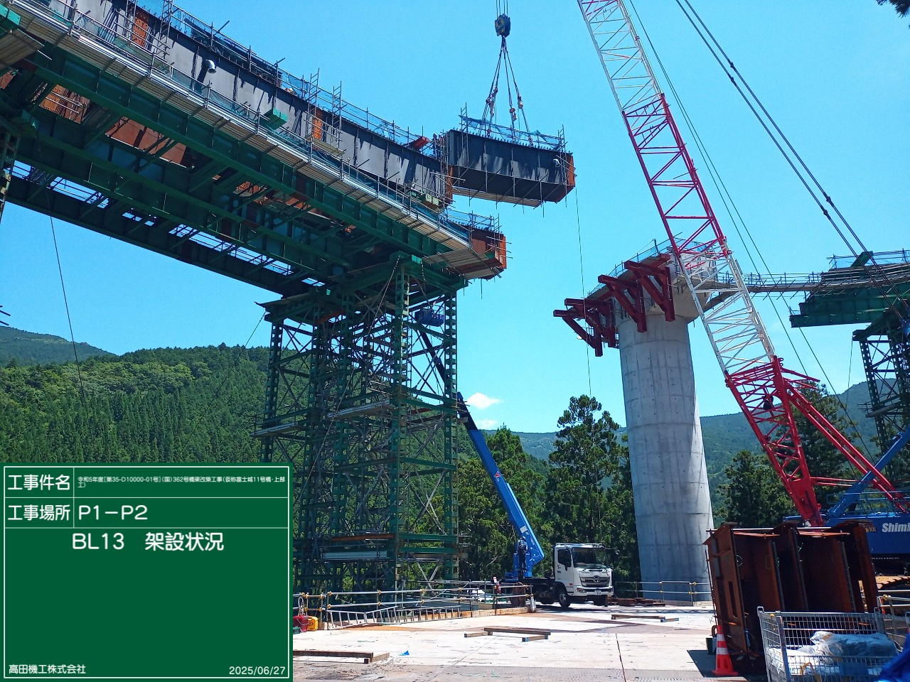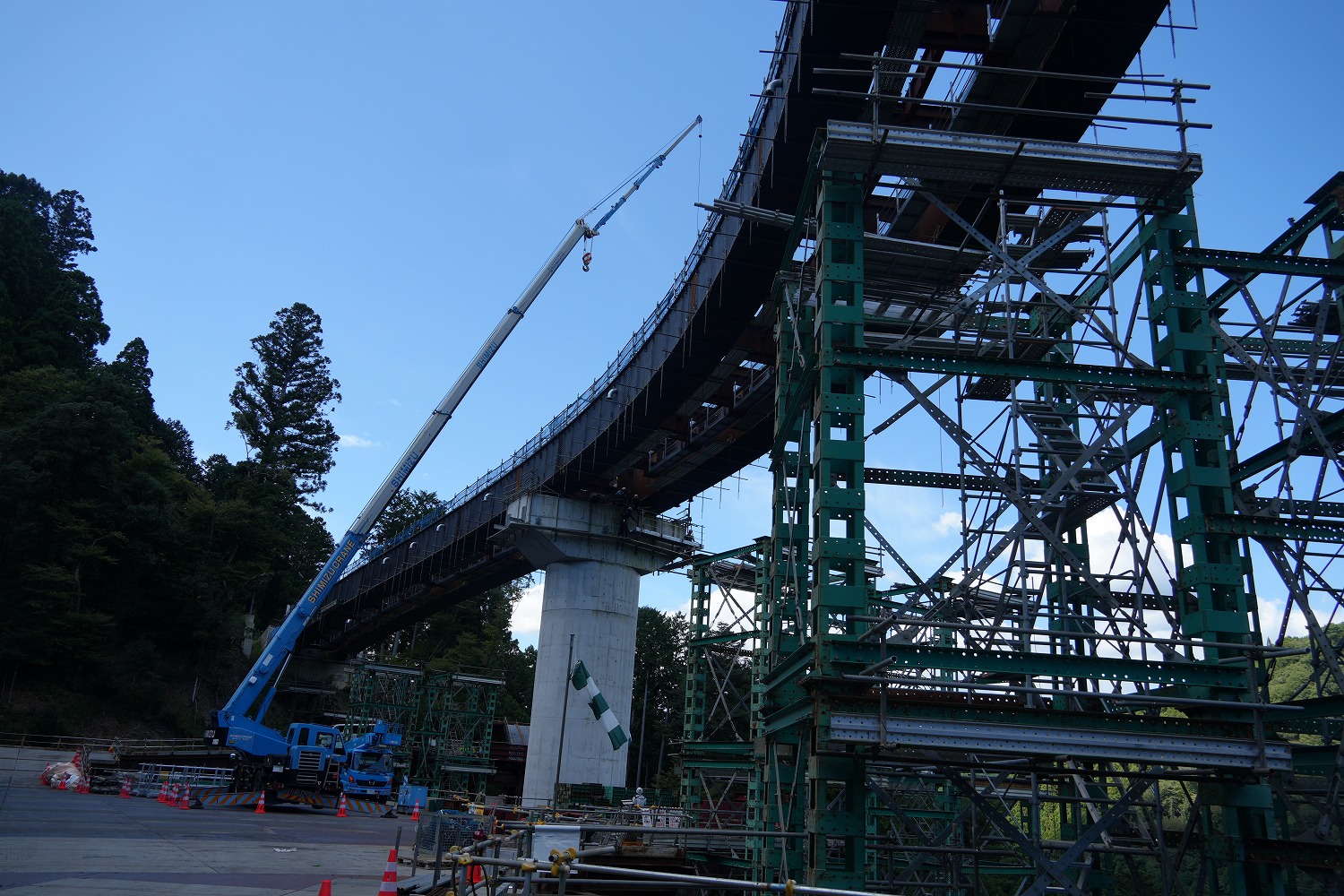 そのため、架設に当たっては、事前に橋脚上にサンドル代わりのH鋼を配置し、桁を30mm高めに設置して支承をつり上げ、下沓を橋脚に接地させず、浮かせた状態にすることで、支承に温度変化などによる水平力がかからない状態で仮架設した。すべての桁を30mm高く架設し、全体の桁添接を終えて閉合した後に、桁を全て一体化し、桁の位置調整を行って支承位置が設計通りになった時点で桁をジャッキダウンして降ろした。