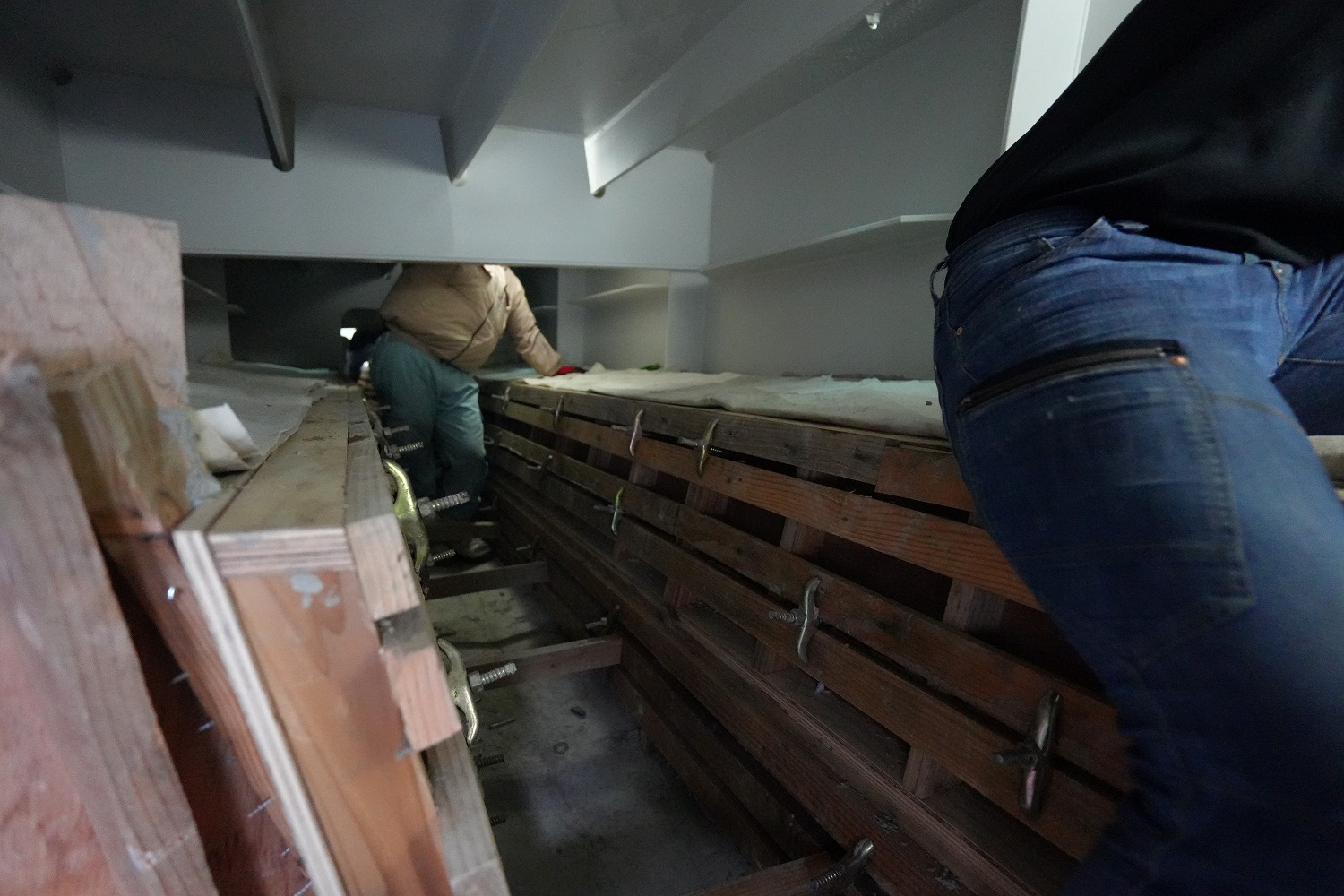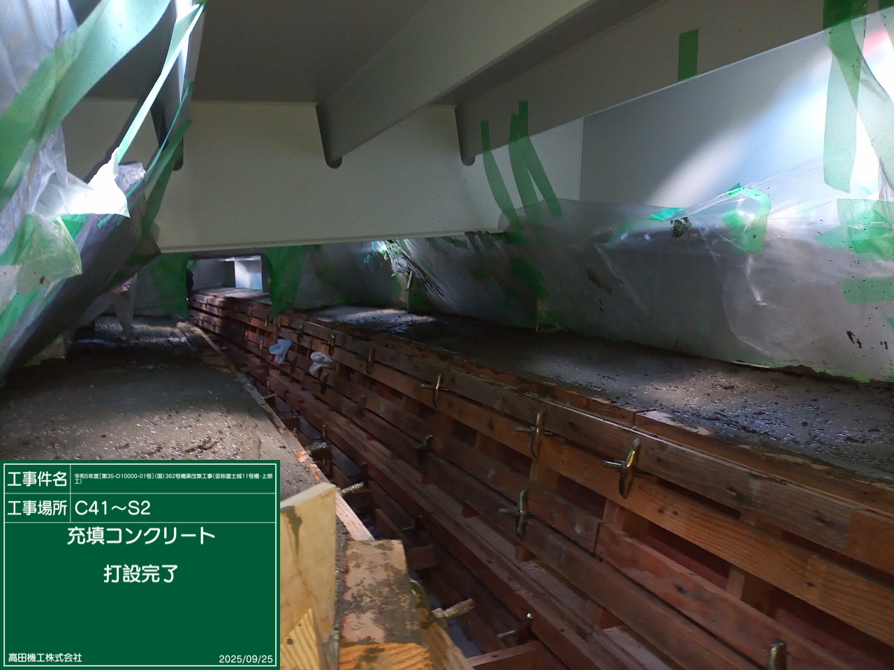 ジャッキダウンに際しては、「支点の高さ調整を行うにあたり、一度ジャッキダウンし、支承を接地させて高さ計測をする必要があるが、接地させている時間が長いと、桁の温度変化による水平力がかかってしまう。ジャッキダウンし計測をしたのち、すぐさまジャッキアップし支承を再度浮き上がらせて、元の状態に戻した。計測データから全支点の高さ調整量を決定して、後日再度ジャッキダウンしてすぐさま沓座モルタルを打設し、支承を固めた。その結果非常にうまくいった」(元請の髙田機工)ということだ。