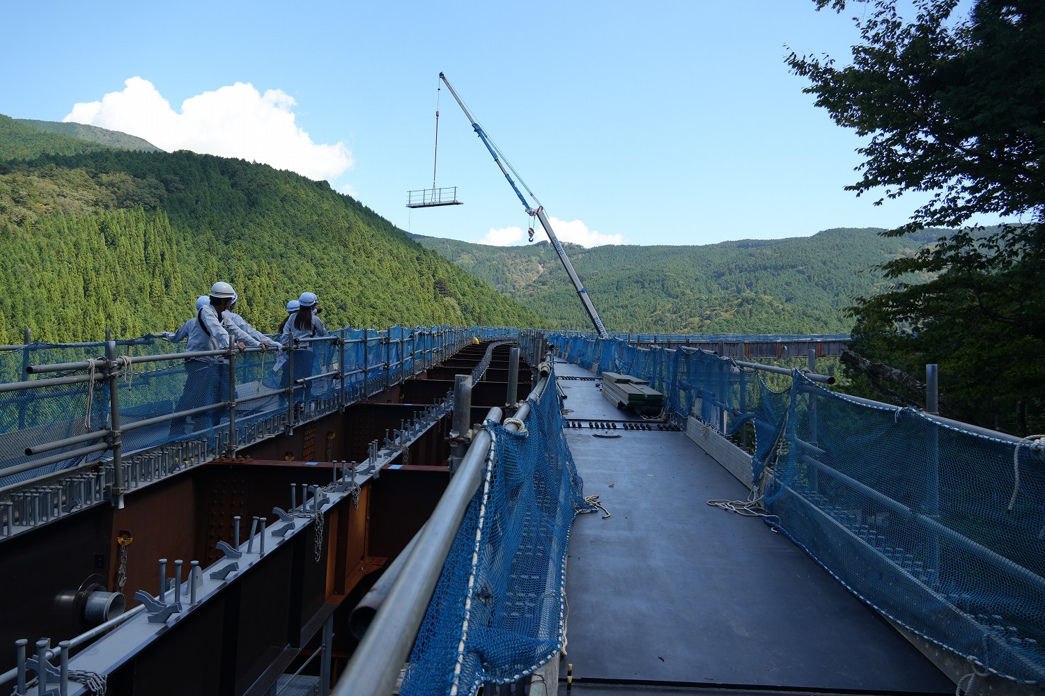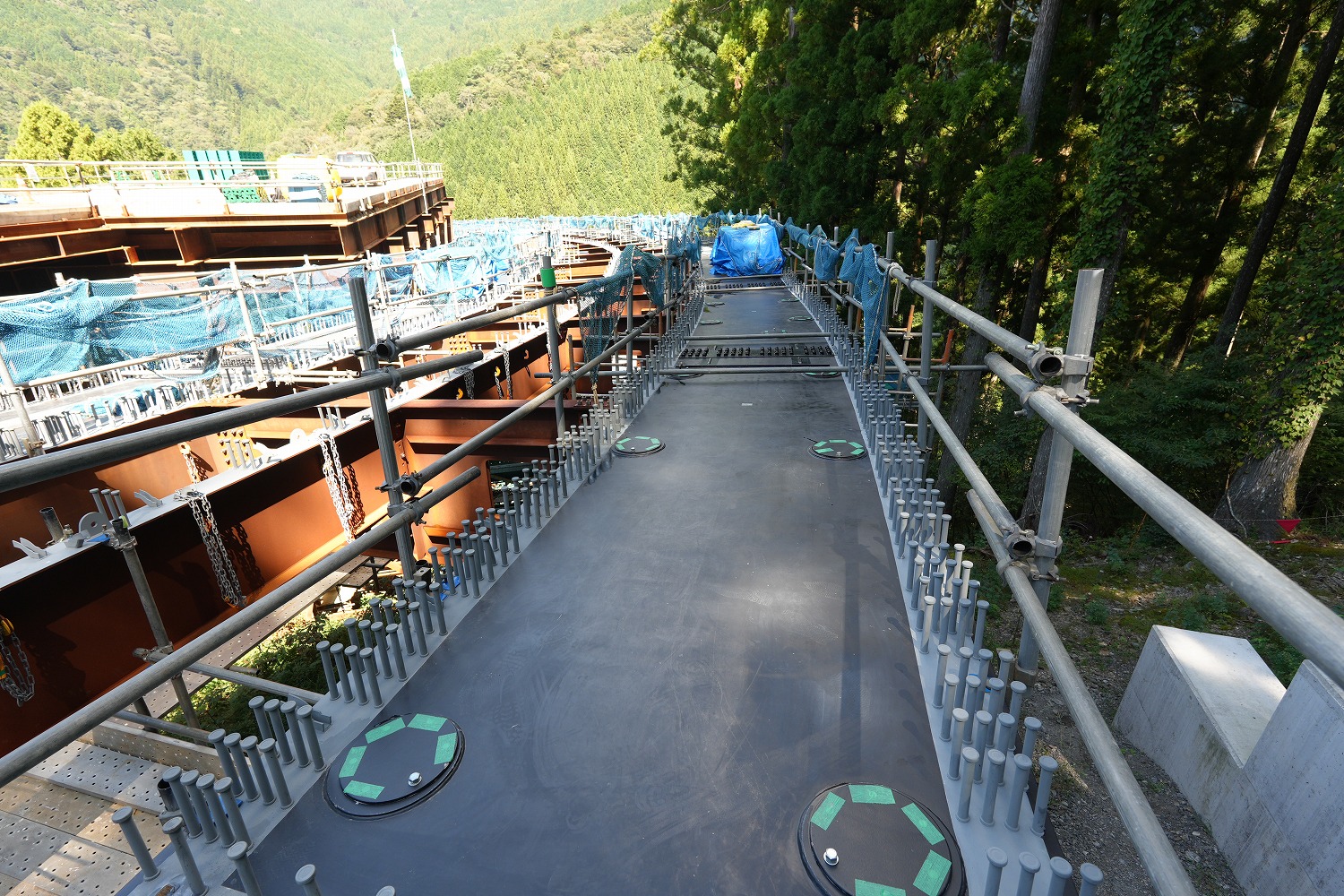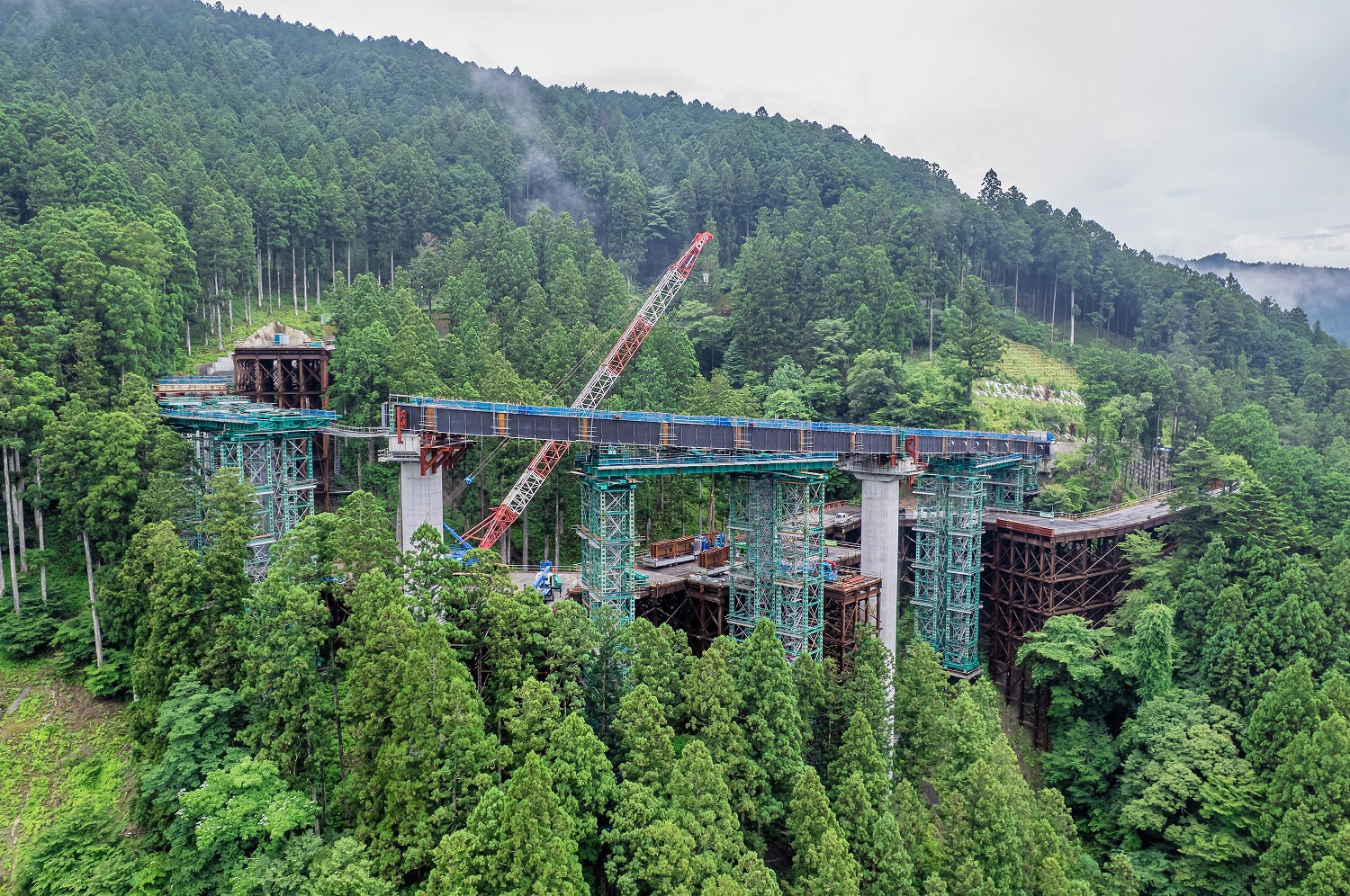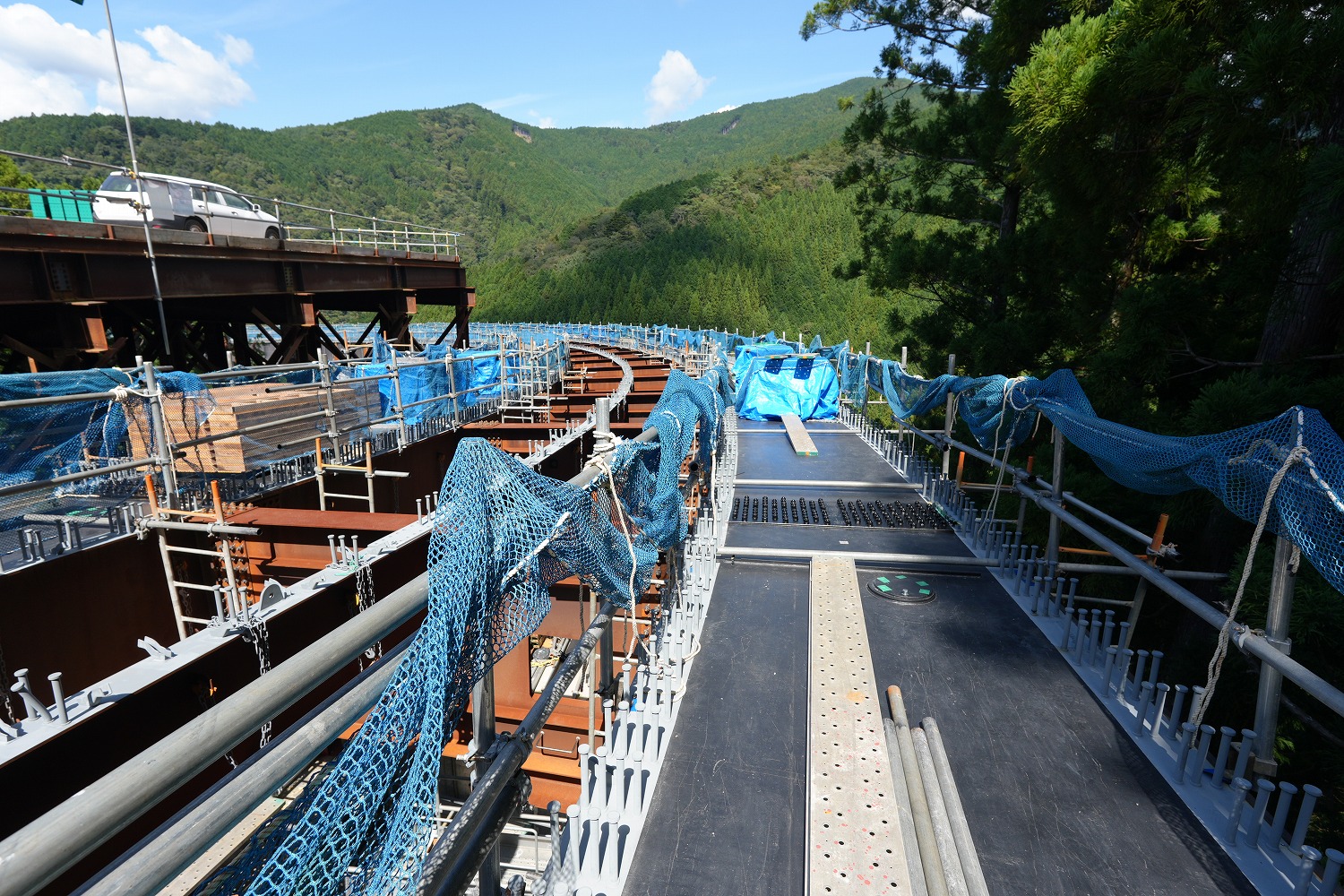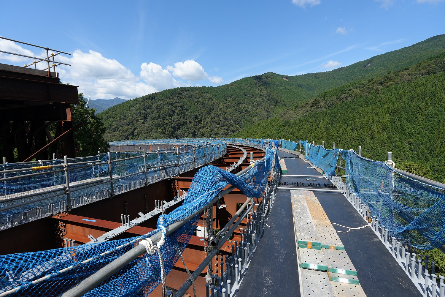 静岡県が事業を進めている国道362号本川根~静岡バイパスの中山間地(榛原郡川根本町富士城地内)に建設中の日掛大橋(仮称富士城11号橋)は、橋長219.0m、最大総幅員9.896m、鋼重784tの鋼4径間連続曲線箱桁橋で、最小曲線半径が60m、最大縦断勾配7.5%という特徴を有する橋梁である。また、床版厚にも特徴があり、A1~P2・P3間の途中までは190mm、P2・P3間の途中からA2までは540mmという厚さになっている。現在は桁架設を終えた段階でこれから床版工の施工に入ってくる状況である。その現場をお届けする。(井手迫瑞樹)