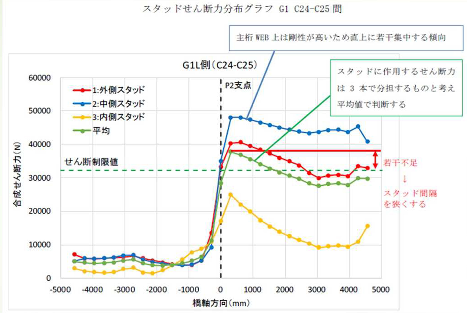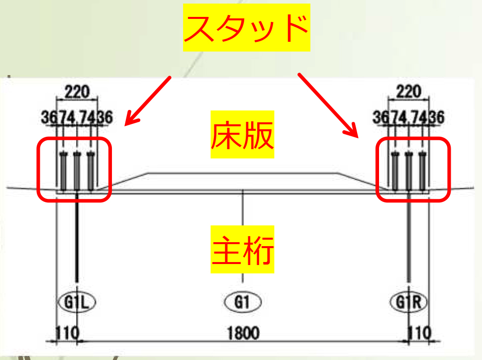 さて、床版厚を厚くし、桁が下に逃げる構造とし、負反力を抑えられる反面、その力は桁と打設するRC床版に剥がれる力が懸かるということになる。そのため、スタッドのピッチを220mmと通常よりも100mm程度短くしている。