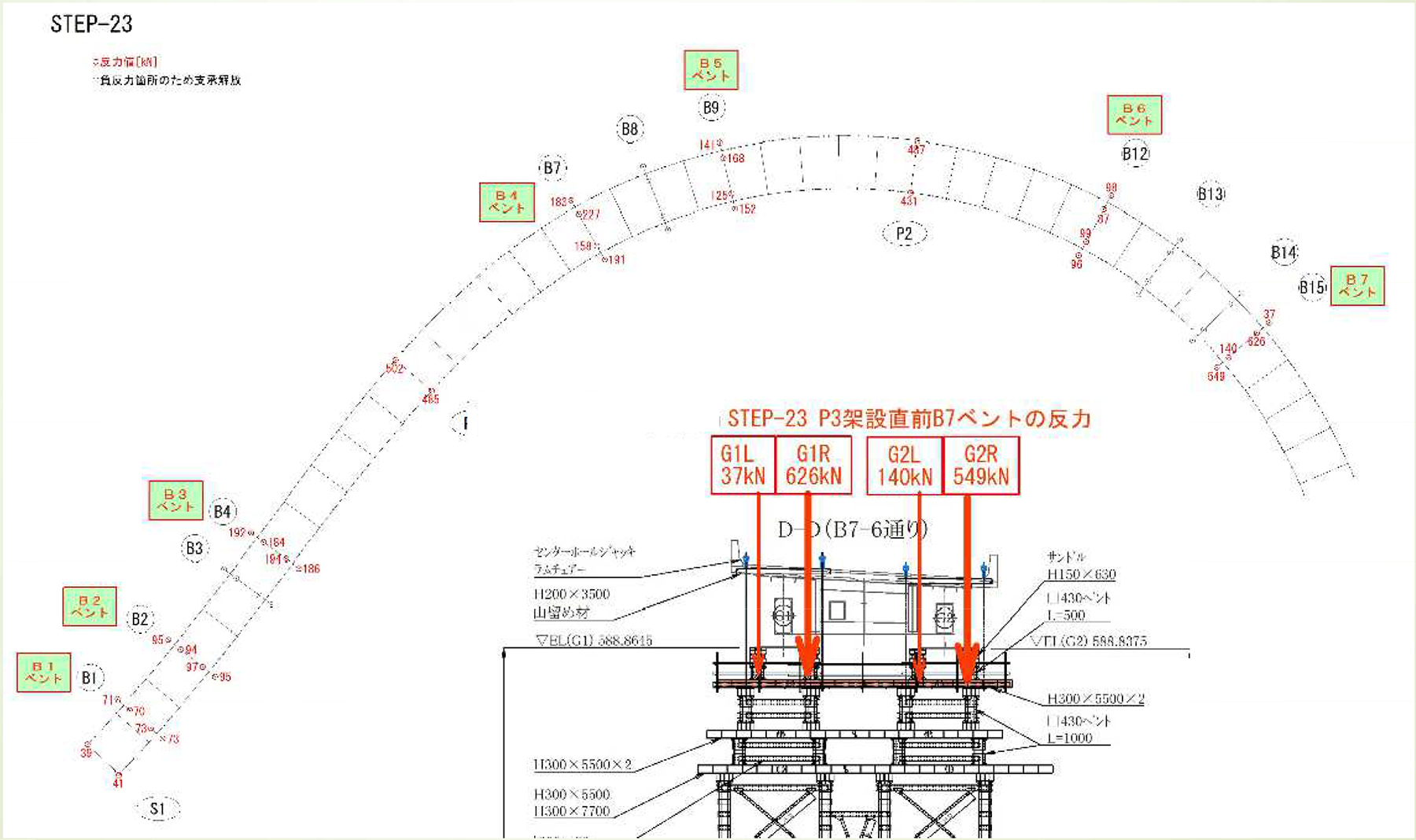 架設はまずベントを必要に応じて合計8基つくるところから始めた。さらに単材架設をするために、桁を支える架設桁をベントの上に架けた上で本桁を架設した。曲線に対応するため、架設桁の位置を微調整し、本設桁の重心から離れないように腐心した。また、ピアの根元には斜ベントを配置して架設を行った。当初案では張り出し架設を28ブロック中16ブロックで多用する架設計画となっていたが、曲線のため、張出架設が最小限になるように架設桁や斜ベントを用いた。また、平面線形の影響で不均等荷重や負反力が生じる恐れがあるため、それを回避すべく、ベントや支点上でステップ解析を行い、架設時に事故が起こらないよう細心の注意を図っている。