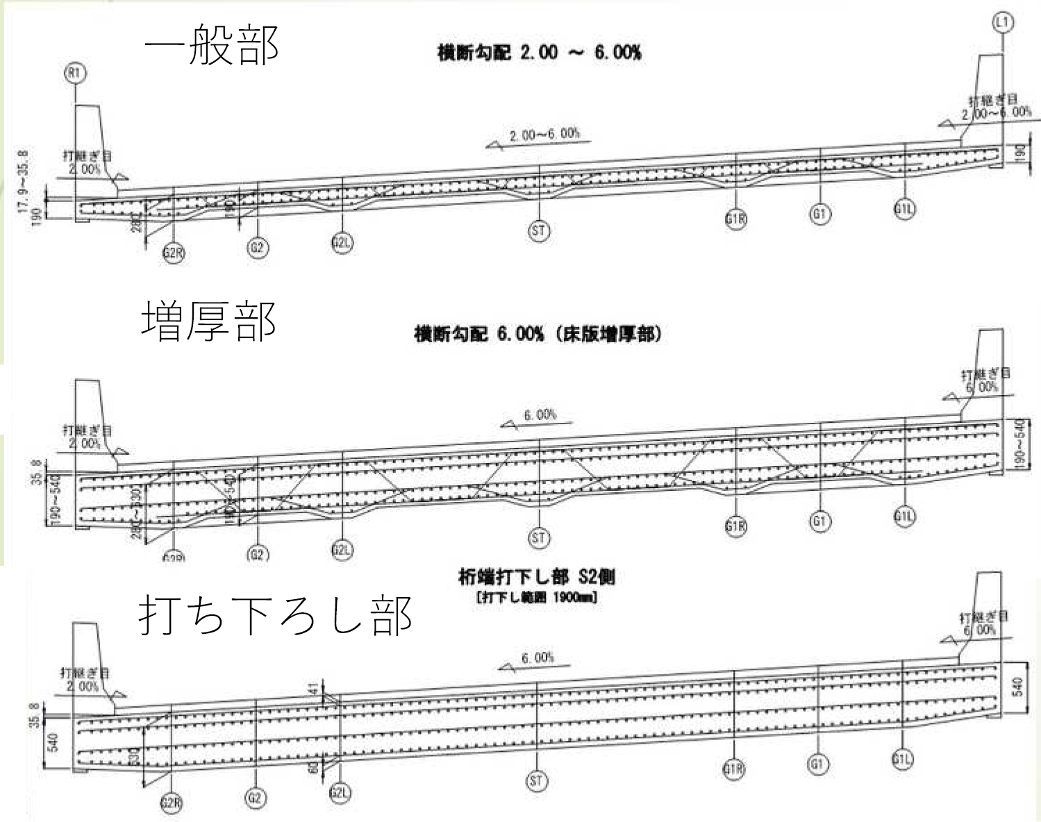 線形の変化に伴い、床版厚も鉄筋段数も変わる、最大厚は540mmに達する