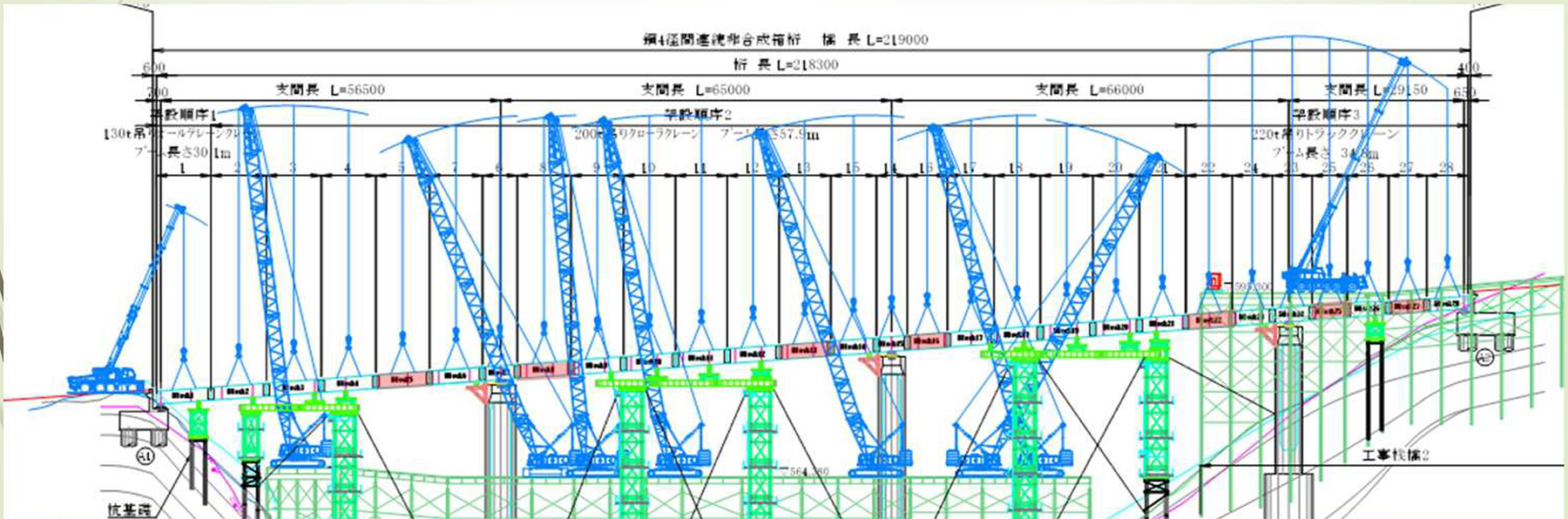 さて、上部工の施工である。径間長はA1側から56.5m、65m、66m、29.15mとなっており、P3-A2間のみ著しい不等径間となっている。これがのちに大きく効いてくる。