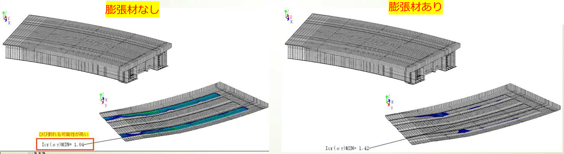 膨張剤の有無で温度ひび割れの範囲がかなり変わる