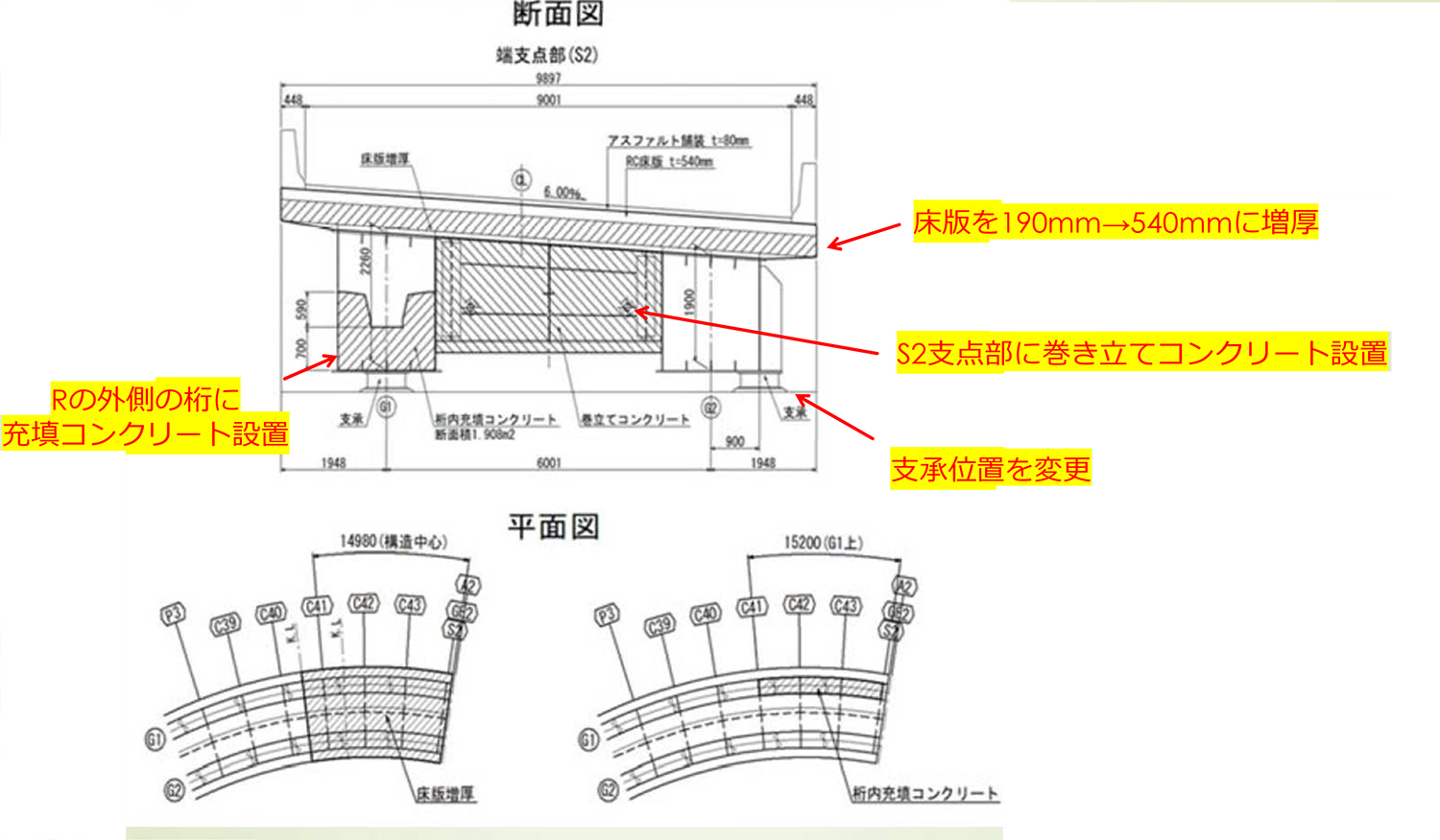 その一部が冒頭に記した540mmという通常は必要ない床版厚である。さらにこの床版厚だけでは負反力を抑え込めないことが明らかであるため、A2側(端部から15mまで)のG1桁箱桁内にさらに充填コンクリートを打設し、負反力を抑え込む手法を採用した。箱桁内部に打設するコンクリートは下部の800mmは全幅(1,800mm)で充填する一方、その上面の750mmは中央部の600mmを開ける形で両側に打設し、メンテナンス時の通路を確保している。また、P3-A2間の桁高は横断勾配に合わせてG1側(外側)を2,610mm、G2側を2,250mmとし、G1側を高くし、路面の水平性を確保している。また、A2側支承は、よりG2の外側に反力がかかることを解析し、支承位置を外側にずらした。