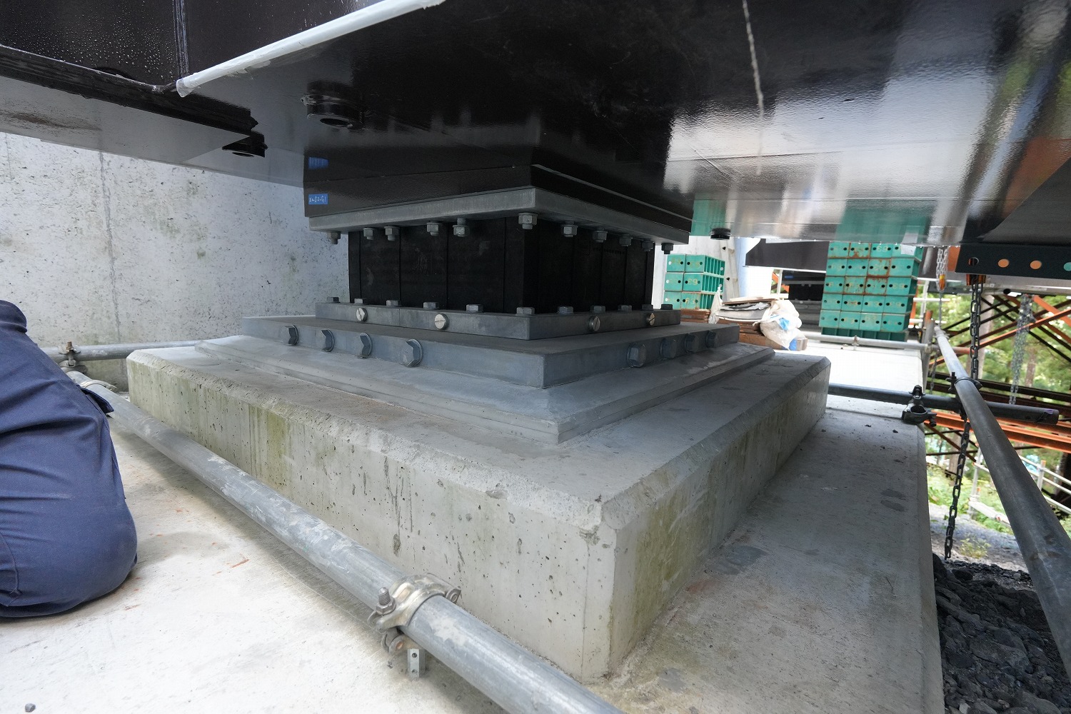さらに地滑り地帯に近い箇所で橋を建設していることを念頭に入れ、地震が起きた時に支承に残留変位が生じた際、支承を取り外して、変位を戻して再設置できる構造としている。具体的にはベースプレートを2段重ねにして、変位が生じた場合は1段取り外し、クリアランスを持たせて支承位置を調整することで、支承に生じた変位を解消するものだ。反力をどこで取るかという課題はあるが、メンテナンスを考えた仕掛けを作っている。