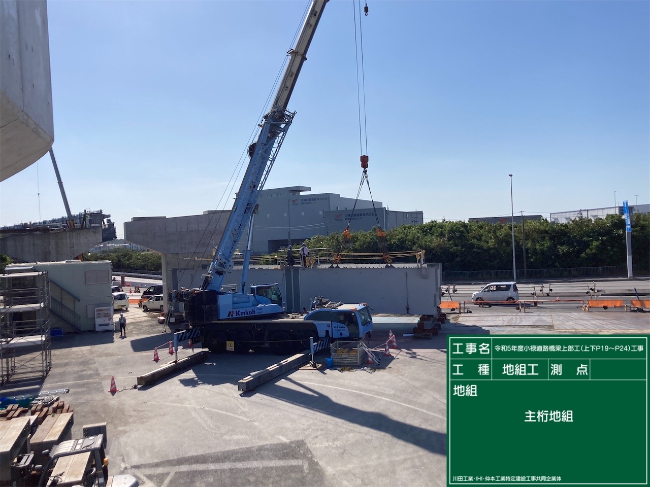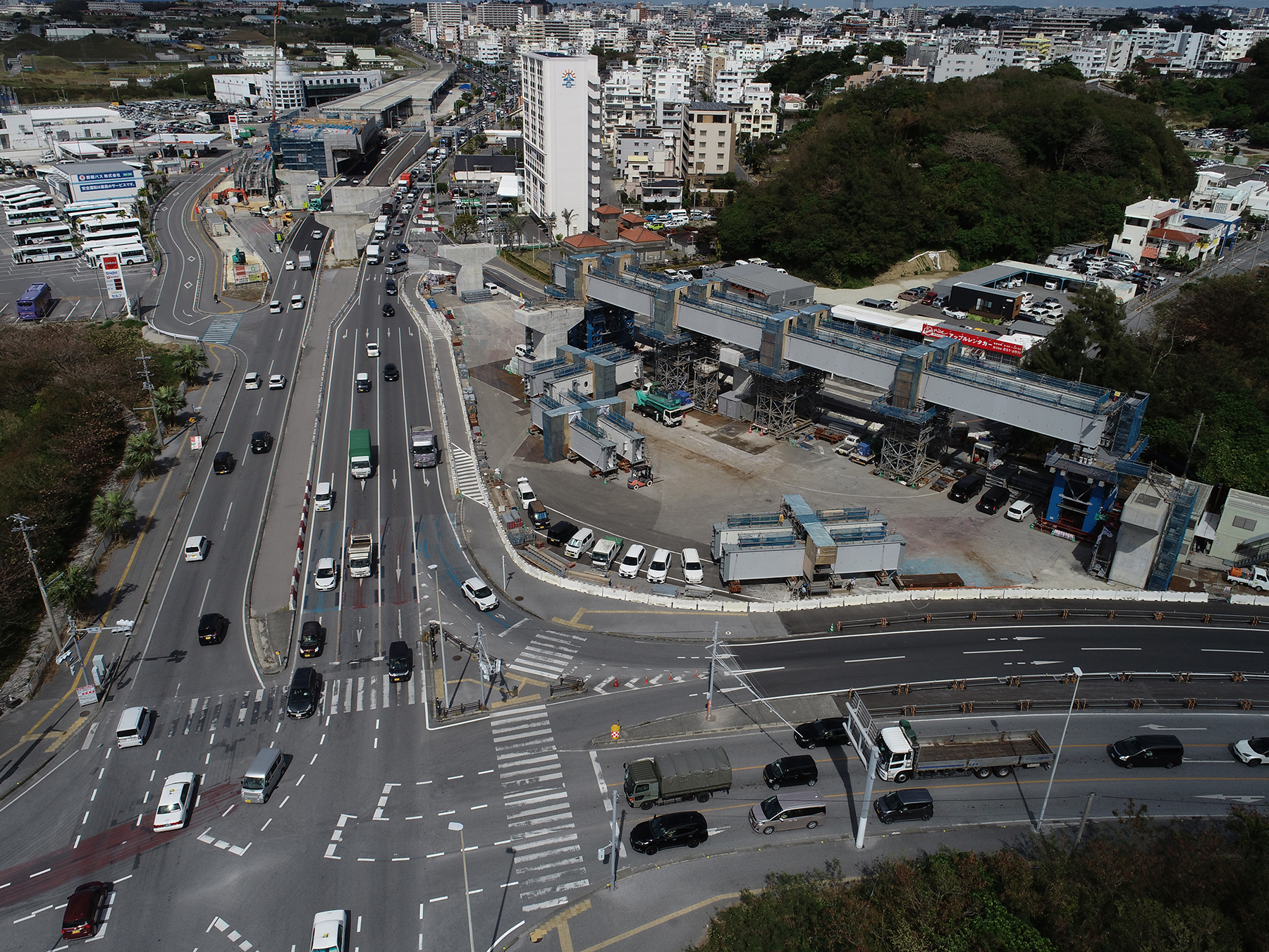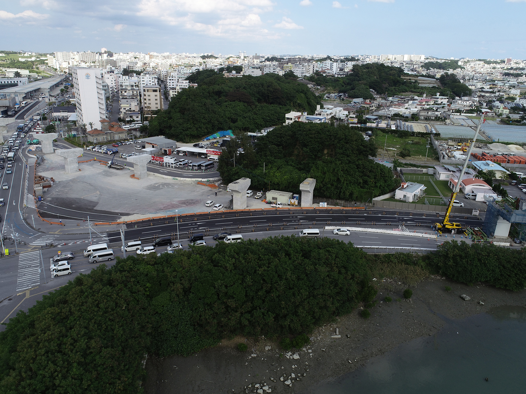 南部国道事務所 小禄道路の上下線P19~P24間の上部工架設工事が最盛期
