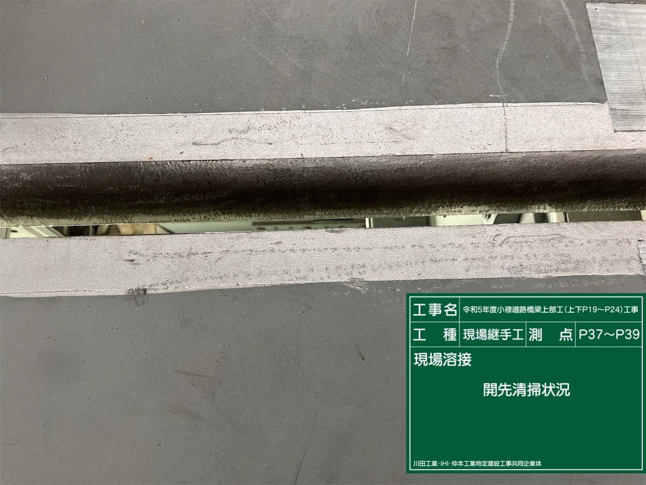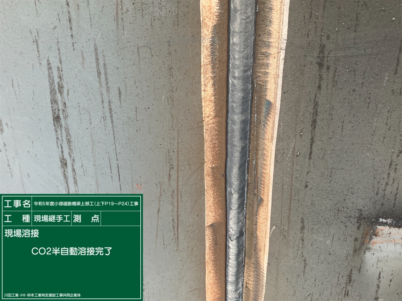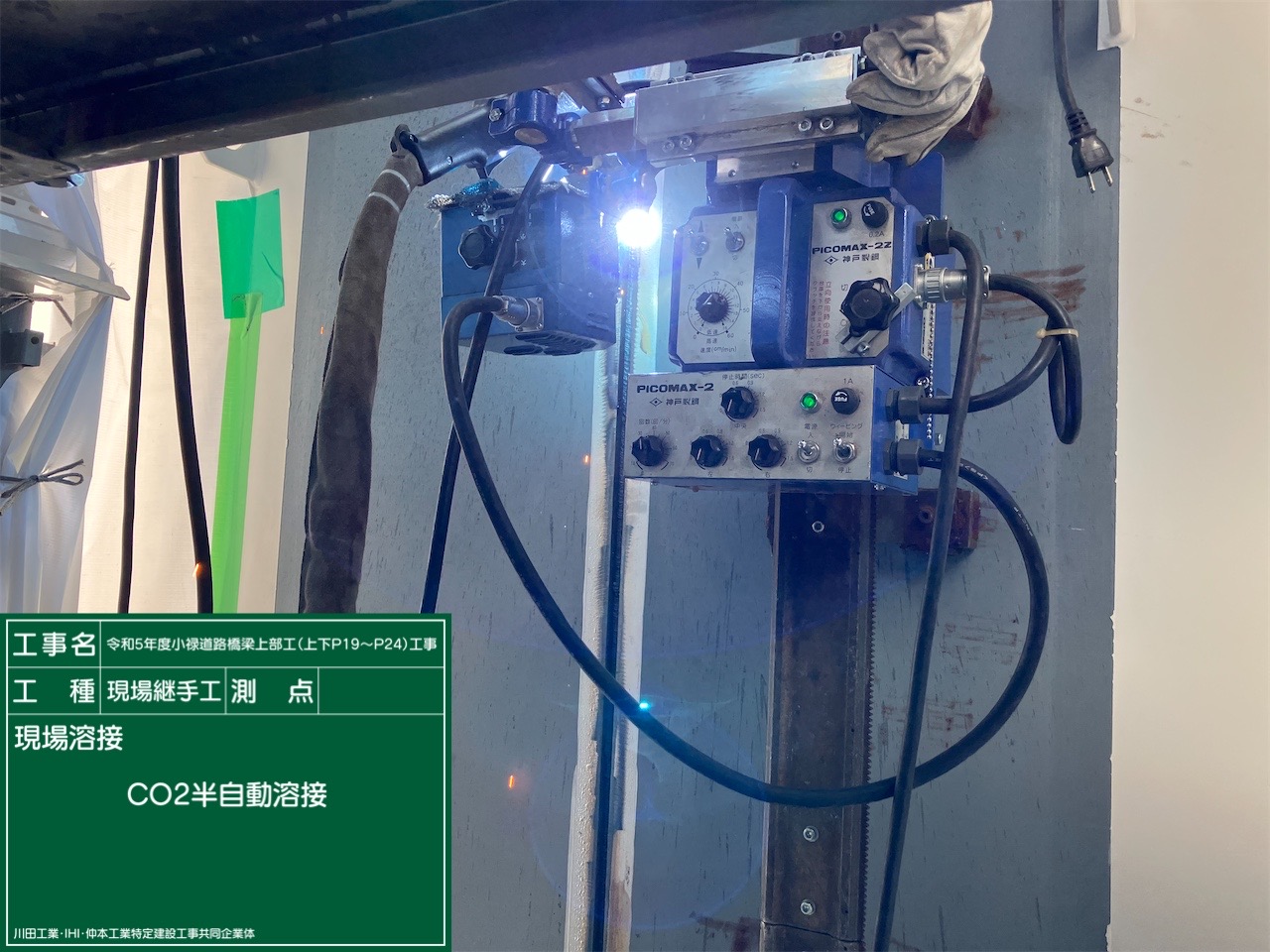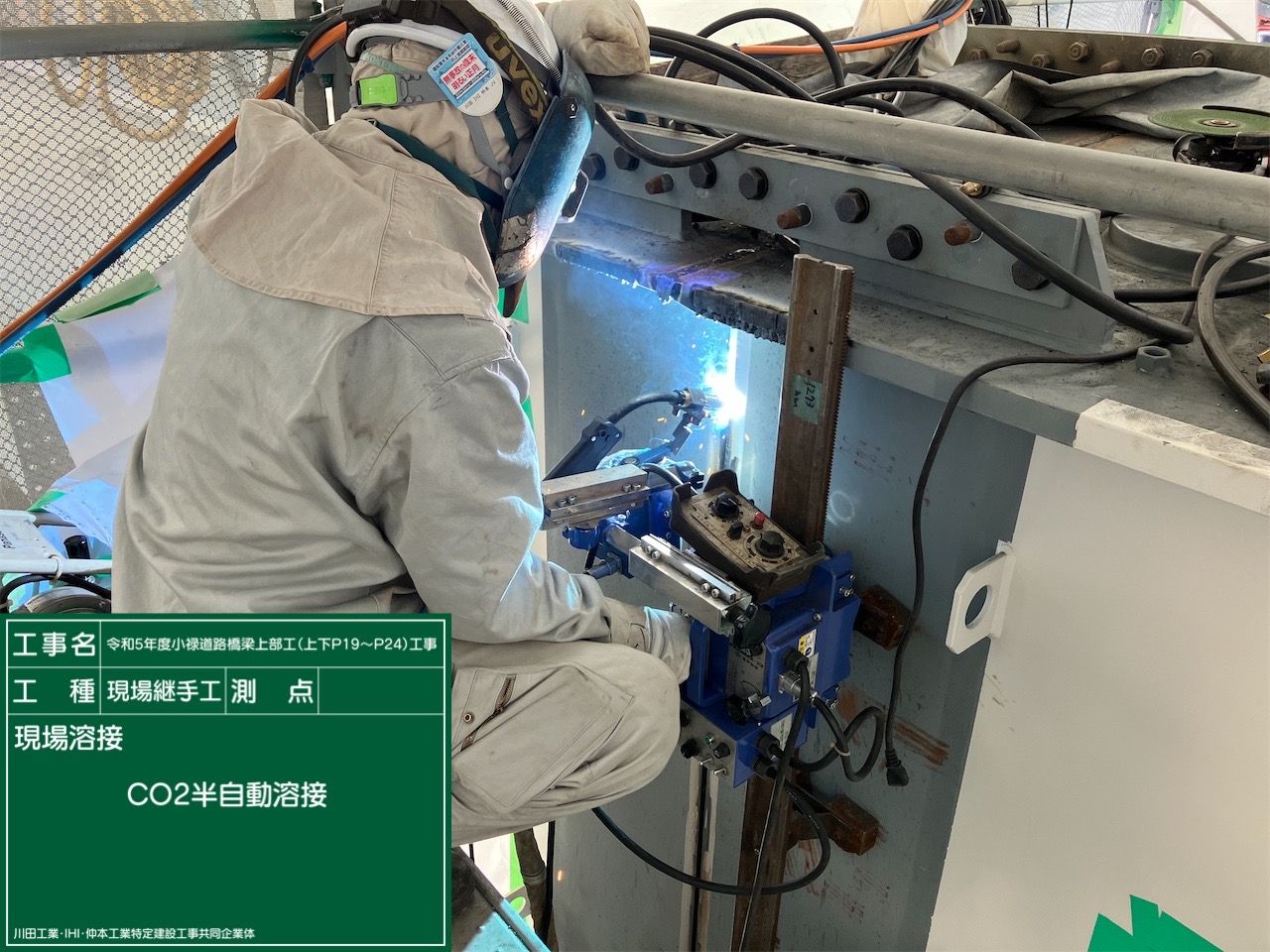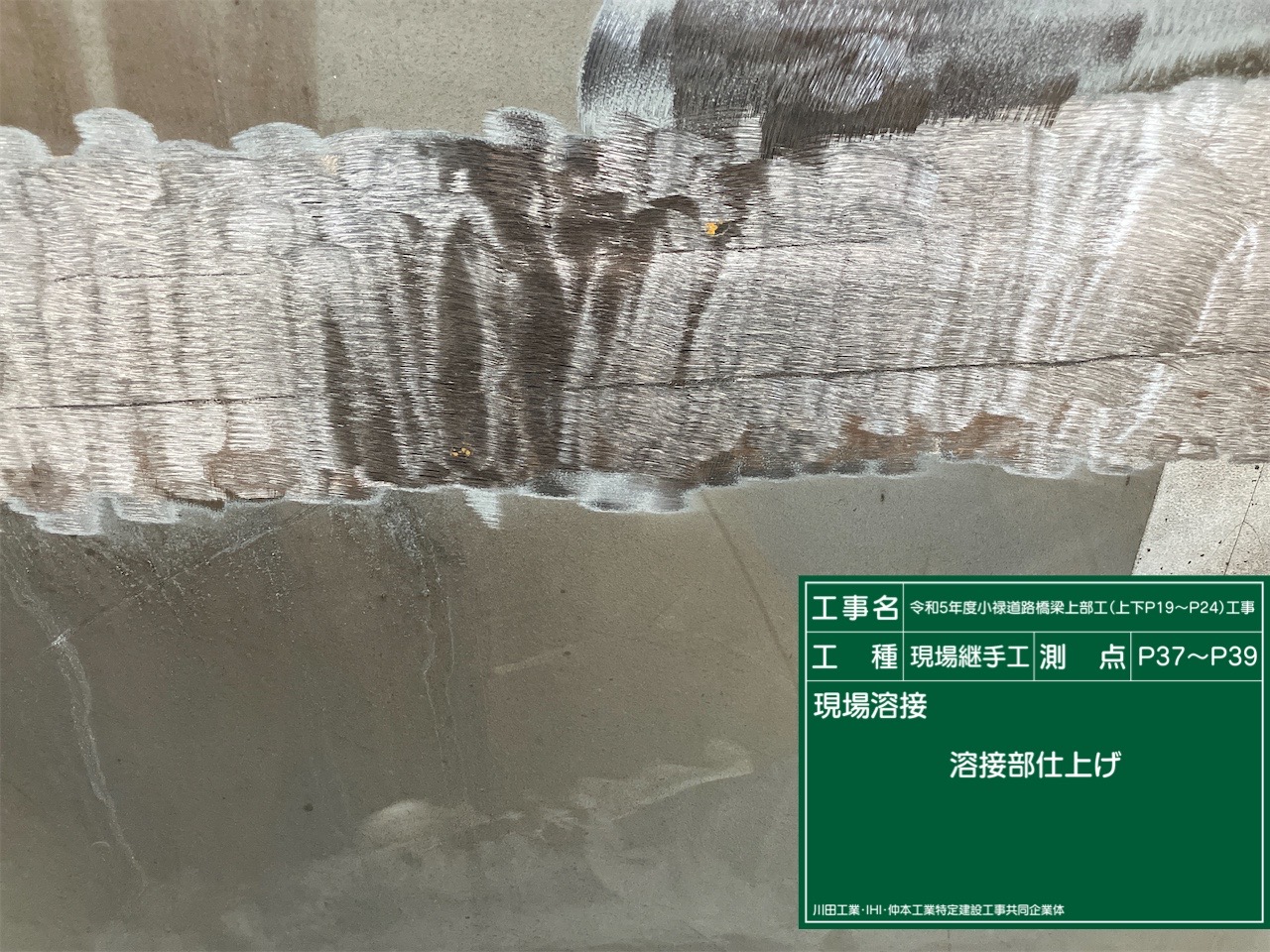 現場到達後は、テーブルリフトを約500mmジャッキダウンし、桁を支承上に架設した。ただ、架設は溶接線をかわす形で仮の位置に置いている。そして、大ブロック同士のつなぎ目を現場地組時と同様に風防設備を構築し、溶接、ブラスト、防食を施工した。溶接線をかわす形で仮の位置に架設したのは、「モーメント連結を考えた支口高さに合わせて溶接を行う必要があるのと、最終架設の溶接収縮を考慮して桁全体の位置を調整する必要があった」(同)ためである。最終的には全桁の架設完了後に50mmほどのセットフォーを行い、本来の支承位置に桁を設置して完成となるよう計画している。