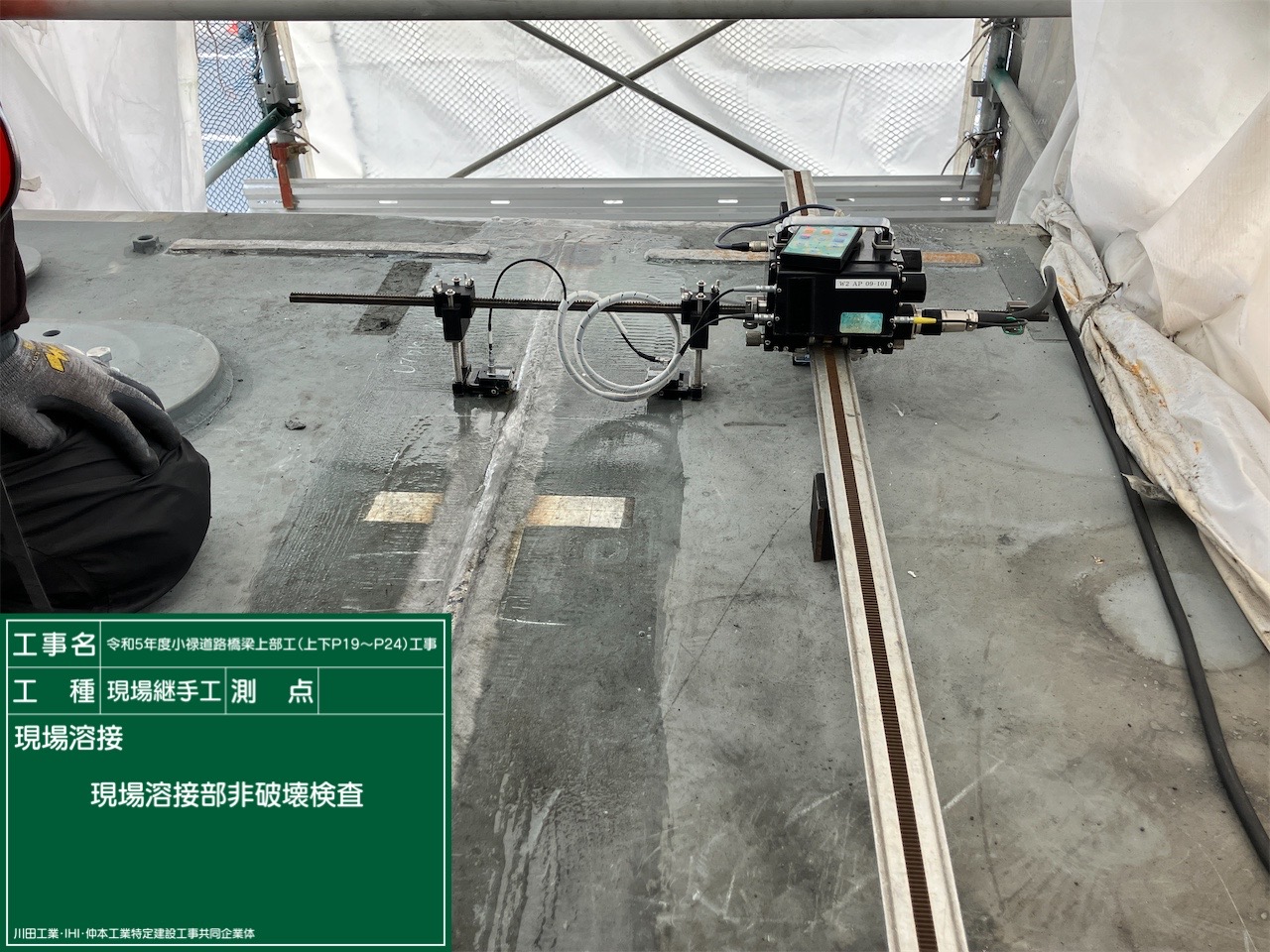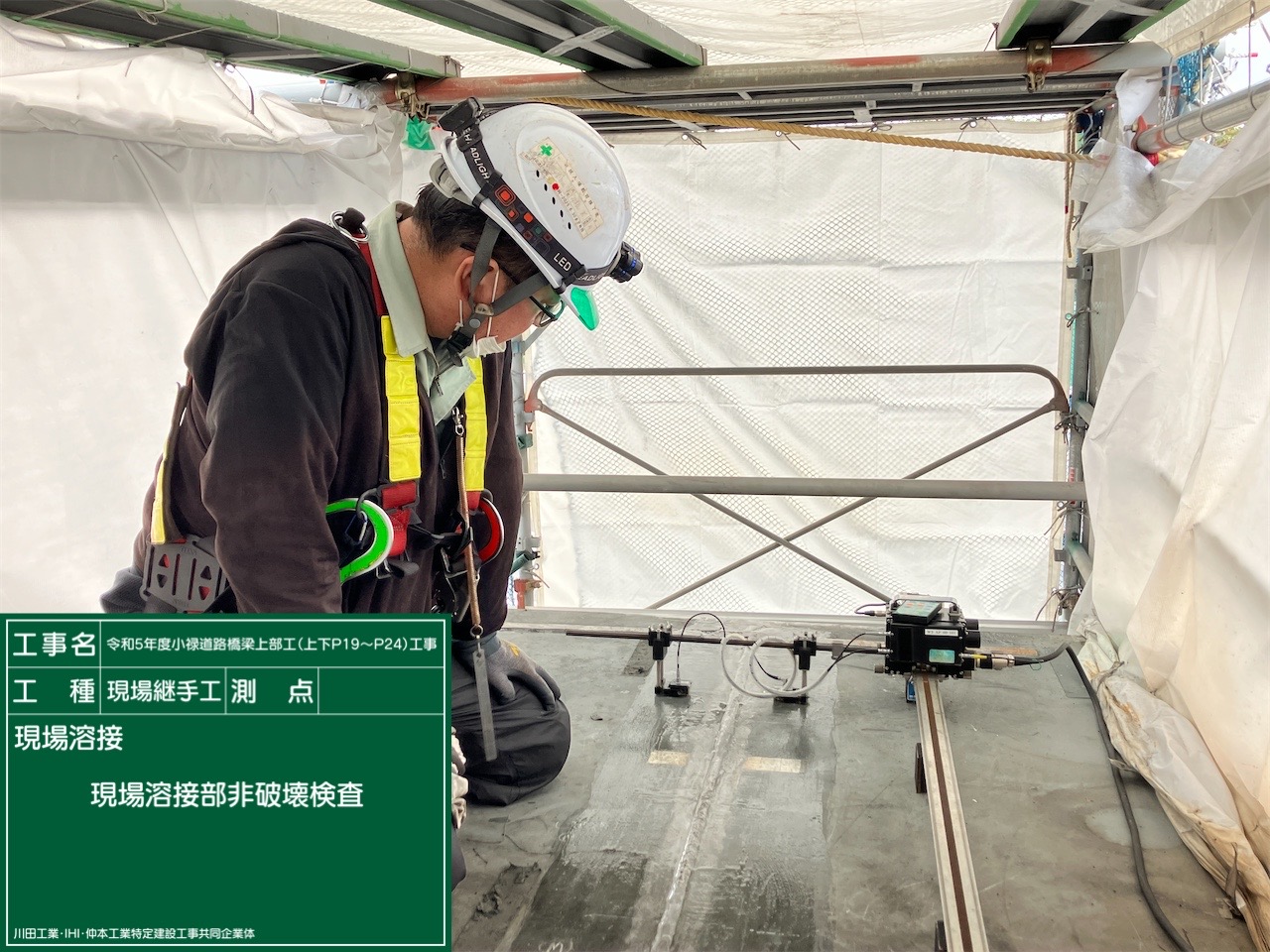 鋼製橋脚の溶接③ AUTによる非破壊検査を行い、品質を確認した。