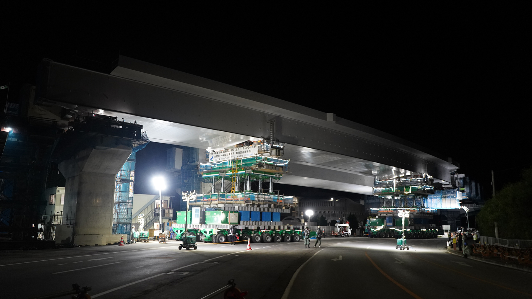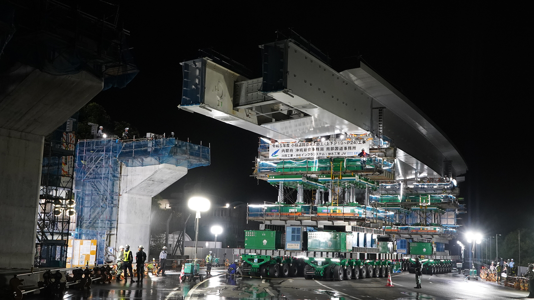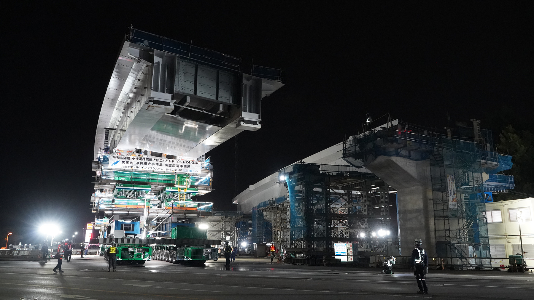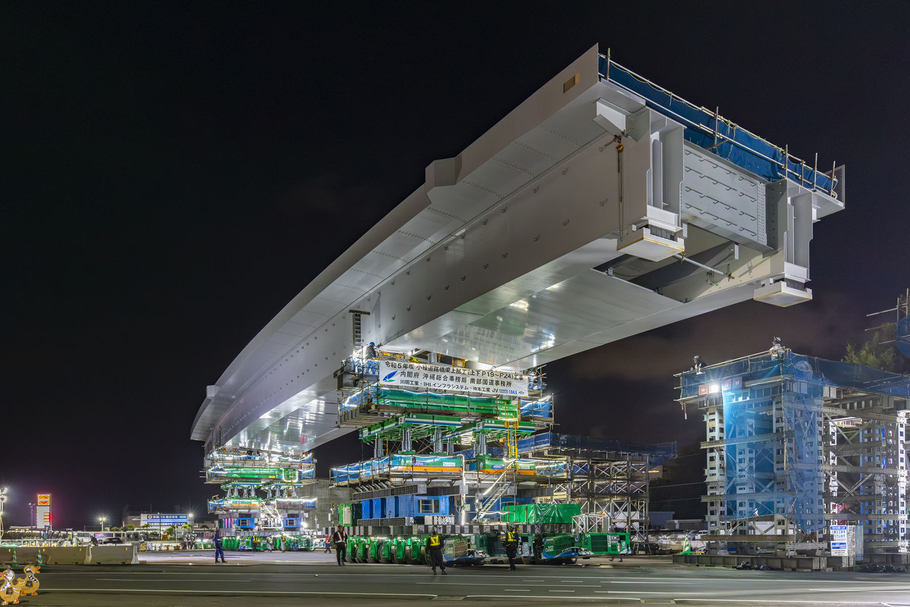 内閣府沖縄総合事務局南部国道事務所が建設を進めている小禄道路の上下線P19~P24間の上部工架設工事が最盛期を迎えている。同橋は、国道331号瀬長交差点~豊見城警察署前付近に位置する箇所に建設を進めている鋼橋であり、自走多軸台車による夜間一括架設と、トラッククレーンベントによる架設を併用しており、全部で10回の架設のうち、6回を自走多軸台車、4回をトラッククレーンベントにより架設する。自走多軸台車による架設の際は現道の国道331号の瀬長~豊見城警察署前の交差点間を夜間全面通行止めして架設する必要がある。既に7月11日には45m(約240t)、18日には75m(約400t)の桁を自走多軸台車で運び、橋脚上に架設した。3~5回目は来年2~3月に、6回目の架設は同8月に行う予定だ。さらにトラッククレーンベントによる施工も並行して進め、2027年3月にはすべての桁架設と合成床版鋼板部分の架設を完了する予定だ。桁の製作・架設は川田工業・IHIインフラシステム・仲本工業JVが担っている。その現場を取材した。(井手迫瑞樹)