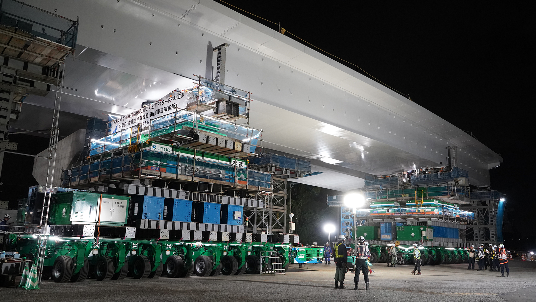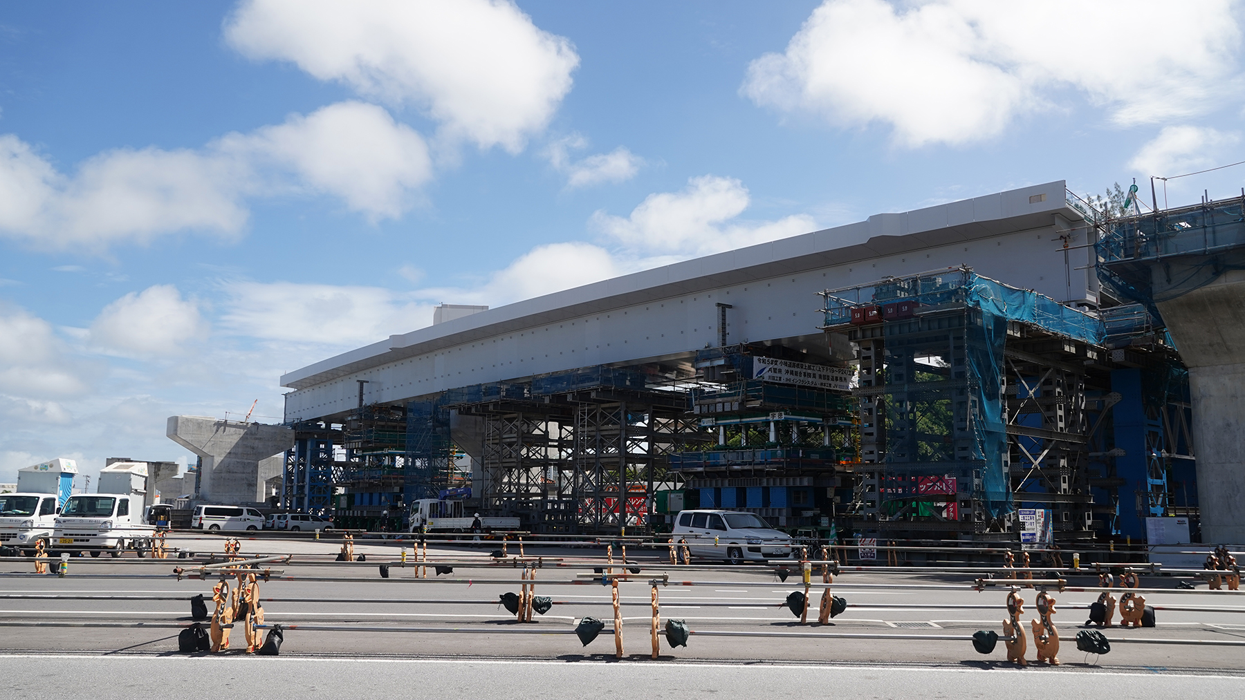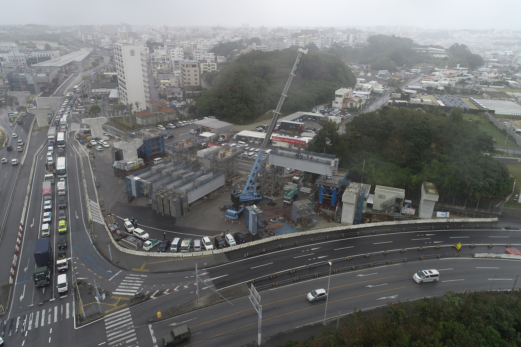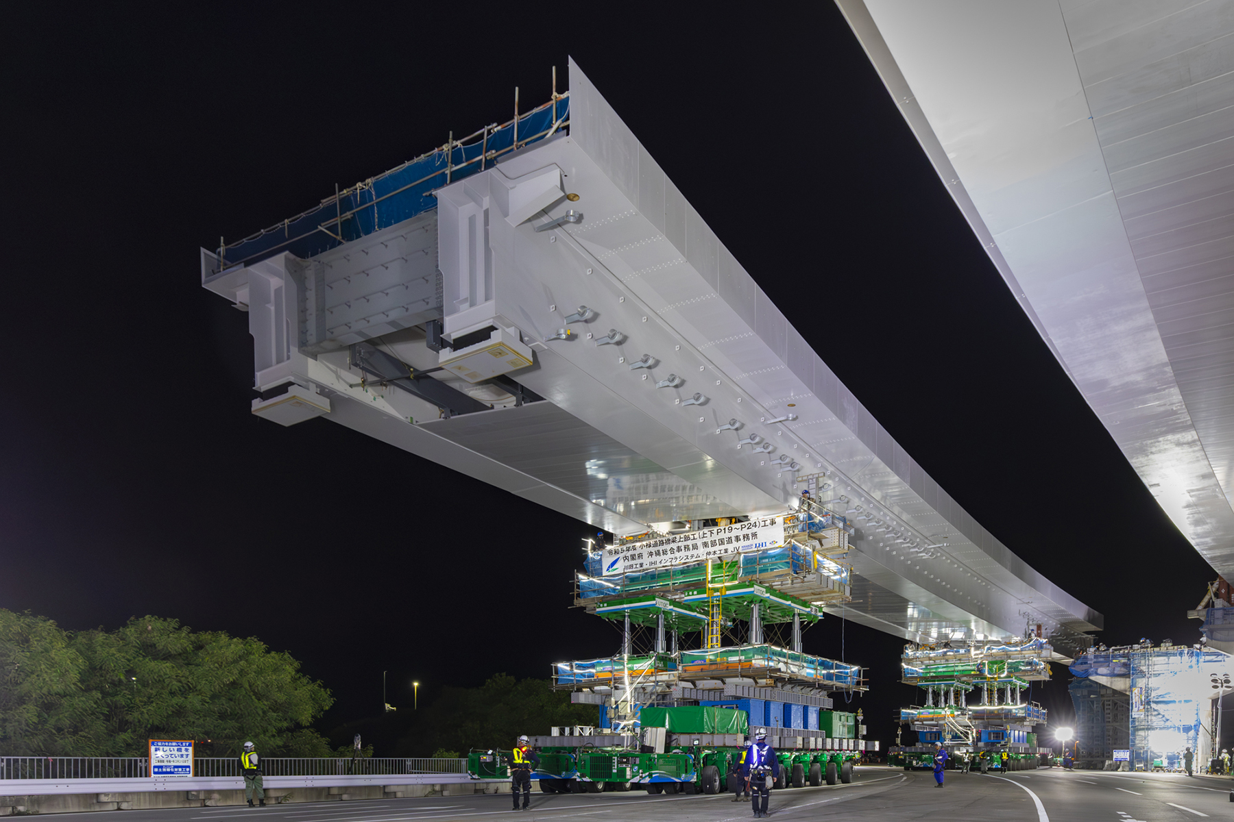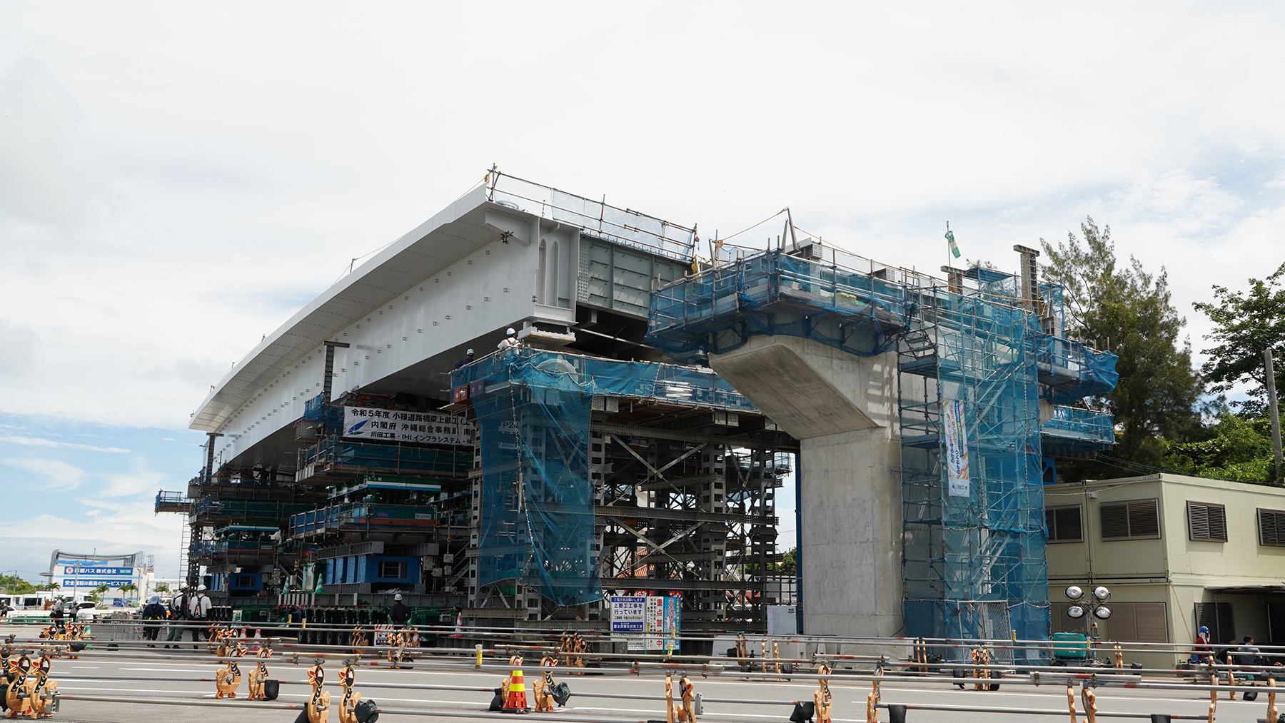 内閣府沖縄総合事務局南部国道事務所が建設を進めている小禄道路の上下線P19~P24間の上部工架設工事が最盛期を迎えている。同橋は、国道331号瀬長交差点~豊見城警察署前付近に位置する箇所に建設を進めている鋼橋であり、自走多軸台車による夜間一括架設と、トラッククレーンベントによる架設を併用しており、全部で10回の架設のうち、6回を自走多軸台車、4回をトラッククレーンベントにより架設する。自走多軸台車による架設の際は現道の国道331号の瀬長~豊見城警察署前の交差点間を夜間全面通行止めして架設する必要がある。既に7月11日には45m(約240t)、18日には75m(約400t)の桁を自走多軸台車で運び、橋脚上に架設した。3~5回目は来年2~3月に、6回目の架設は同8月に行う予定だ。さらにトラッククレーンベントによる施工も並行して進め、2027年3月にはすべての桁架設と合成床版鋼板部分の架設を完了する予定だ。桁の製作・架設は川田工業・IHIインフラシステム・仲本工業JVが担っている。その現場を取材した。(井手迫瑞樹)