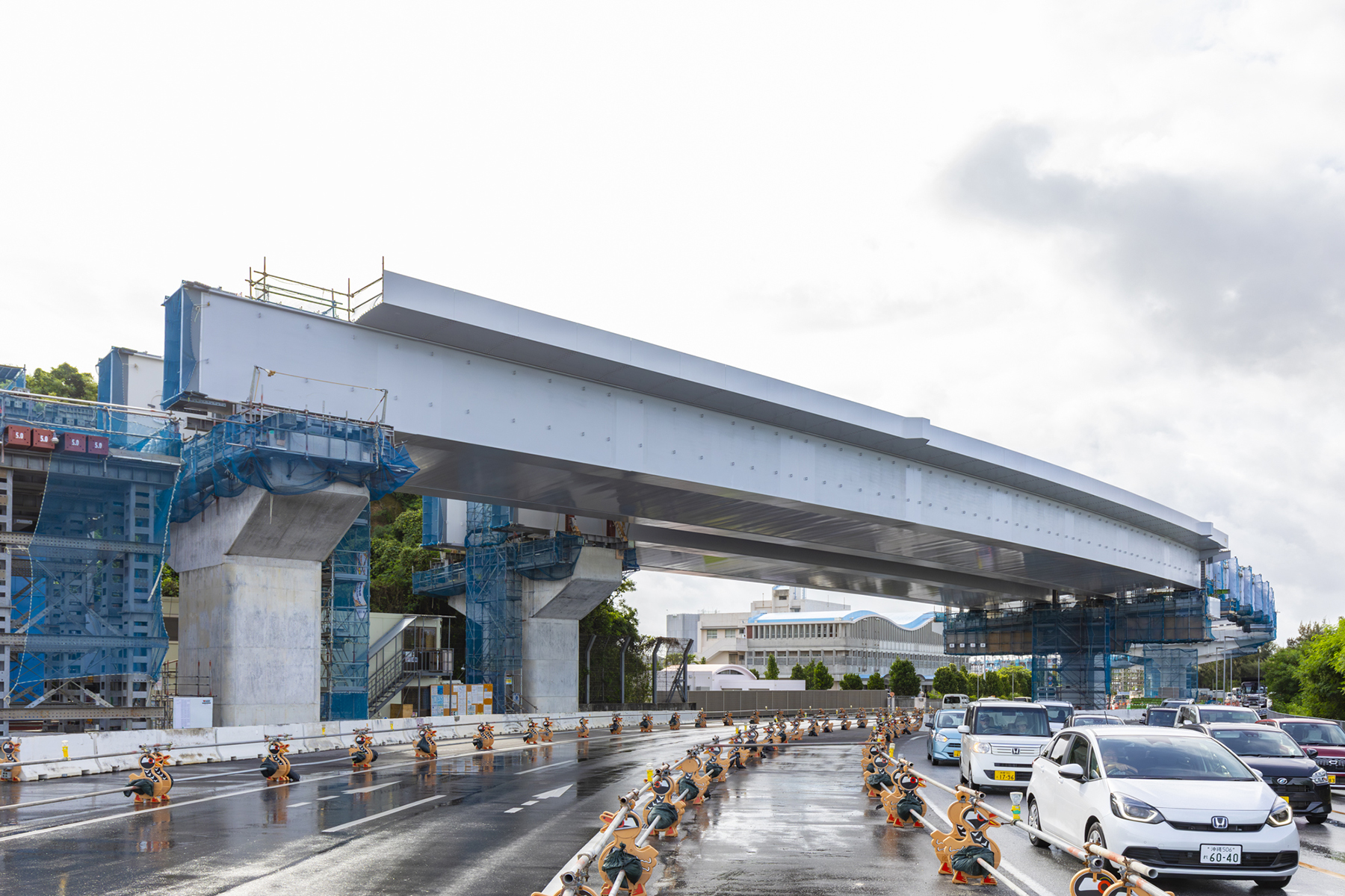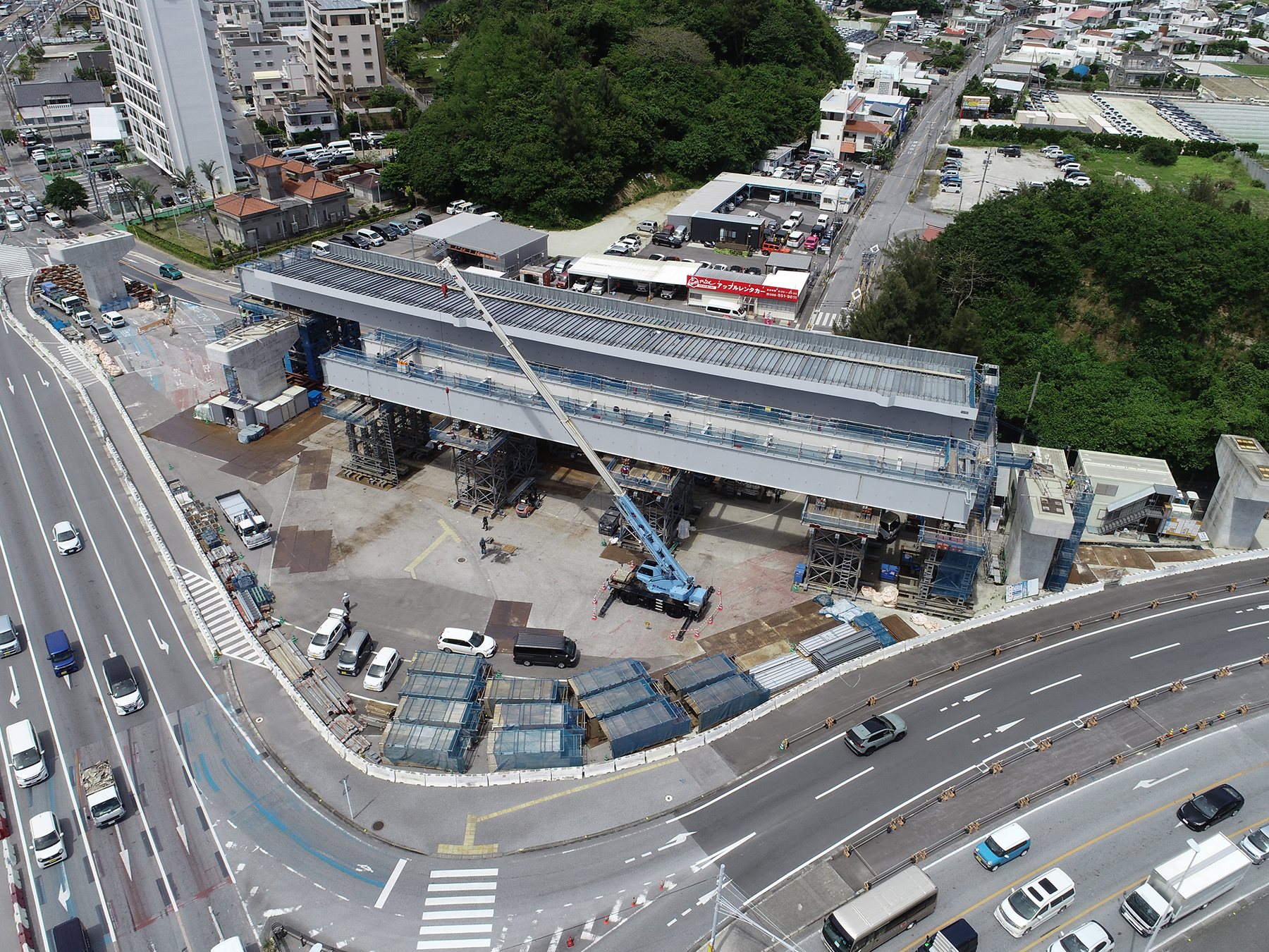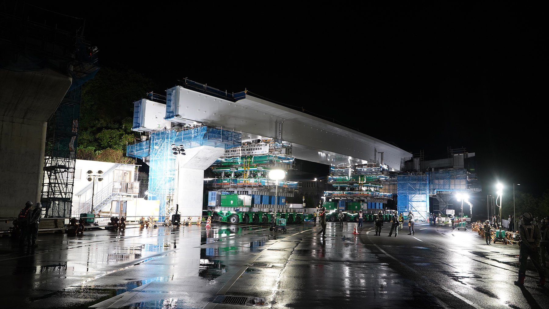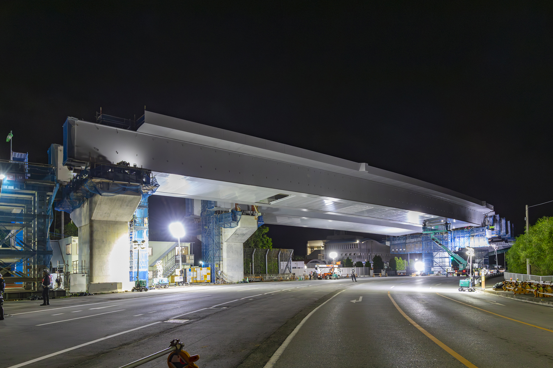内閣府沖縄総合事務局南部国道事務所が建設を進めている小禄道路の上下線P19~P24間の上部工架設工事が最盛期を迎えている。同橋は、国道331号瀬長交差点~豊見城警察署前付近に位置する箇所に建設を進めている鋼橋であり、自走多軸台車による夜間一括架設と、トラッククレーンベントによる架設を併用しており、全部で10回の架設のうち、6回を自走多軸台車、4回をトラッククレーンベントにより架設する。自走多軸台車による架設の際は現道の国道331号の瀬長~豊見城警察署前の交差点間を夜間全面通行止めして架設する必要がある。既に7月11日には45m(約240t)、18日には75m(約400t)の桁を自走多軸台車で運び、橋脚上に架設した。3~5回目は来年2~3月に、6回目の架設は同8月に行う予定だ。さらにトラッククレーンベントによる施工も並行して進め、2027年3月にはすべての桁架設と合成床版鋼板部分の架設を完了する予定だ。桁の製作・架設は川田工業・IHIインフラシステム・仲本工業JVが担っている。その現場を取材した。(井手迫瑞樹)