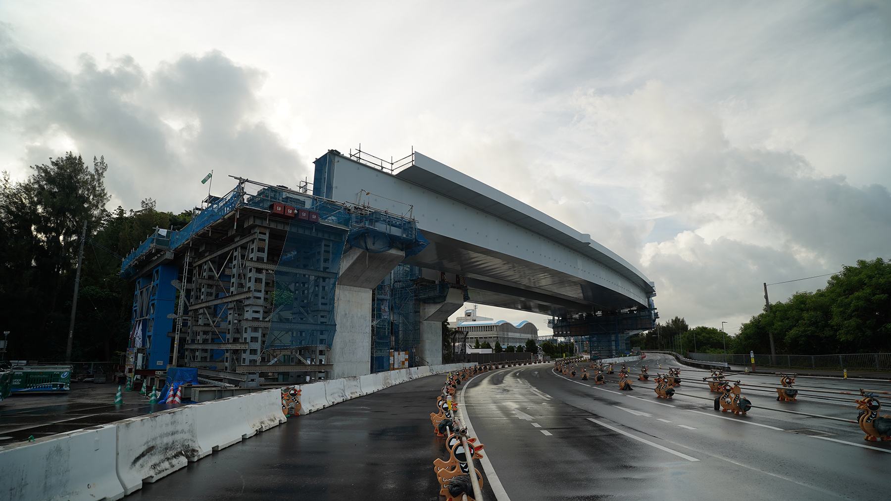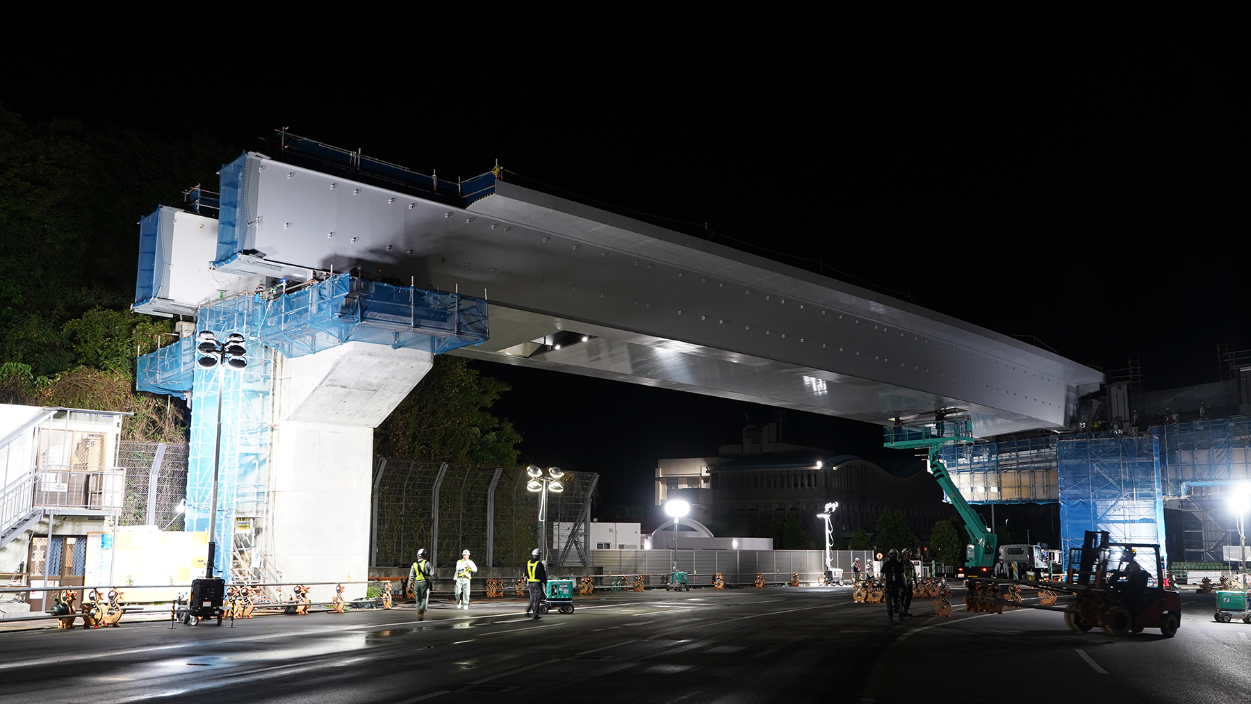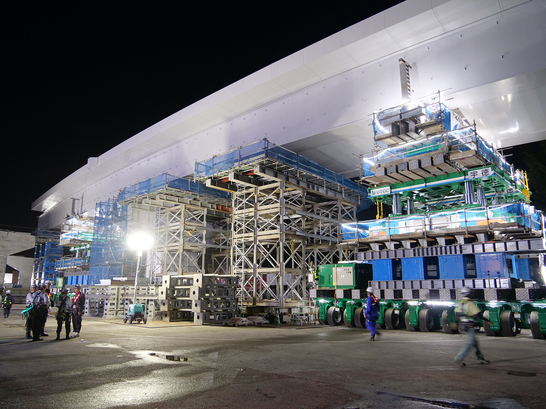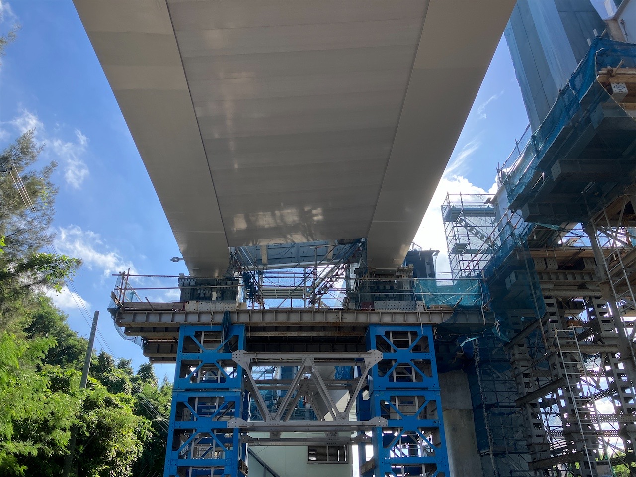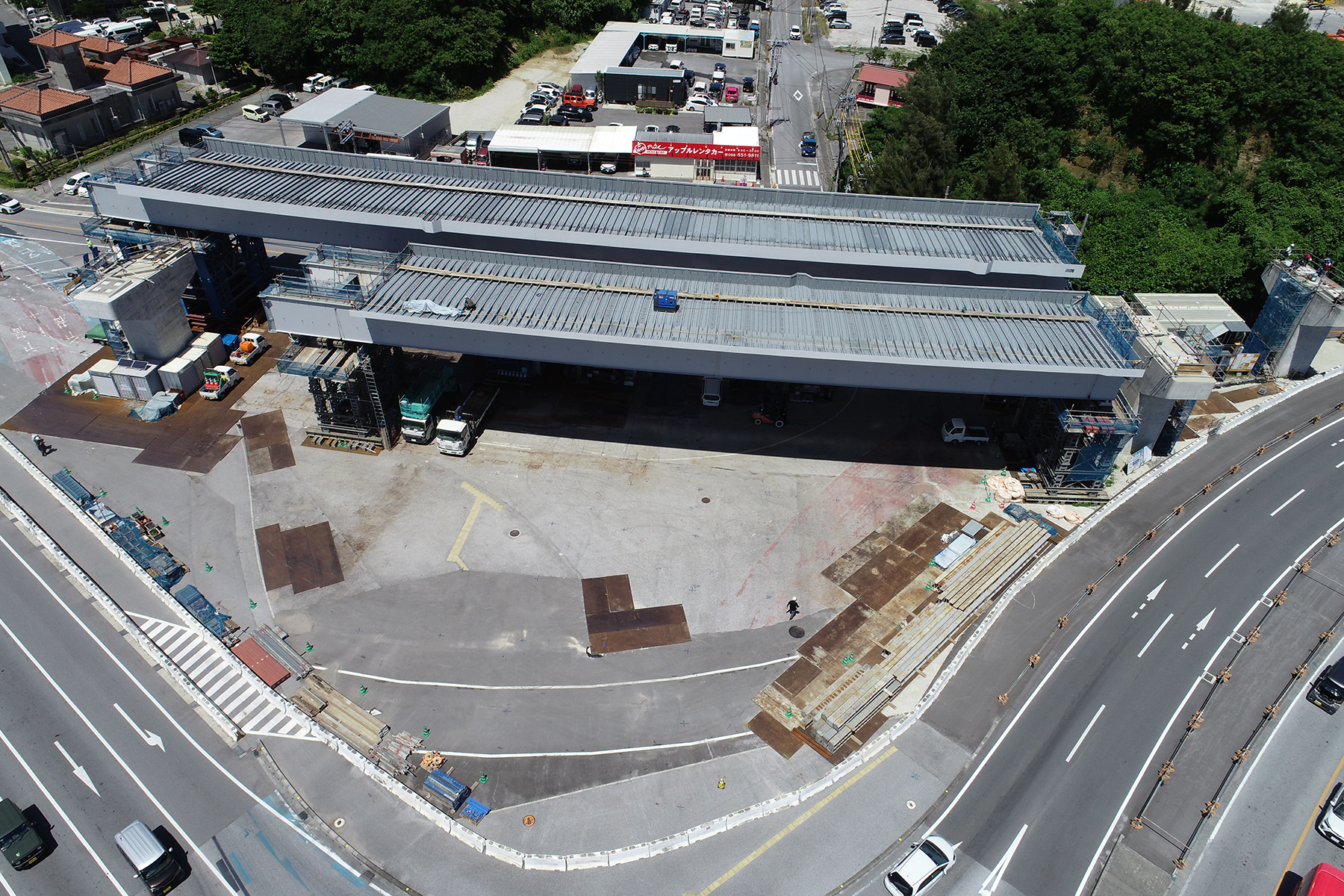 内閣府沖縄総合事務局南部国道事務所が建設を進めている小禄道路の上下線P19~P24間の上部工架設工事が最盛期を迎えている。同橋は、国道331号瀬長交差点~豊見城警察署前付近に位置する箇所に建設を進めている鋼橋であり、自走多軸台車による夜間一括架設と、トラッククレーンベントによる架設を併用しており、全部で10回の架設のうち、6回を自走多軸台車、4回をトラッククレーンベントにより架設する。自走多軸台車による架設の際は現道の国道331号の瀬長~豊見城警察署前の交差点間を夜間全面通行止めして架設する必要がある。既に7月11日には45m(約240t)、18日には75m(約400t)の桁を自走多軸台車で運び、橋脚上に架設した。3~5回目は来年2~3月に、6回目の架設は同8月に行う予定だ。さらにトラッククレーンベントによる施工も並行して進め、2027年3月にはすべての桁架設と合成床版鋼板部分の架設を完了する予定だ。桁の製作・架設は川田工業・IHIインフラシステム・仲本工業JVが担っている。その現場を取材した。(井手迫瑞樹)