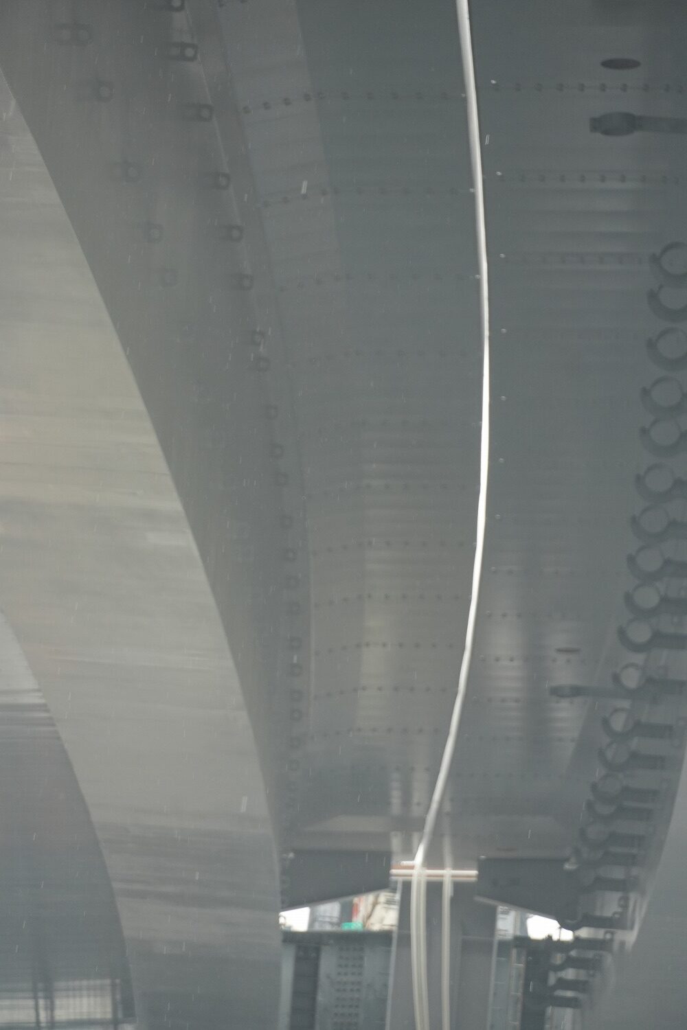 ⑦最後に合成床版底鋼板の架設を行う。合成床版の面積は実に7,146㎡に達する。底鋼板は手前側の大型ブロックをオーバーハングする形で橋軸方向2.3m×橋軸直角11.5mのパネルを1枚ずつ、場所に応じて100tあるいは200tのATCを使い分けて架設した。底鋼板パネルの架設に際しては、張出部の床版同士の接続に際して、通常はボルト接合する場合、下からのナット設置作業があるため、張出足場を作る必要があるが、直下は国道331号が走るため、安全、施工効率の観点からできれば足場を作りたくなかった。そのため、接合方法として、現場において下側からの作業を必要としないIWナットを用いることで足場設置を回避した。