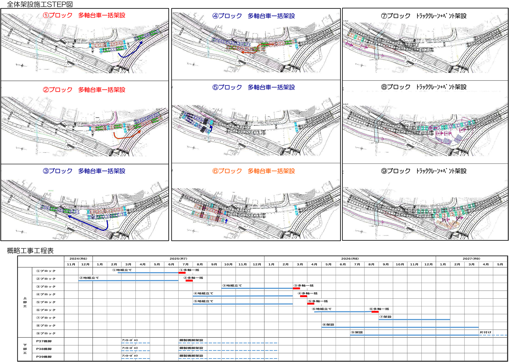 現場は国道331号に隣接した狭いヤードであり、その中で地組を行わなくてはならない。そのため、本線の橋脚上も活用して、1回に付き、2つの大型架設ブロックを地組し、現場に自走多軸台車で運び、架設する工程を繰り返す。塩害環境の厳しい場所に架けられることを鑑みて、鋼材の接合方法は全断面溶接を採用している。