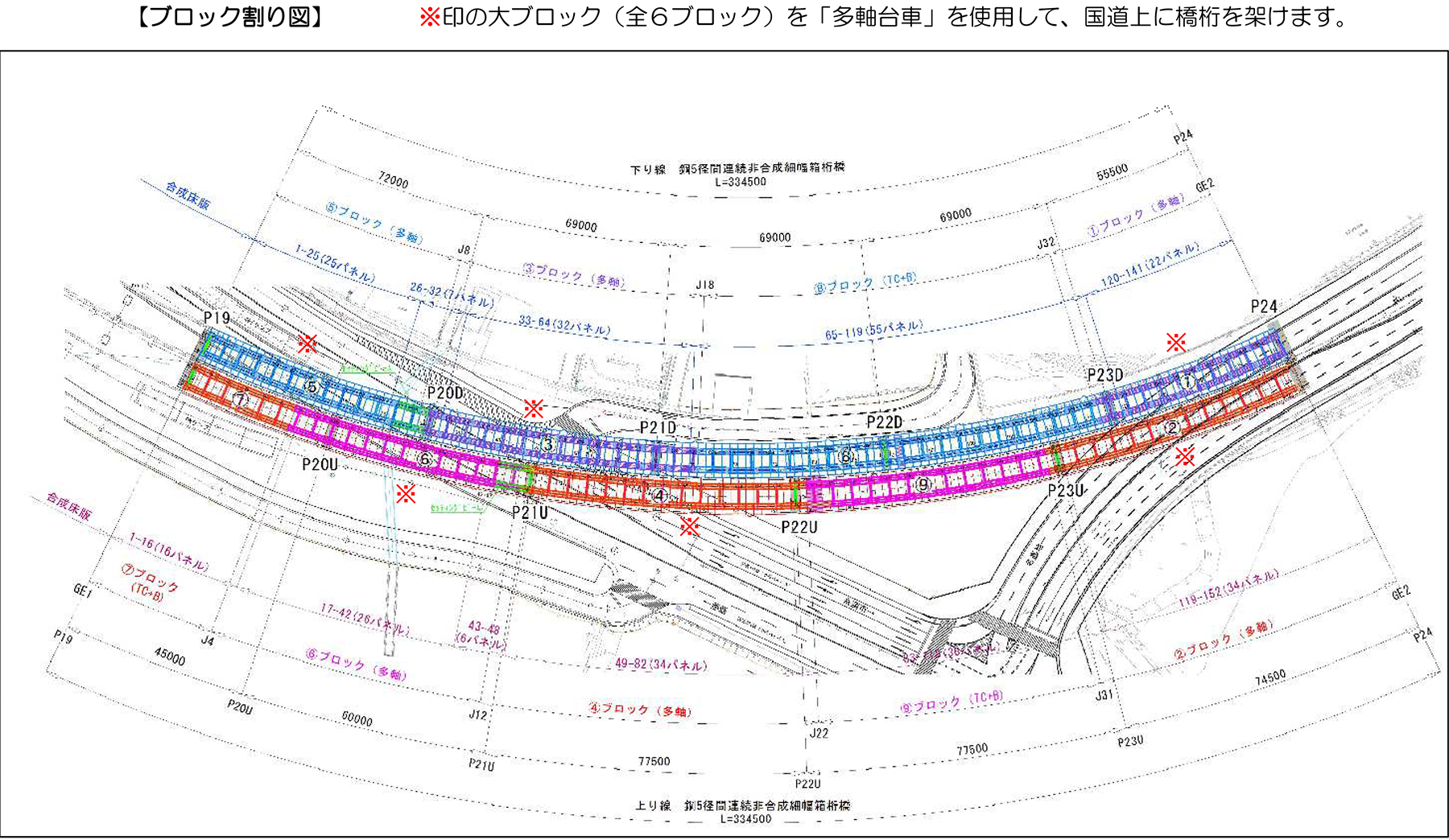 大ブロックの自走多軸台車を6か所で架設した後は、残る4か所をトラッククレーン+ベント工法で順次架設していく。