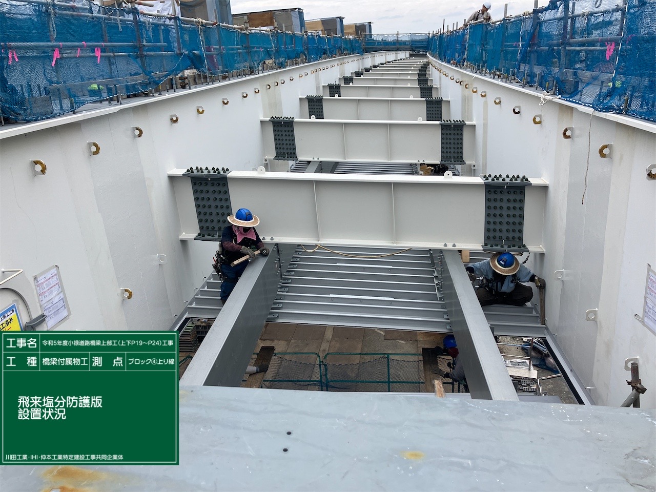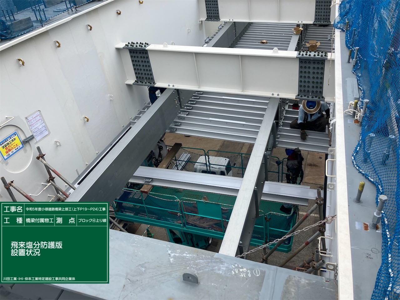 防食は、非常に塩害環境が厳しい現場であることを鑑みて、鋼桁や合成床版の底および側鋼板にはAl-Mg合金溶射+ふっ素樹脂トップコートを採用している。但し、細幅箱桁の桁間にはFRP飛来塩分防護板(宮地エンジニアリング製)を配置しており、その範囲内のウエブ、フランジ、合成床版底鋼板は、塩分の浸入がないという判断から内面塗装系を用いた防食にしている。