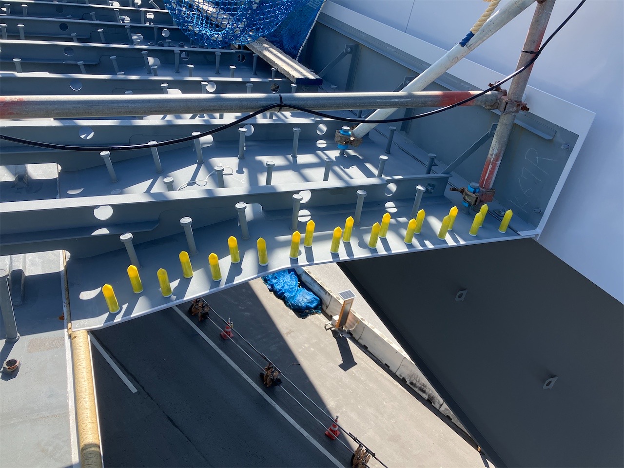 ⑤架設は2ブロック(鋼重約40t)ごとにG1→G2→横桁の順に施工する。横桁と細幅箱桁ウエブ面の接続は通常の高力ボルトによって行う。FRP製の飛来塩分防護板の内面にあるため、G1、G2とも内側のウエブは内面塗装系にグレードダウンしており、ボルトも防食性能はそれに準じている。