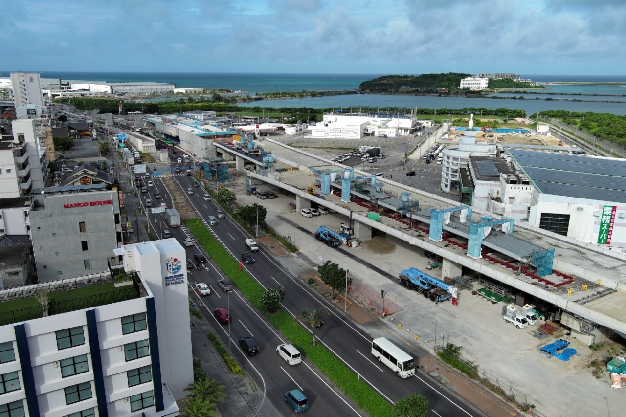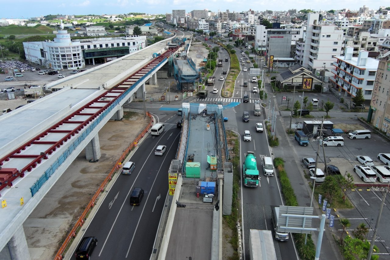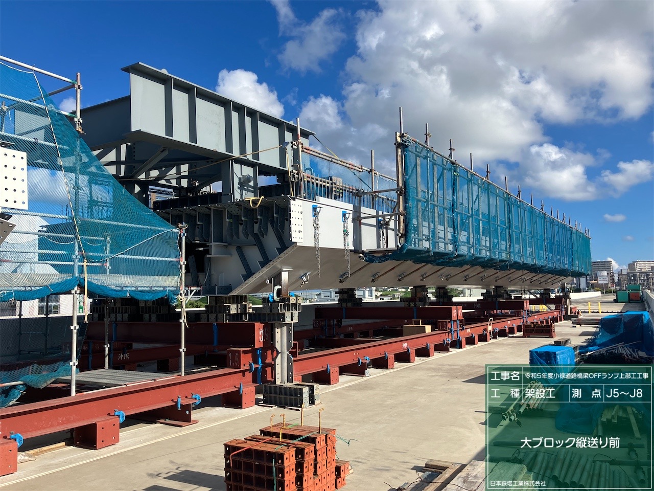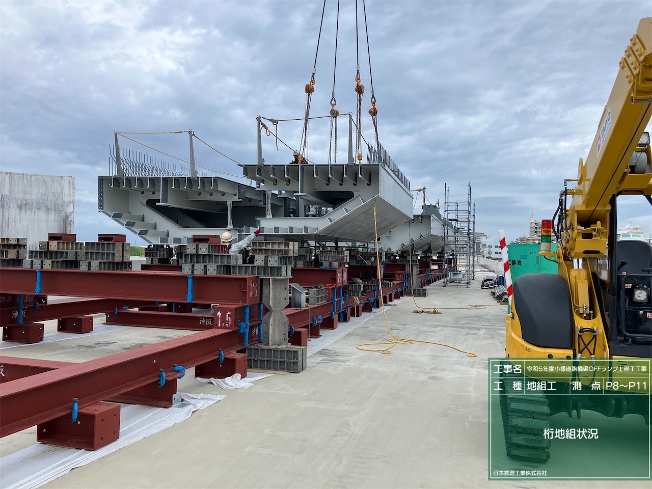 内閣府沖縄総合事務局南部国道事務所は、那覇空港と沖縄自動車道を自動車専用道路で直結すべく事業を進めている小禄道路において、小禄道路OFFランプ橋上部工工事の桁架設を行った。同橋は那覇市具志地内に架かる橋梁で、橋長109m、全幅員6.27m(有効幅員5.26m)、鋼重306.2tの3径間連続鋼床版箱桁橋である。横断勾配は2~3%、縦断勾配は最大6%弱に達する。直下に現道との交差箇所を有しており、当初は自走多軸台車を用いた夜間一括架設を考慮していたが、小禄道路全体で自走多軸台車を用いることが多く、タイムリーな確保が困難であることから、先行して架設されているPC桁上で鋼桁の地組を行い、軌条設備で現場近くまでPC桁上を縦送りし、大型クレーンで吊り上げ、所定の現場に架設するという工法に変更している。桁の製作・架設は日本鉄塔工業。現在は、PC桁上で鋼桁の地組立てが進んでおり、「本線部のPC上部工が完成した10月以降に軌条設備の延伸を進めたうえで、架設を開始した」(同社)。その現場を取材した。(井手迫瑞樹)