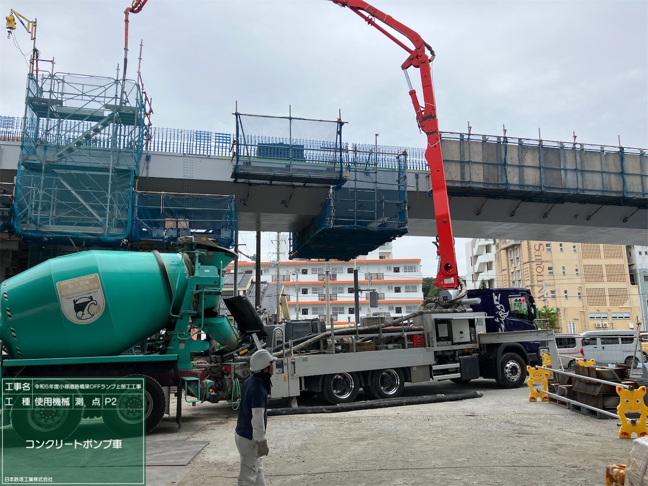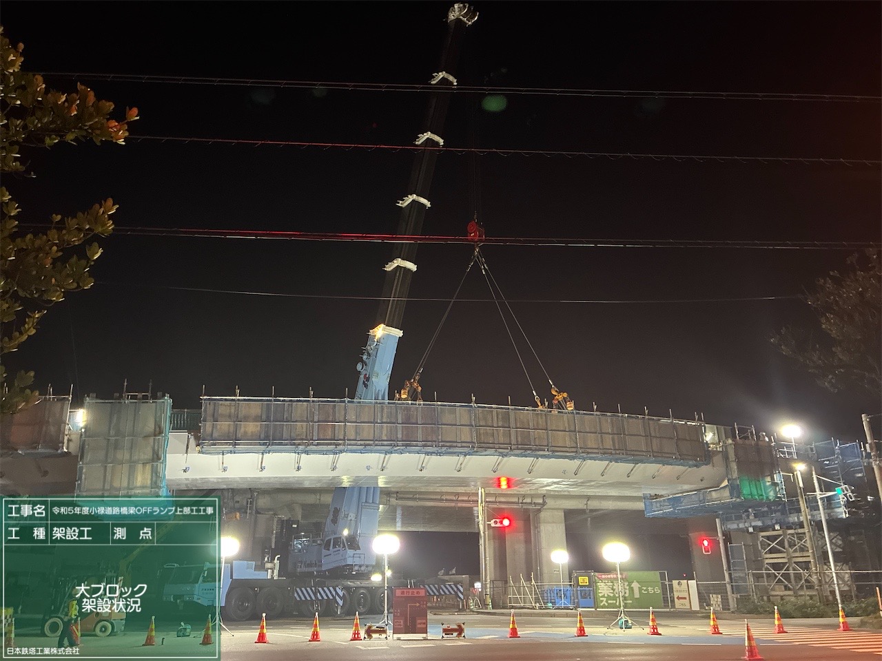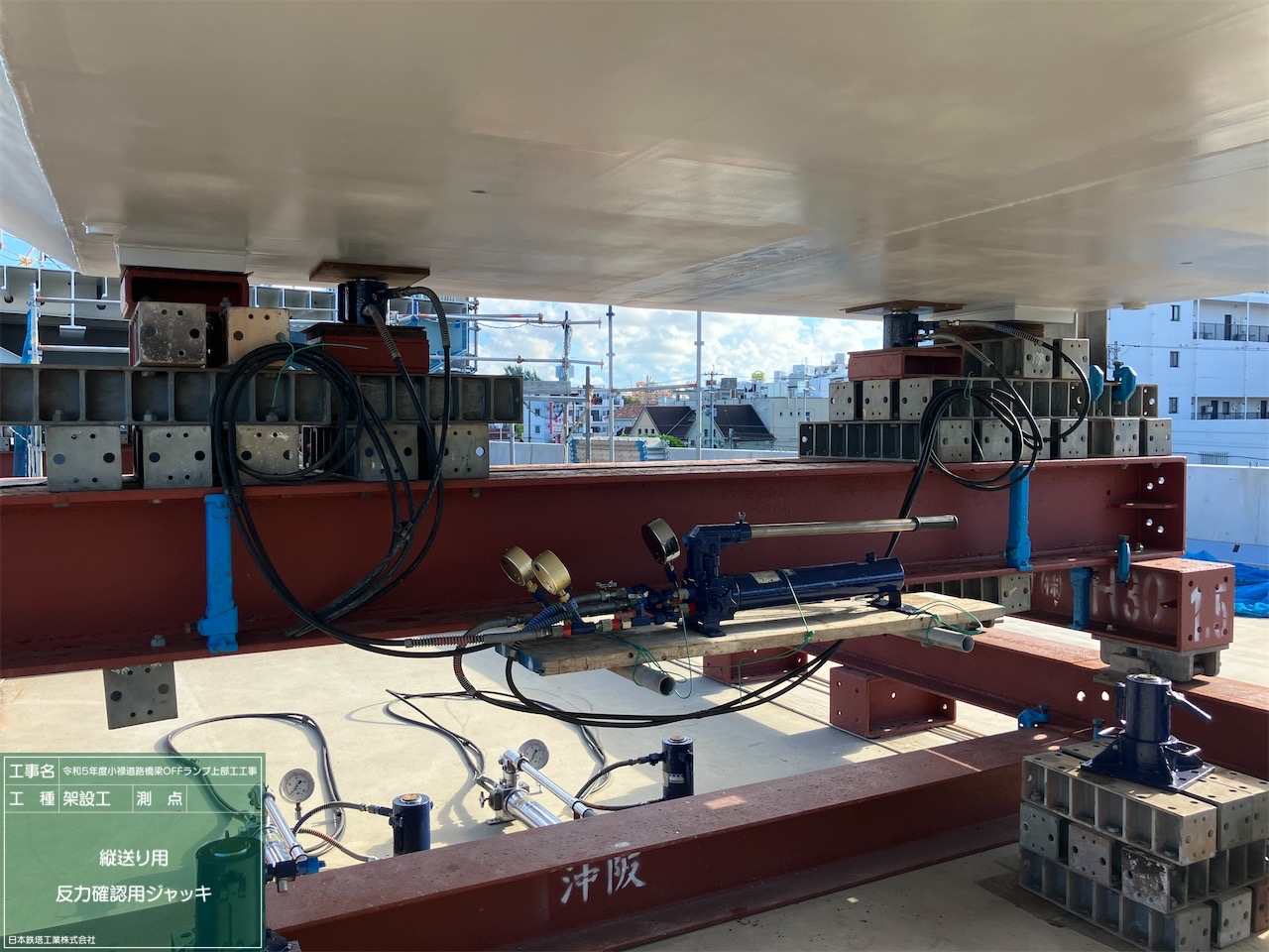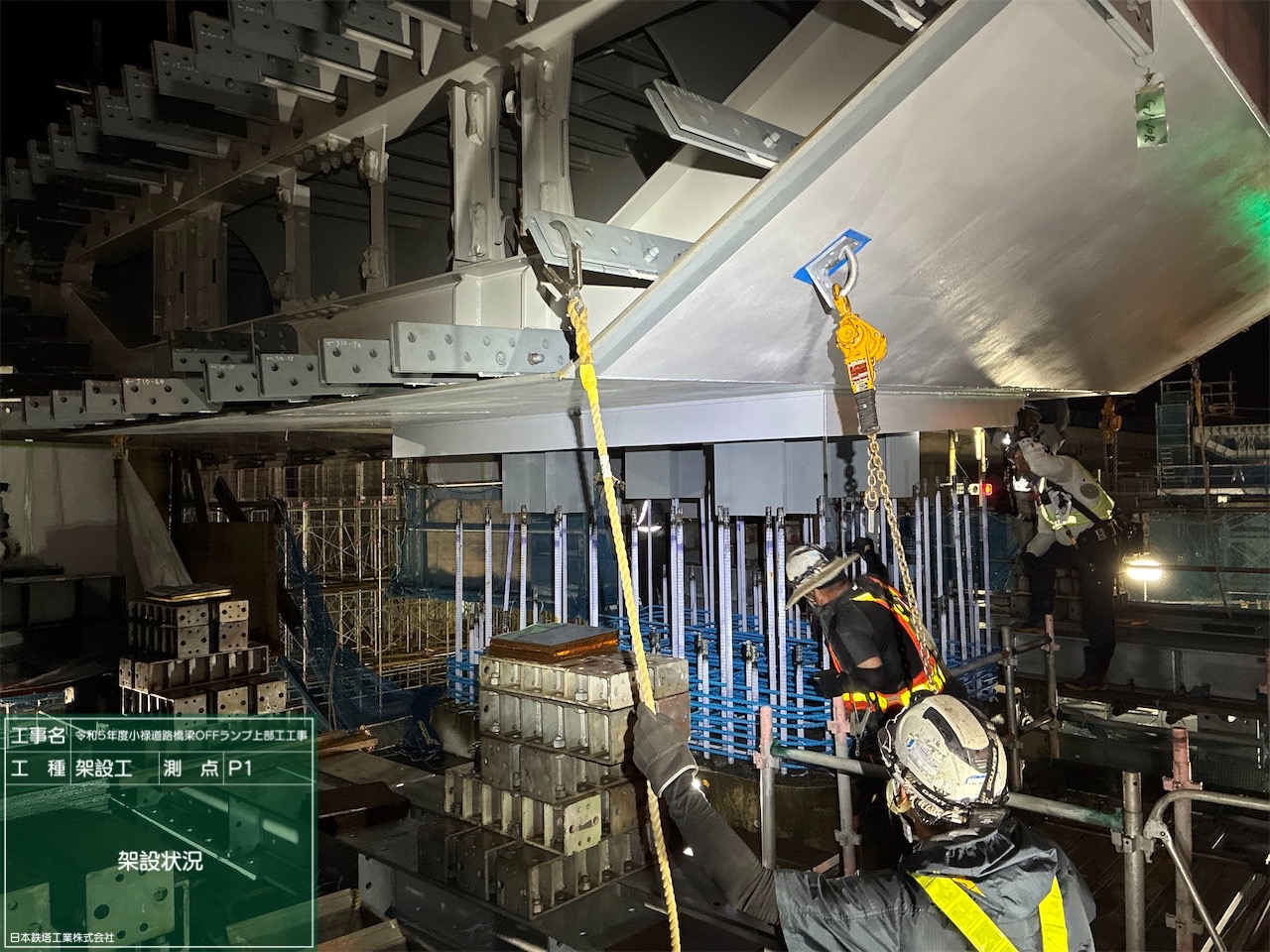 P1~P2間の落とし込みブロック(地組ブロック長28.6m、地組ブロック重量86.4t)も、軌条桁の送り出し長、使用クレーン、規制手法とも同様であるが、同ブロックはA1~P1近傍部と異なり、両方とも空中ジョイントとなる。そのため、P2側にはセッティングビームを設置するが、P1側は吊り状態で架設する。基本的にP1側の支口から合わせる形で架設し、P1側は当日にボルトの本締めを行う一方、P2側は予め20mmほどセットバックして置き、当日は仮締めで対応し、後日セットバックしたうえで、本締めを行う計画としている。ブロック間の架設時クリアランス両側とも20mmしかない一方で、架設地は国道の上空であり、効率的かつ安全な施工が求められることから、施工前にも一度550tATCを用いて80tの桁を試し吊りし、玉掛調整から桁勾配、支口角度に沿った架設を想定した訓練を行い、万全を期した。