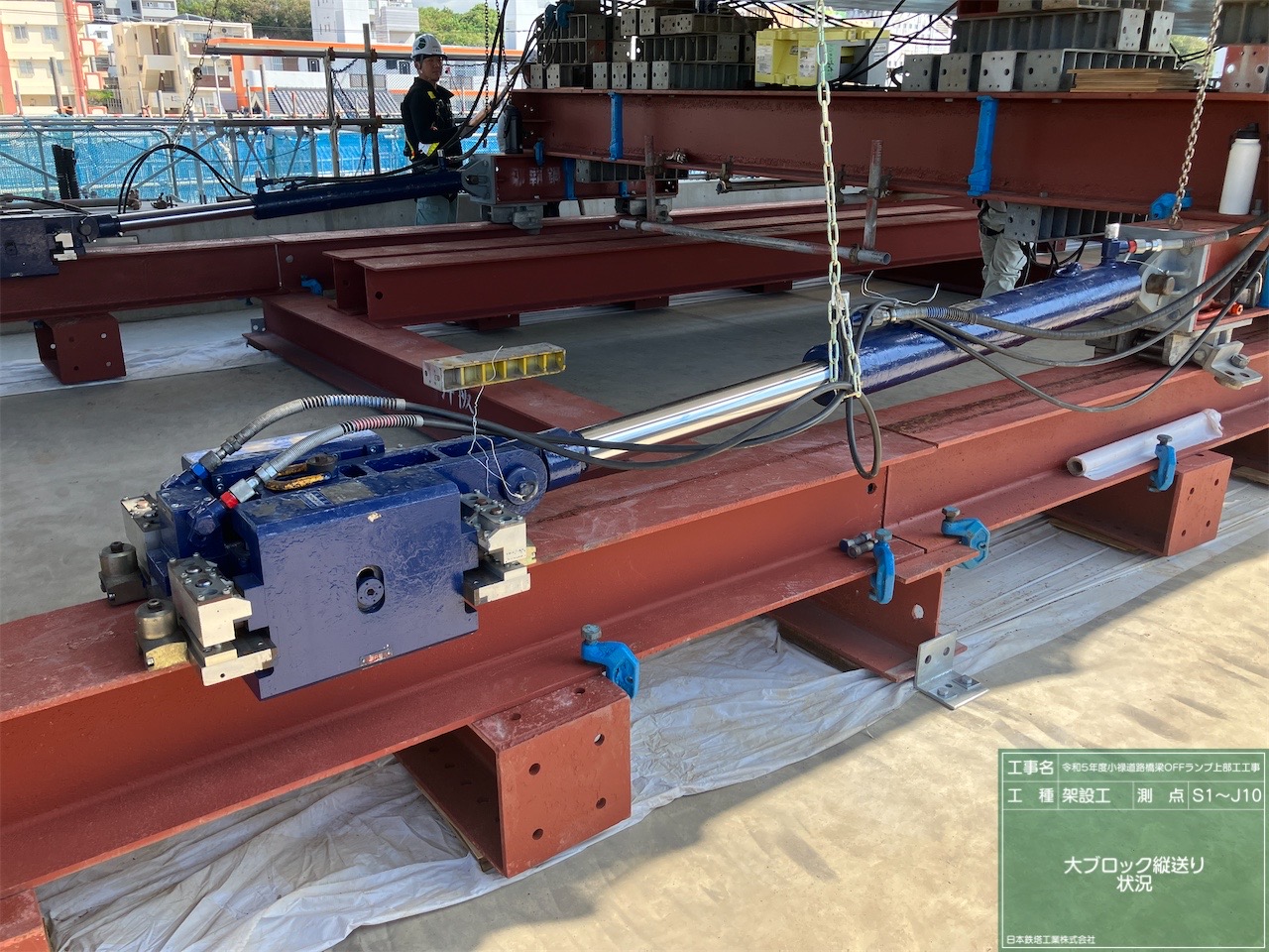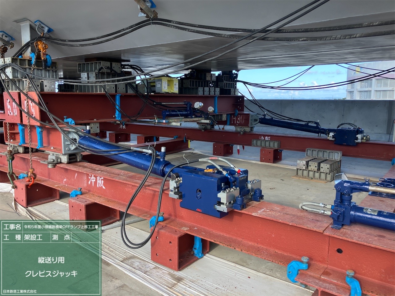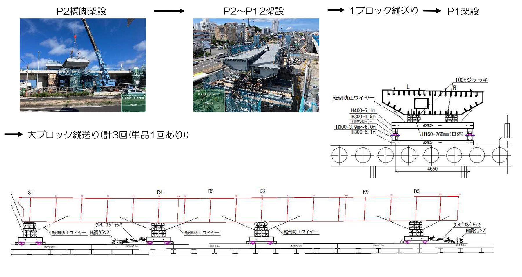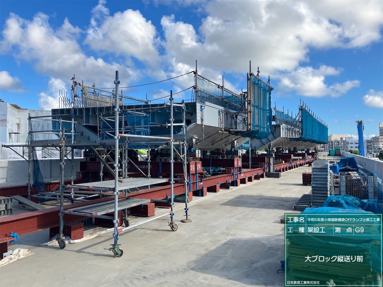 南部国道事務所 PC橋上部で地組して桁移動する小禄道路OFFランプ橋の鋼上部工工事