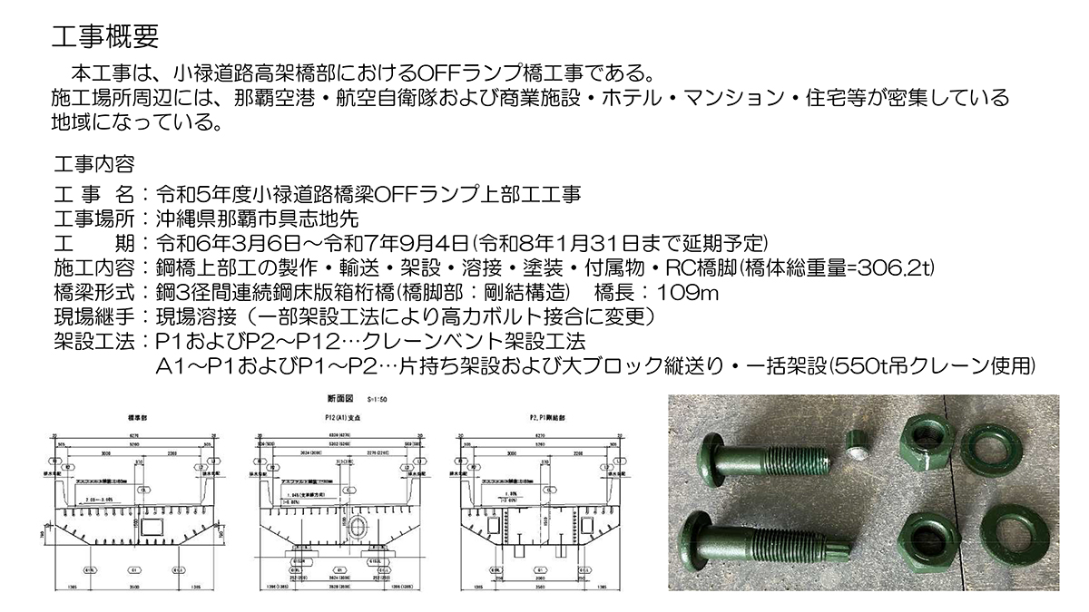 防食はAl-Mg溶射+ふっ素樹脂トップコートというスーパー防食仕様である。また、大型ブロック同士の接合部(4か所)は添接により接合するが、他の桁ブロック同士の接合は全断面溶接により防食性能をより高める。添接ボルトは工場で頭部のみ桁部と同様のAl-Mg合金溶射を施した防錆ボルト(日鉄ボルテン製)を採用する方針だ。