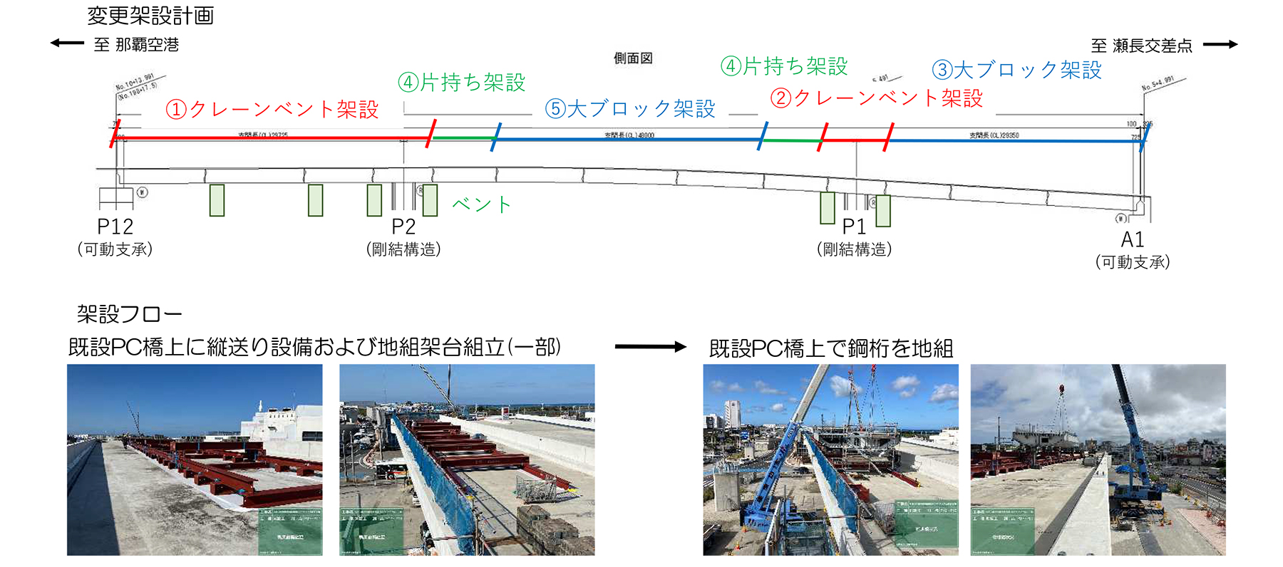桁製作は同社の若松工場で行い、那覇港まで内航船で運んだ後に水洗いし、現場まで陸送した。陸送時は、重さ9.78t~12.98t 長さ6.17m~10.6mのブロックを左右2分割の断面に26ブロックに分けて輸送した。