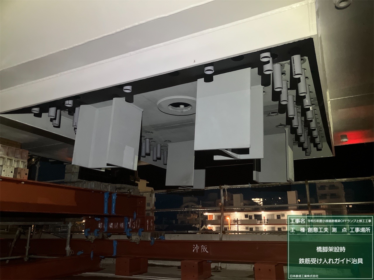 さて、鋼桁の架設方法と共に本現場の特徴を成すのが、P1、P2が鋼桁とRC橋脚の剛結構造であるという点だ。中詰めコンクリートの打設高は2.5m、橋脚から延びる鉛直方向の鉄筋数はP1、P2橋脚ともに86本に達する。これを上部工桁内に配置するL字鉄筋(鋼・RCの一体化のために必要な)と機械継手で繋がなくてはいけない。そのため上部の鋼桁側から鉄筋を挿し込む時のガイドとして塩ビ管を筒状にしたものを接続部に配置し、ずれないようにした上で、機械継手によりつなげる手法を計画した。同ガイド材は機械継手を接続する前に抜くことができ、再利用することが可能である。同社は同手法を圏央道での剛結構造でも用いており、今回それを援用することで、確実な鉄筋継手の施工と工期の短縮を図っている。