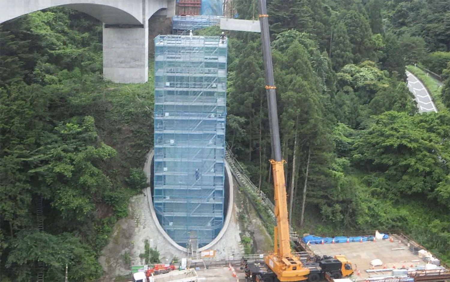 PC箱桁部の架設は、各脚頭部から移動作業車(ワーゲン)で張り出しする工法を用いる。ワーゲンは、橋体幅員14m以下、最大容量3,430kN・m、最大施工ブロック長5.0m、高さ15m程度、移動作業車質量84t、全装備質量135~150tの大型のものを用いる。工期を少しでも縮めるため、下部工が出来上がった橋脚からワーゲンを載せて上部工を施工していく予定だ。