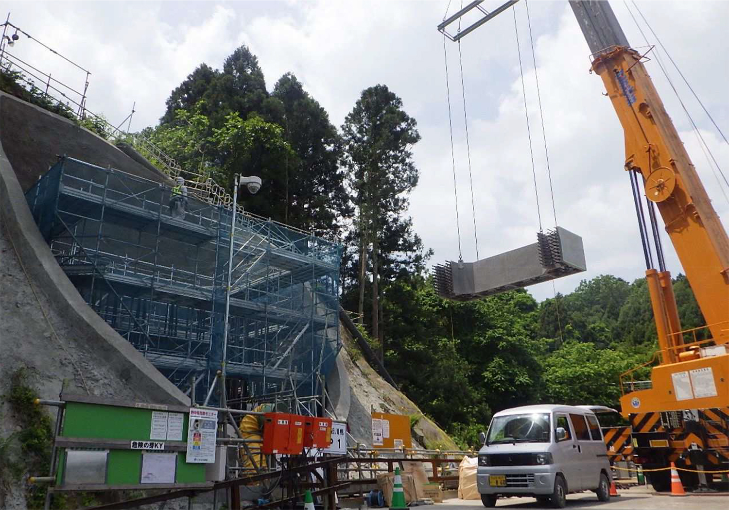 一方、ポステンT桁部は、下部工は現場打ちで施工する。一方、上部工は工期短縮を図るため、桁は分割してプレキャストブロックを輸送し、現場ヤード内で連結させ(1径間7ブロック程度を1つの桁に)PCで緊張させた後、桁を2台のクレーン相吊りで架設し、桁同士の接合部を現場打ちする手法を計画している。ただし、P6-P7橋脚間については、クレーンの配置場所が限定されるため、架設桁を使用する。現場では支保工は一切つくらず、クレーンは360t吊を2台使って架設する。場所打ちと比べるとコストはかかるが、工期短縮を最優先して工法選択した。