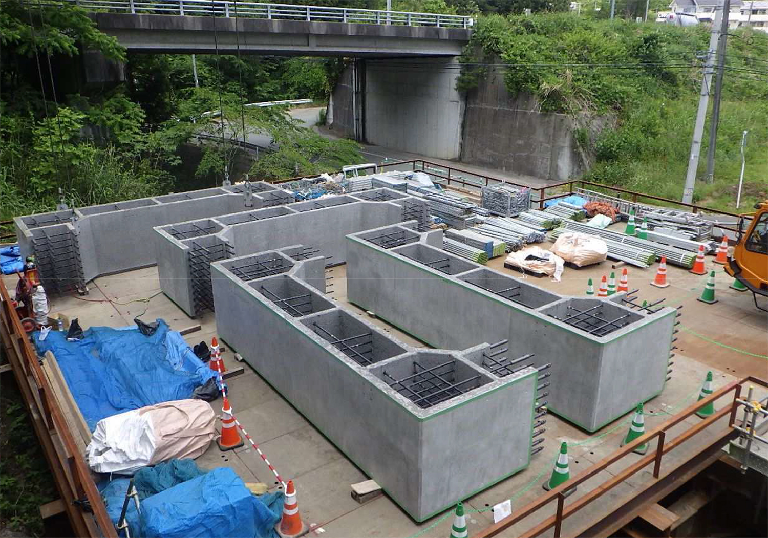 橋脚は、工場にて製作したプレキャストブロックを用いる施工方法を採用する予定だ。コの字形状タイプのプレキャストブロック(P8~P10橋脚は厚み1,500mm、P11橋脚は同1,000mm)を1段に2つ配置していく手法を採った。1リフトあたり最大4段6m積み上げ、プレキャストブロック内部にコンクリートを打設していく。また、プレキャストブロックは薄肉部材であり、現場におけるコンクリート打設時の温度応力などに対応するため、鋼繊維や収縮低減材を添加した配合として、ひび割れ抵抗性の向上を図っていく。P8~10橋脚のプレキャストブロックは形状を統一して同じ製作型枠を転用して製作する計画だ。P11橋脚は断面形状が違うため、別途製作型枠が必要となり、さらに低い橋脚でもあることから製作費が割高となる。そのため、P11橋脚のプレキャストブロック製作を先行して、使用した製作型枠をうまく加工してP8~P10橋脚で使うことにより製作費を抑える計画だ。