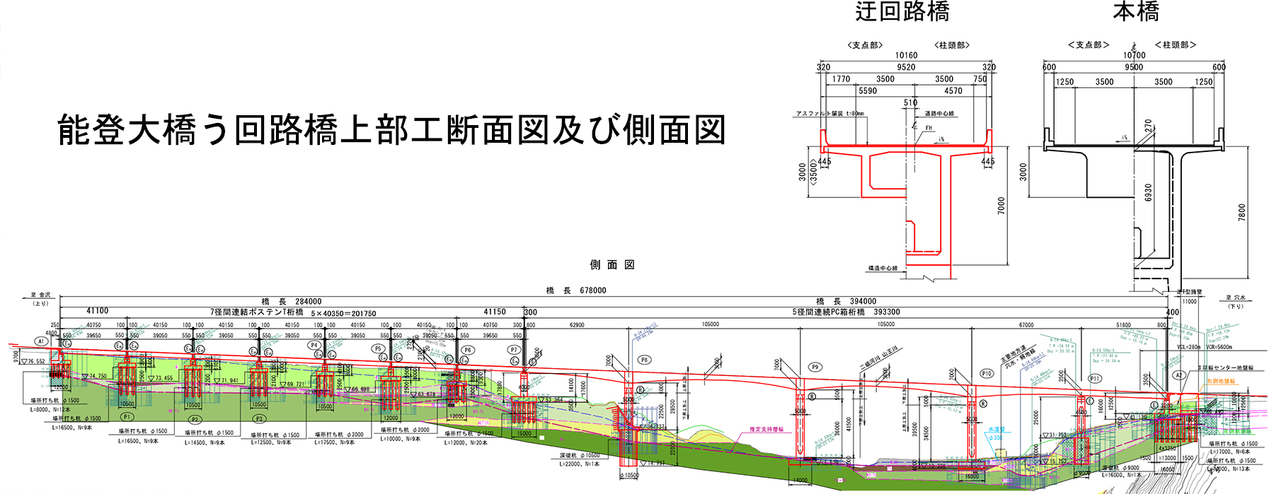 橋長678m、7径間284mが連結ポステンT桁、5径間394mが連続PCラーメン箱桁
