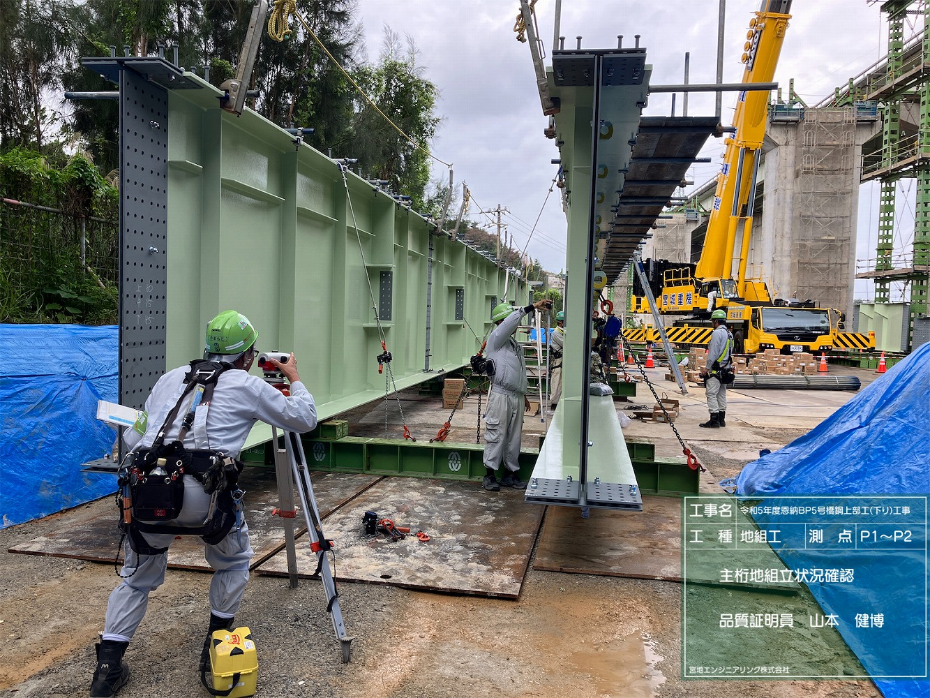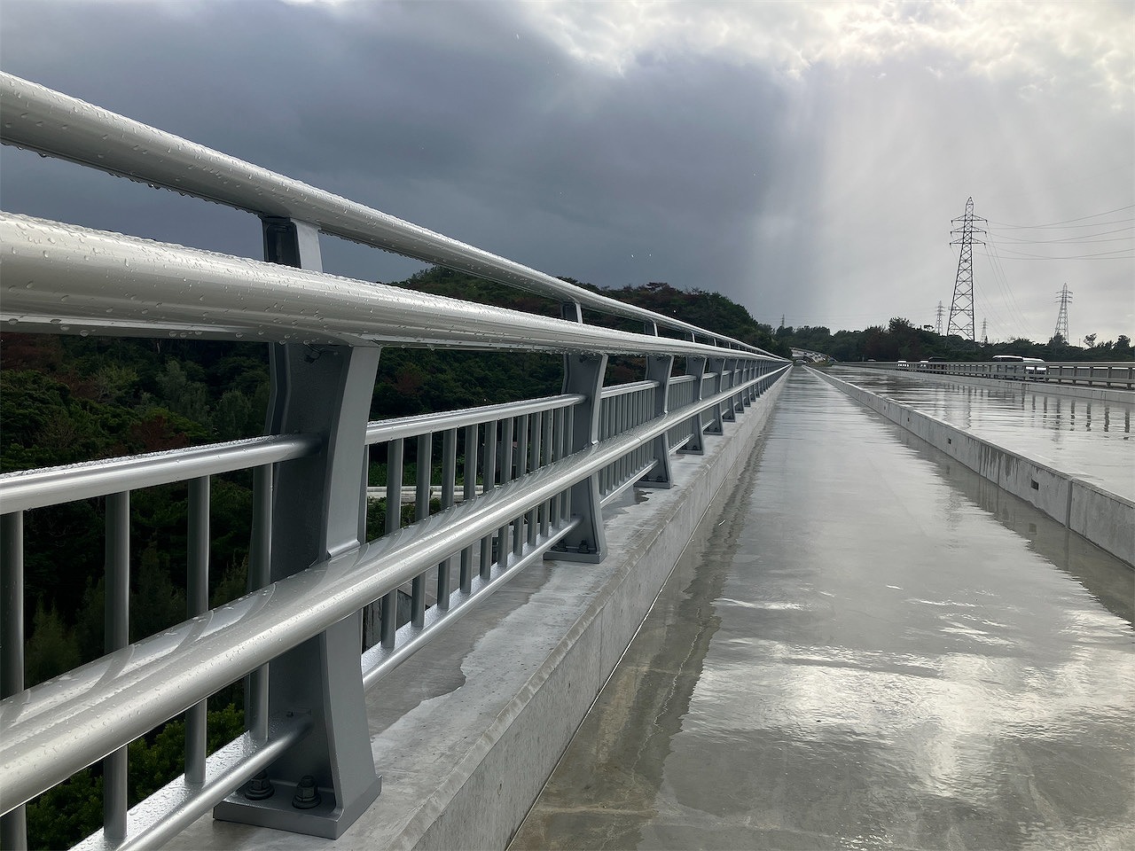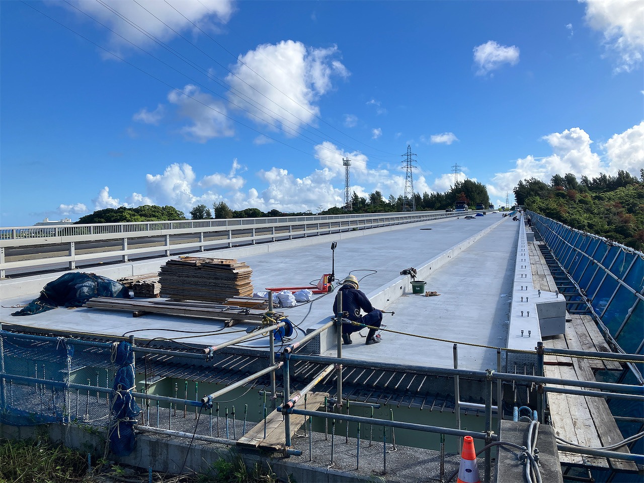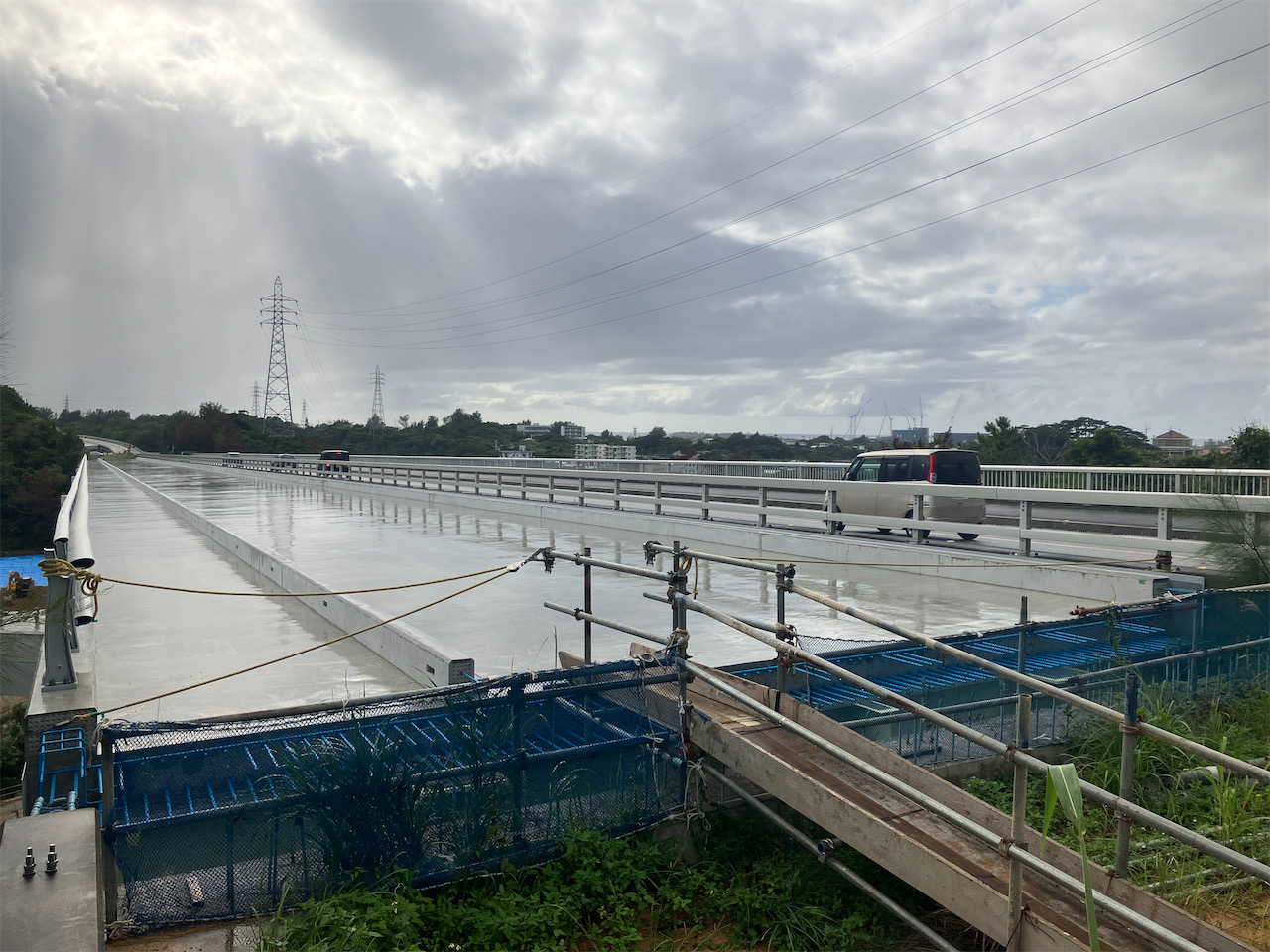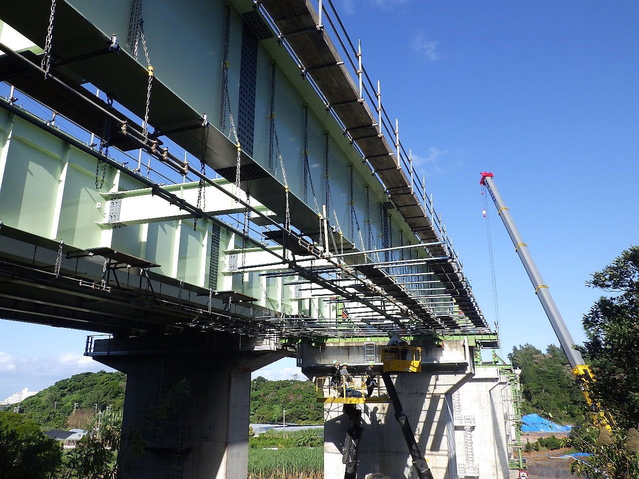 現場は海岸線から離隔はあるものの、沖縄県は厳しい厳しい腐食環境にあるため、防食仕様は通常のc-5系の重防食塗装とし、桁同士の接合も防錆高力ボルトによる添接を採用している(厳しい塩害地域で行う全断面溶接は採用していない)。一方で、検査路は下部工ではアルミ製の検査路(KERO)、上部工では自社のFRP製検査路を採用するなど長期耐久性に優れた材質のものを採用している。