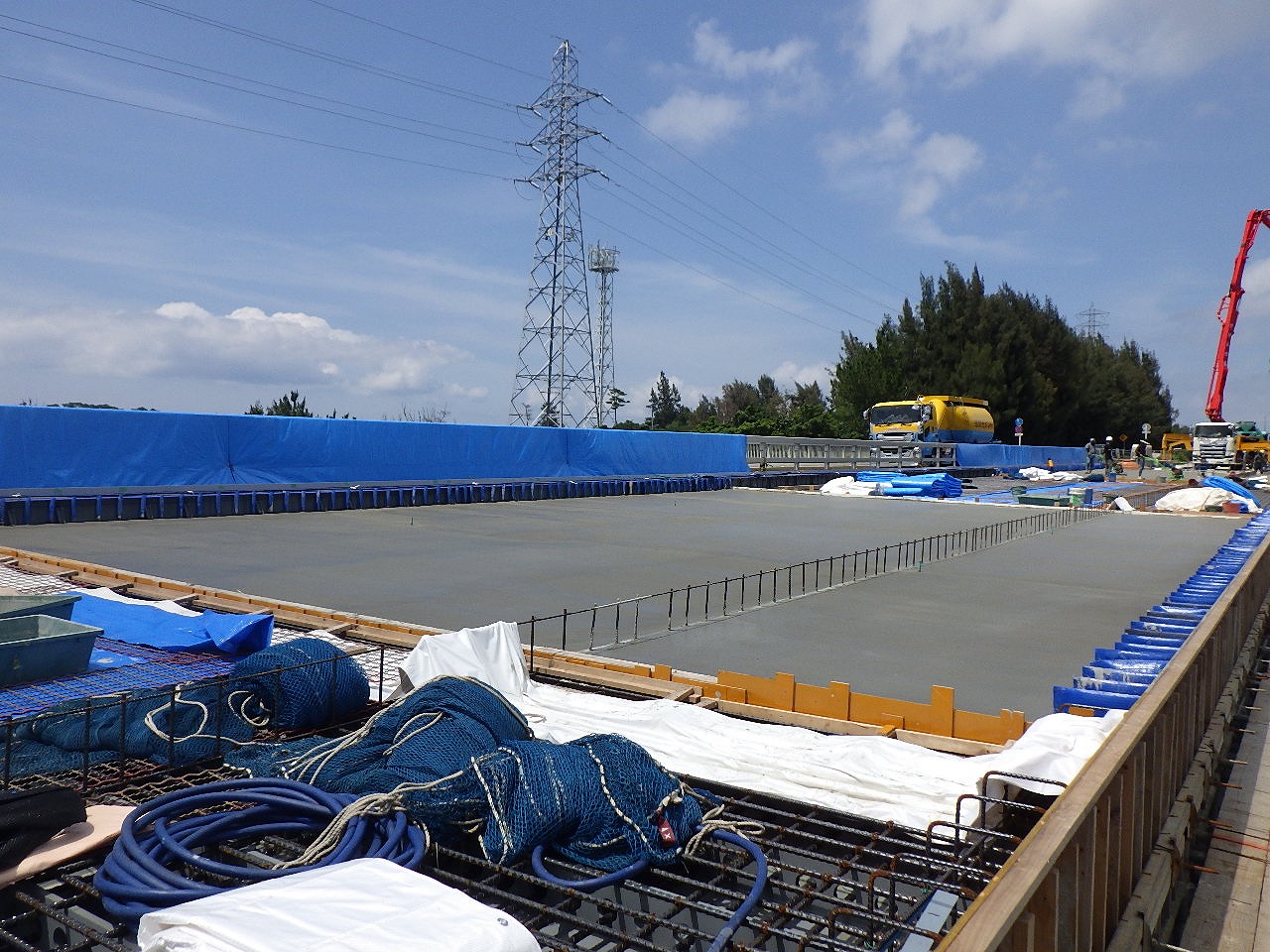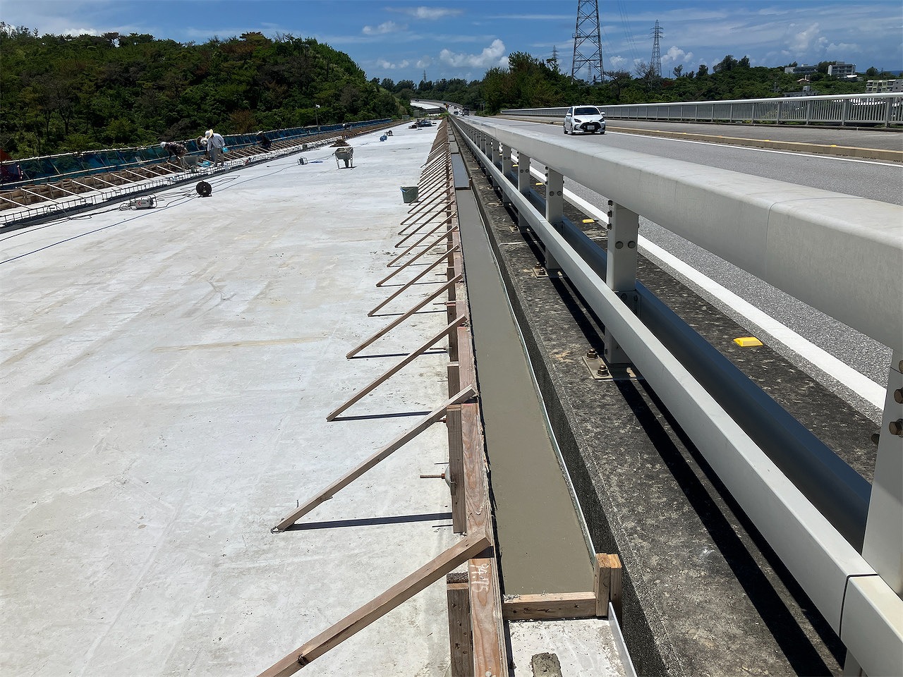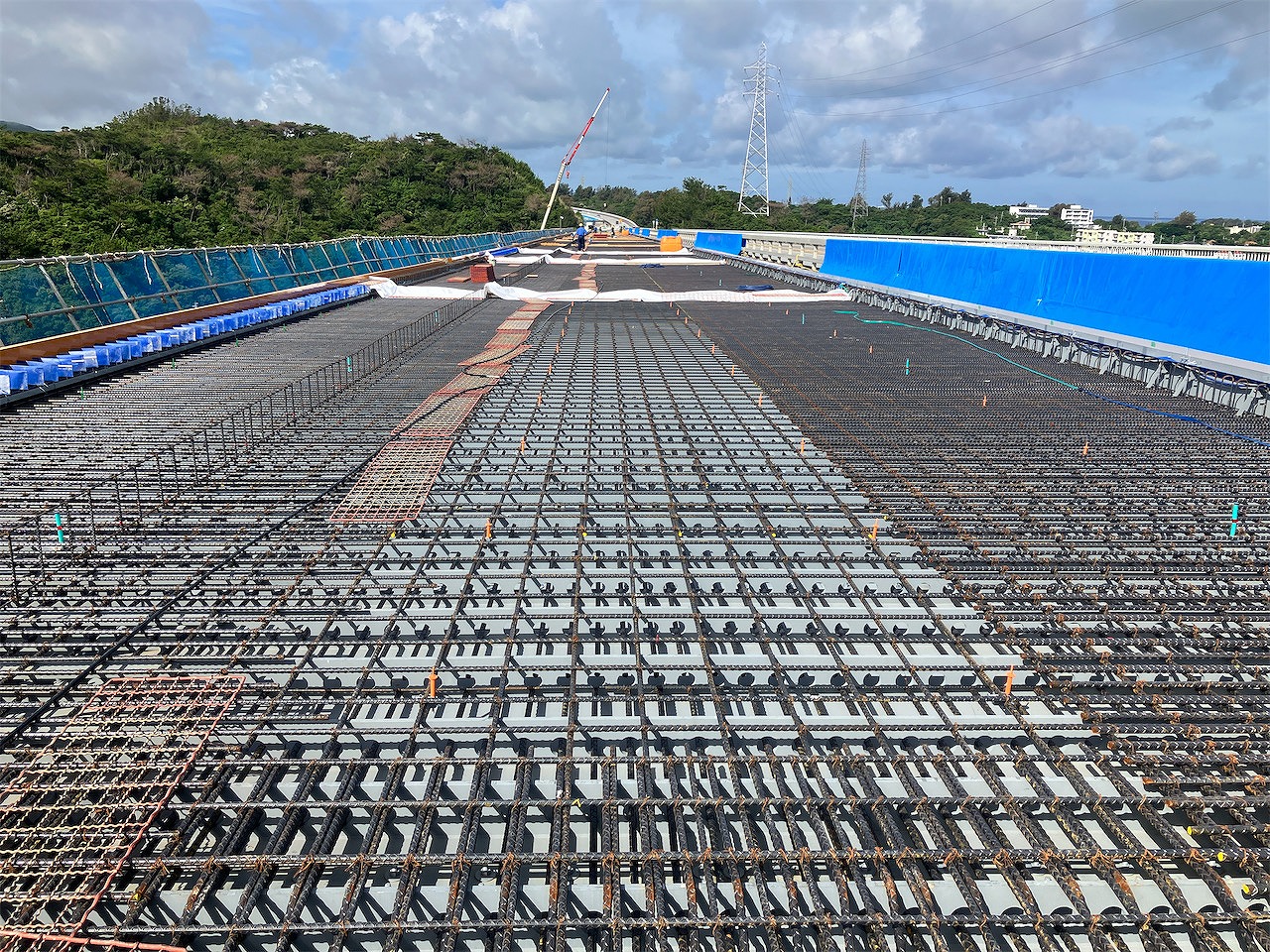 合成床版へのコンクリート打設は5月末~6月中旬に6回に分けて行われた。ここで問題になったのが、暑中コンクリート対策と、コンクリート供給のひっ迫である。恩納村や本部町、名護市地域など本島北部は現在、ホテルの建設ラッシュとなっており、「生コンプラントは現場まで30~35分程度離れた箇所にある宜野座村のものしかない状態であり、それもホテル建設が優先され、その供給の合間にしか製造してもらえず、急遽供給をねじ込むことは難しい状態にあった」(同社)。そのため、供給日を予め需要が比較的少ない火・金曜日に固定して予約することにし、打設時に合わせてプラント、ポンプ、左官の足並みを揃えた。また、梅雨や台風の襲来を見越して、打設を少しでも早く行うために、底鋼板上の配筋の仕上がりを早めた。「それが奏功し、梅雨時期にもかかわらず、打設日に雨が降り、打設を見送った日が1日しかなかった幸運にも恵まれ、極めて速く施工することができた」(同)。車道床版打設後は、歩車分離帯の打設を行った。