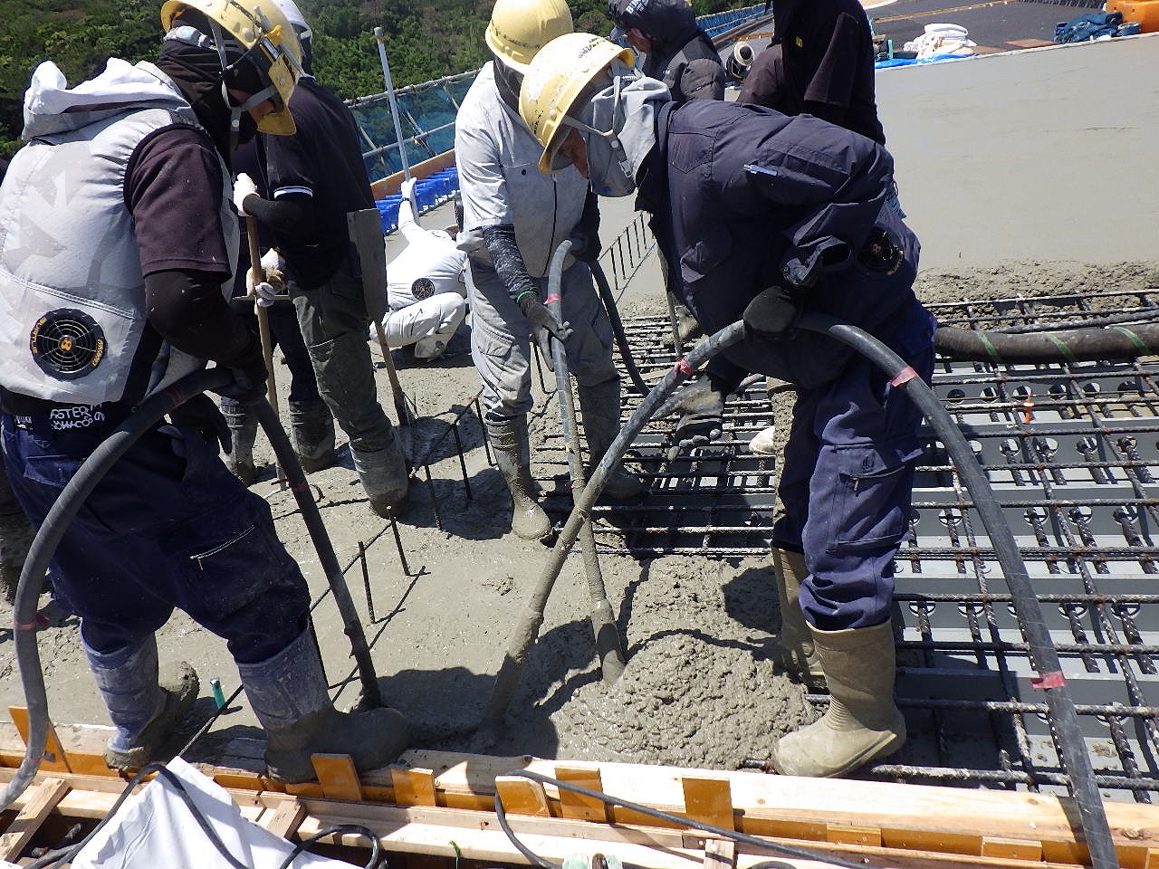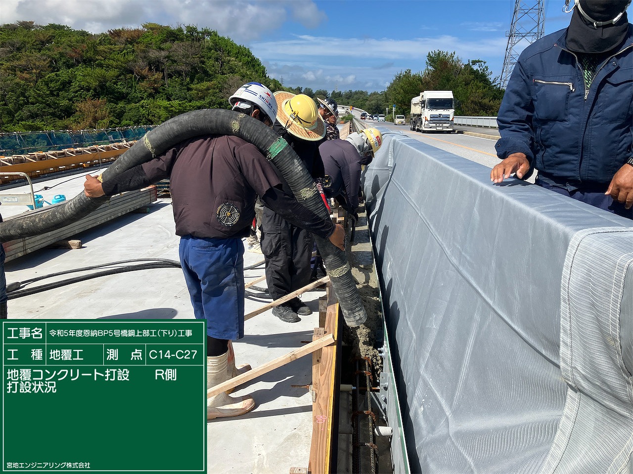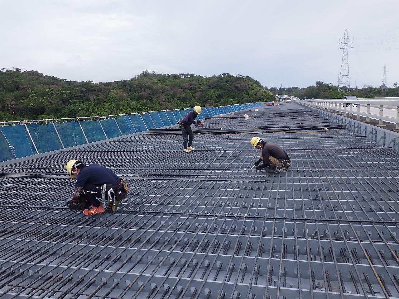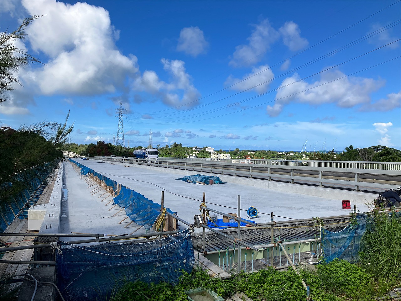 合成床版へのコンクリート打設は5月末~6月中旬に6回に分けて行われた。ここで問題になったのが、暑中コンクリート対策と、コンクリート供給のひっ迫である。恩納村や本部町、名護市地域など本島北部は現在、ホテルの建設ラッシュとなっており、「生コンプラントは現場まで30~35分程度離れた箇所にある宜野座村のものしかない状態であり、それもホテル建設が優先され、その供給の合間にしか製造してもらえず、急遽供給をねじ込むことは難しい状態にあった」(同社)。そのため、供給日を予め需要が比較的少ない火・金曜日に固定して予約することにし、打設時に合わせてプラント、ポンプ、左官の足並みを揃えた。また、梅雨や台風の襲来を見越して、打設を少しでも早く行うために、底鋼板上の配筋の仕上がりを早めた。「それが奏功し、梅雨時期にもかかわらず、打設日に雨が降り、打設を見送った日が1日しかなかった幸運にも恵まれ、極めて速く施工することができた」(同)。車道床版打設後は、歩車分離帯の打設を行った。