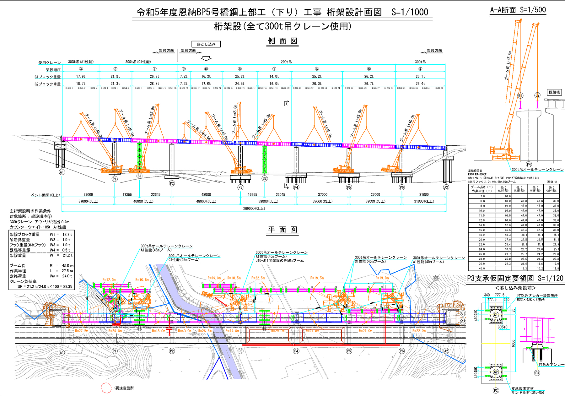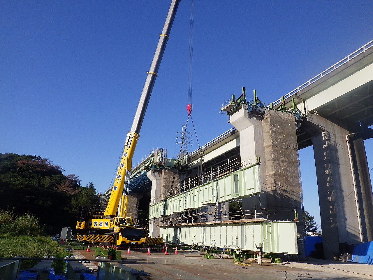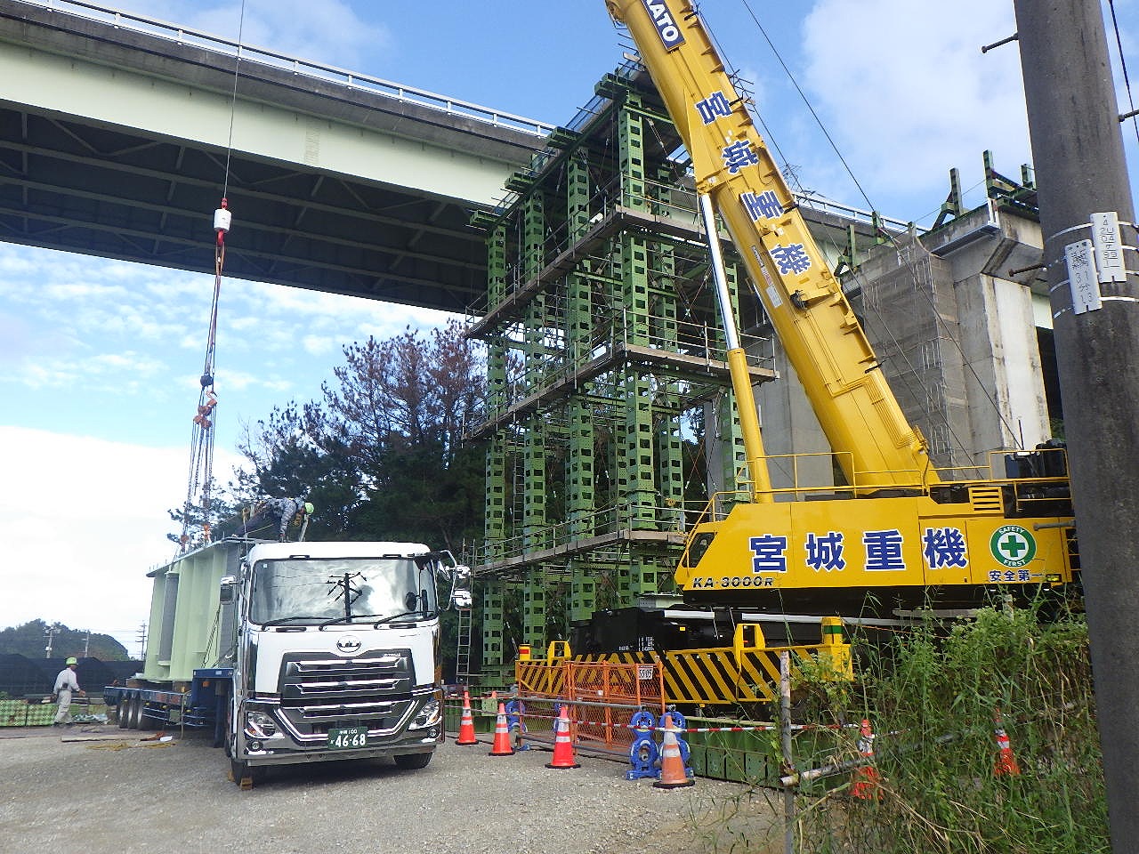 設計は長大。主要一次協力会社は、架設工がエム・ケイ・エンジ、床版工が丸高建設工業、重機が宮城重機、土工が信幸組、塗装工が沖神。支承メーカーはビー・ビー・エム、防食塗料供給は大日本塗料、防錆ボルト供給は日鉄ボルテン。