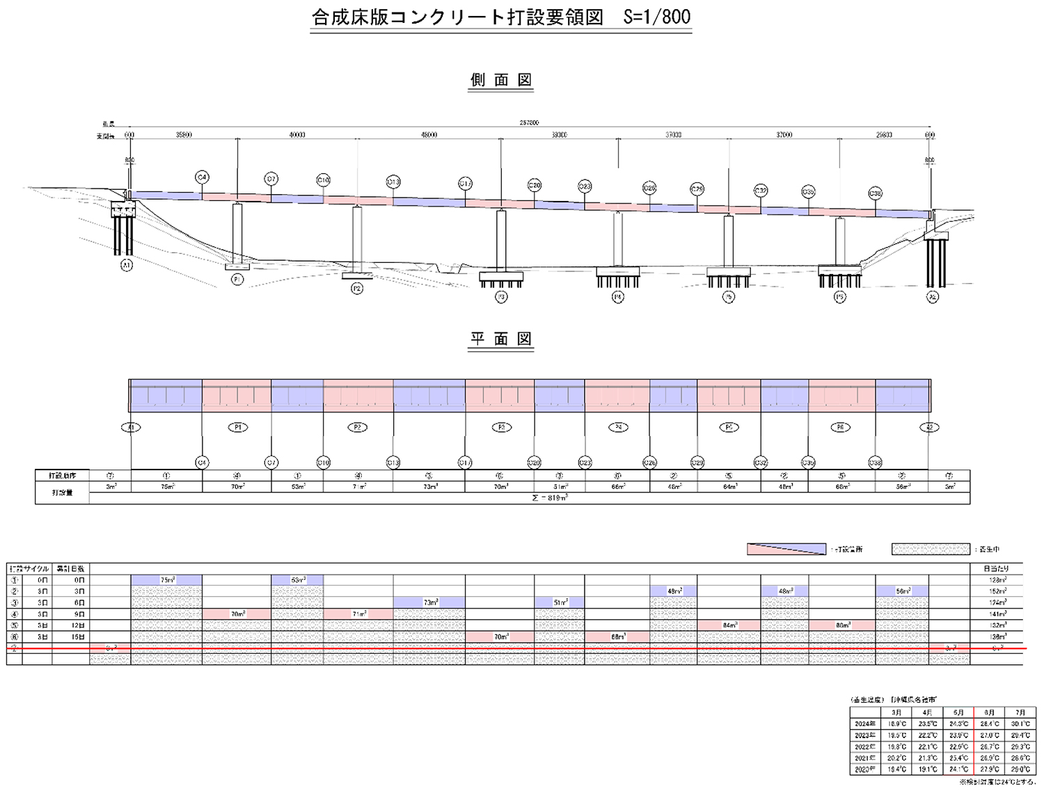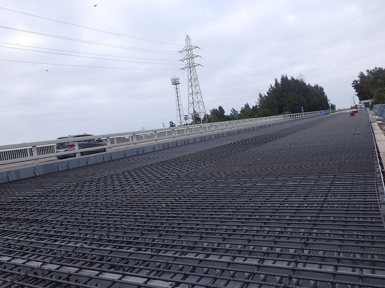 同橋は橋長269m、幅員10.955mの鋼7径間連続2主合成鈑桁橋である。桁高は2.5mで、支間長は最大で48m、最小で29.8mとなっている。合成床版はパワースラブを採用した。コンクリート打設厚は260mmで、圧縮強度30Nの膨張剤入りコンクリートを使用して施工した(スランプは12㎝)。