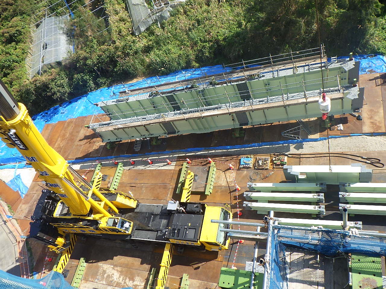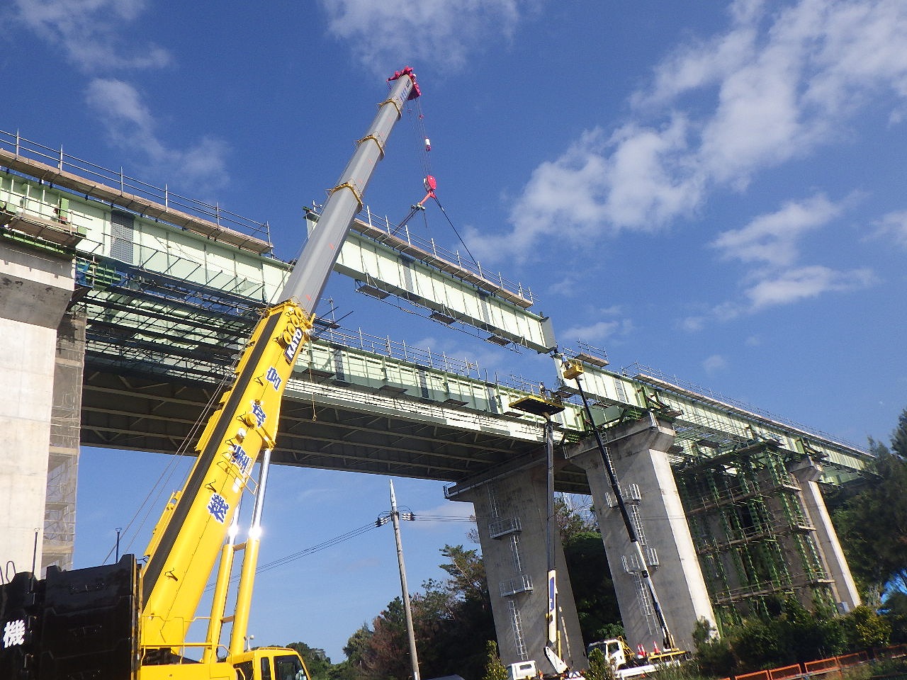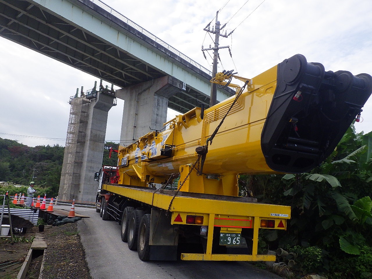 桁製作は同社の千葉工場(千葉県市原市)で行い、東京有明港からRORO船を用いたシャーシ輸送で那覇港まで海上輸送し、沖縄県内輸送業者のトレーラーヘッドを接続したトレーラー(全長17m程度)で国道58号から付近の農道を通り、ほぼ直下にあるヤードまで輸送し、地組した。