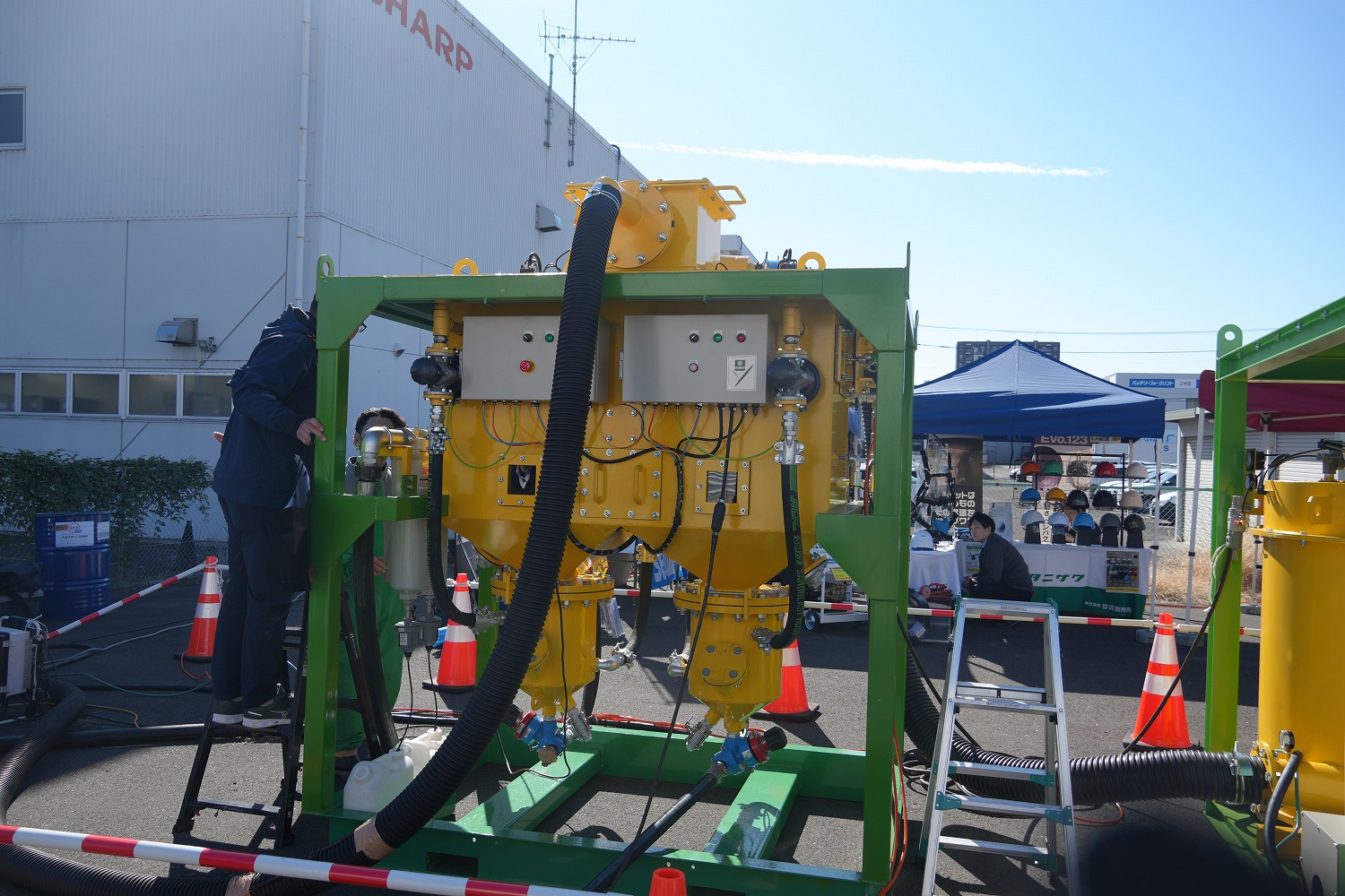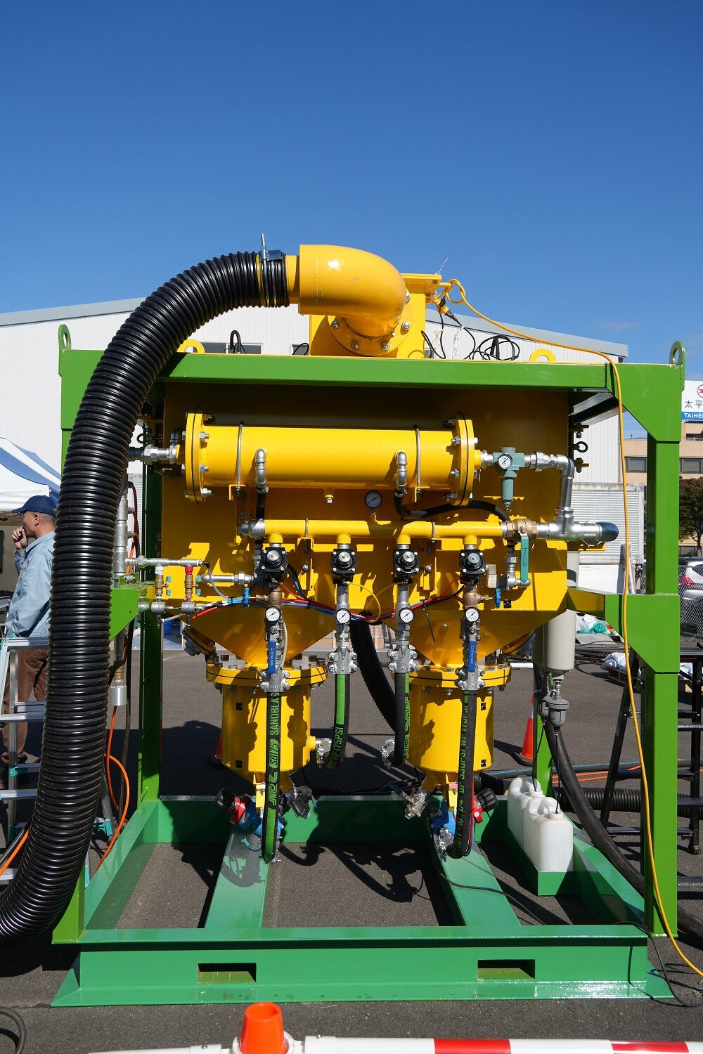 機械はブラストユニット+バキュームユニット+粉塵回収機を1つのシステムとして運用しており、その重量は4t未満、サイズもh2.5×w1.780×l2.177mと4tトラックでの運用ができるようにコンパクトにしている。