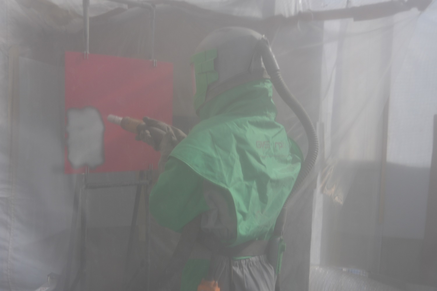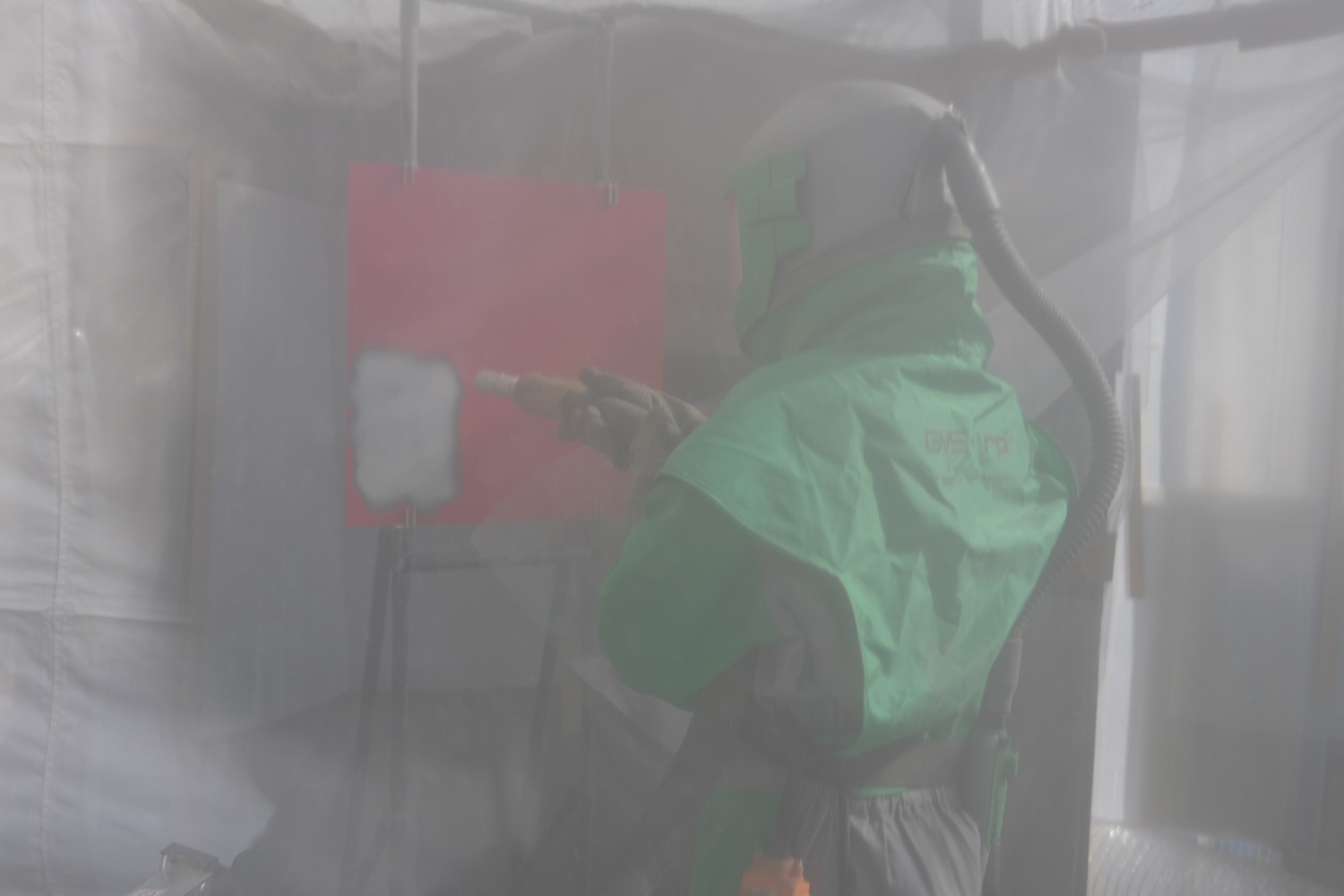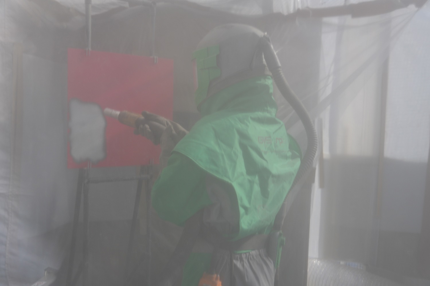 モイスチュアブラスト 少量の高圧水をエアーブラストに混ぜて塗膜除去及び研掃工を行う