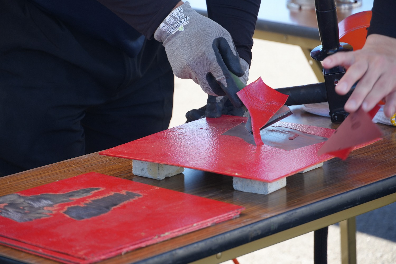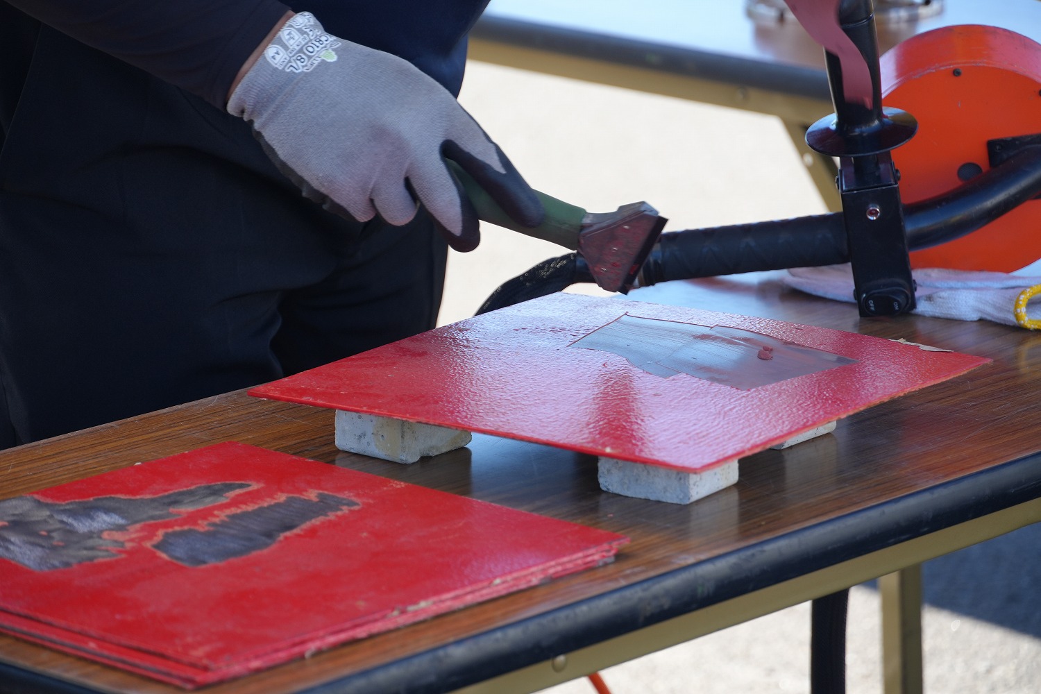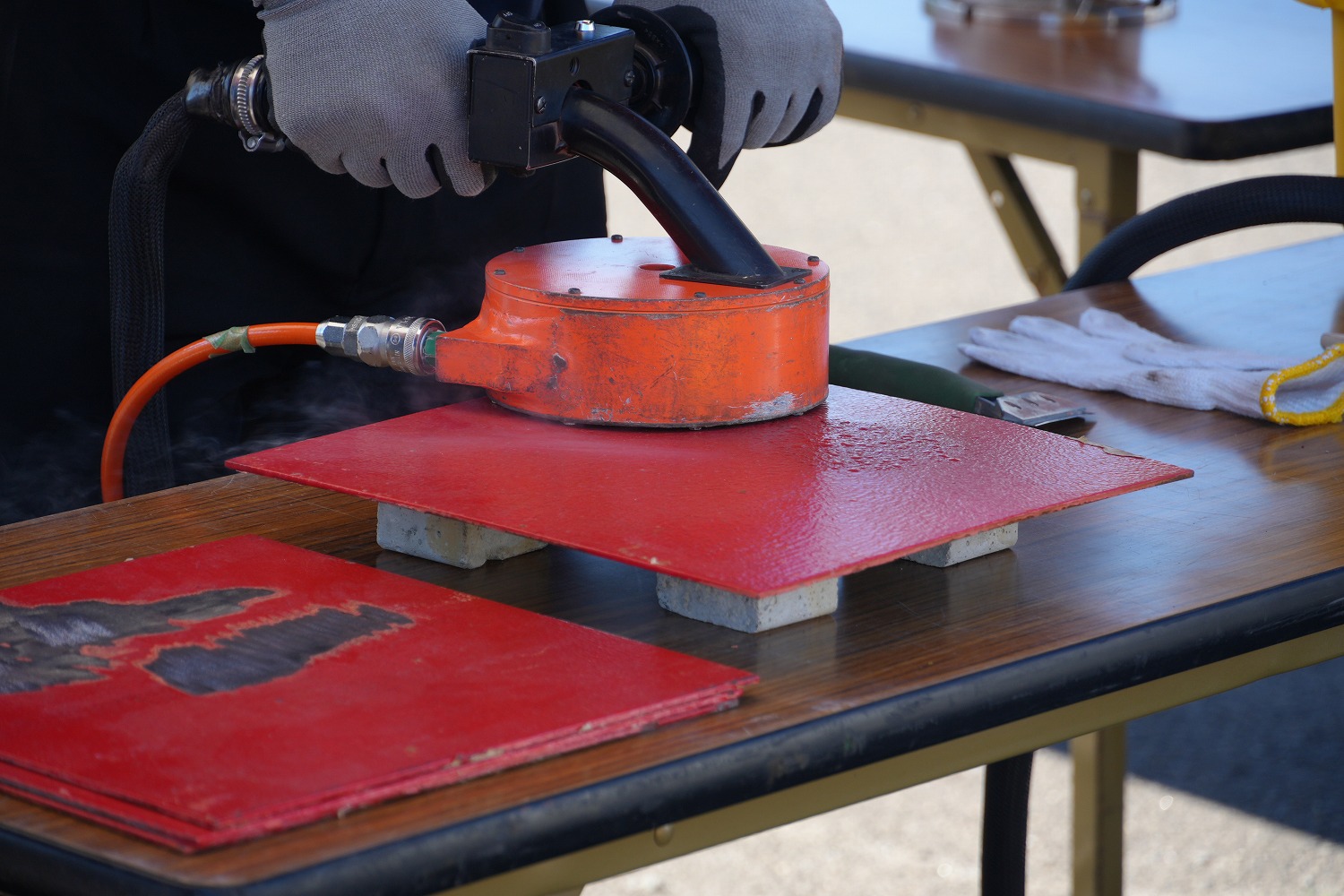 説明・実演された商品は「リユースブラスト」、「モイスチュアブラスト」、IH式塗膜剥離機「メクレル」、ブラスト面形成動力工具「ブリストルブラスター」など。