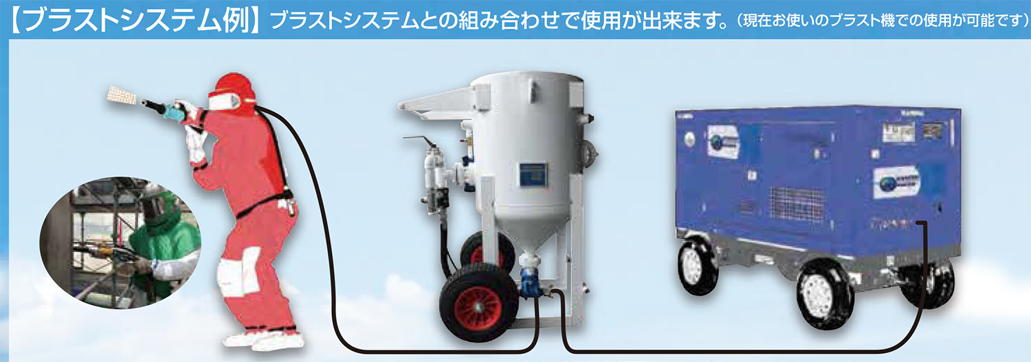リユースブラスト コンプレッサの圧力は、ノズルまでの距離に応じて0.7~1.4MPaの範囲内で自由に可変