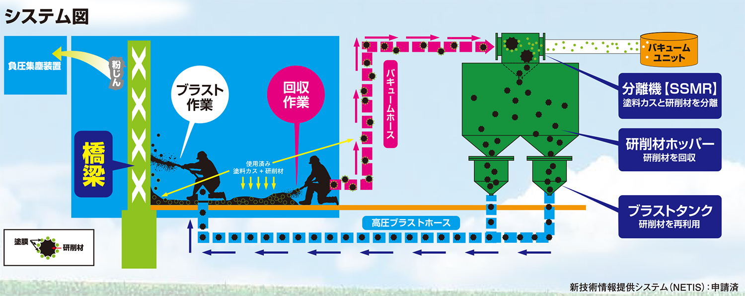 リユースブラストは、鋼構造物の素地調整・塗膜剥離における高圧ブラスト工法で、東京都の旧晴海鉄道橋の歩道橋化に伴う塗替えの際などで実績を有している。コンプレッサの圧力は、ノズルまでの距離に応じて0.7~1.4MPaの範囲内で自由に可変することができ、従来の0.7MPa程度の最大約2倍の圧力を有するため、「コンプレッサから約200m離れていても約1.1MPaの力でブラストすることができる」(同社)。そのため、「2ノズルで1日当たり約70㎡の施工面積を確保できる」(同)としている。また、研削材にスチールグリッドを用いた場合、同グリッドを塗膜かすと分離し、再利用する機構として「SSMR(Shock Separate Media recycler)」を用いている。これは衝突分離方式(吸引回収した使用済み研削材を衝突版に衝突させて分離)と遠心分離方式(気流に乗せた使用済み研削材を遠心で分離)を用いることで、研削材と塗膜かすを分離して研削材をブラストに再利用できるもので、これを若干のタイムラグはあるものの、ほぼ連続化して用いることで、塗膜除去およびブラストの施工効率を向上させている。