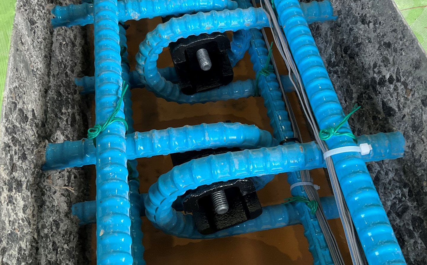 エム・エムブリッジと日之出水道機器、富士ピー・エス、宮地エンジニアリングの4社は、NEXCO3社で主に行われているプレキャストPC床版への取替の際の新たな継手工法としてHDループ継手工法を開発した。同工法は、HDループコネクタと呼ばれる高強度なダクタイル鋳鉄(FCD600-3:JIS G 5502、サイズは100×80×70mm、1.5kg)製の継手金物をループ鉄筋内に挿入することで、ループ鉄筋と金物が当たり、接続した鉄筋同士の応力を直接伝達できるようになるもの。通常のループ鉄筋継手はコンクリートにひび割れ等が生じた場合、応力の伝達に不具合が生じるが、同コネクタを使ってループ鉄筋を内側から支持することでコンクリートを介さずに応力伝達できるため、長期的な性能の確保が期待できる。さらに通常の横目地だけでなく、半断面、あるいは複数断面の床版取替を想定した縦目地の継手に使うための輪荷重走行試験も行っており、横締めPC鋼材を使わず、さらに特殊な間詰め材なども用いることなく、RC構造でも成立することを確認した。4社は複雑な工程を必要とする複数断面の床版取替をより効率的に行え、さらに鉄筋の応力を適切に伝えることができる継手工法として実橋への適用を目指していく方針だ。(井手迫瑞樹)