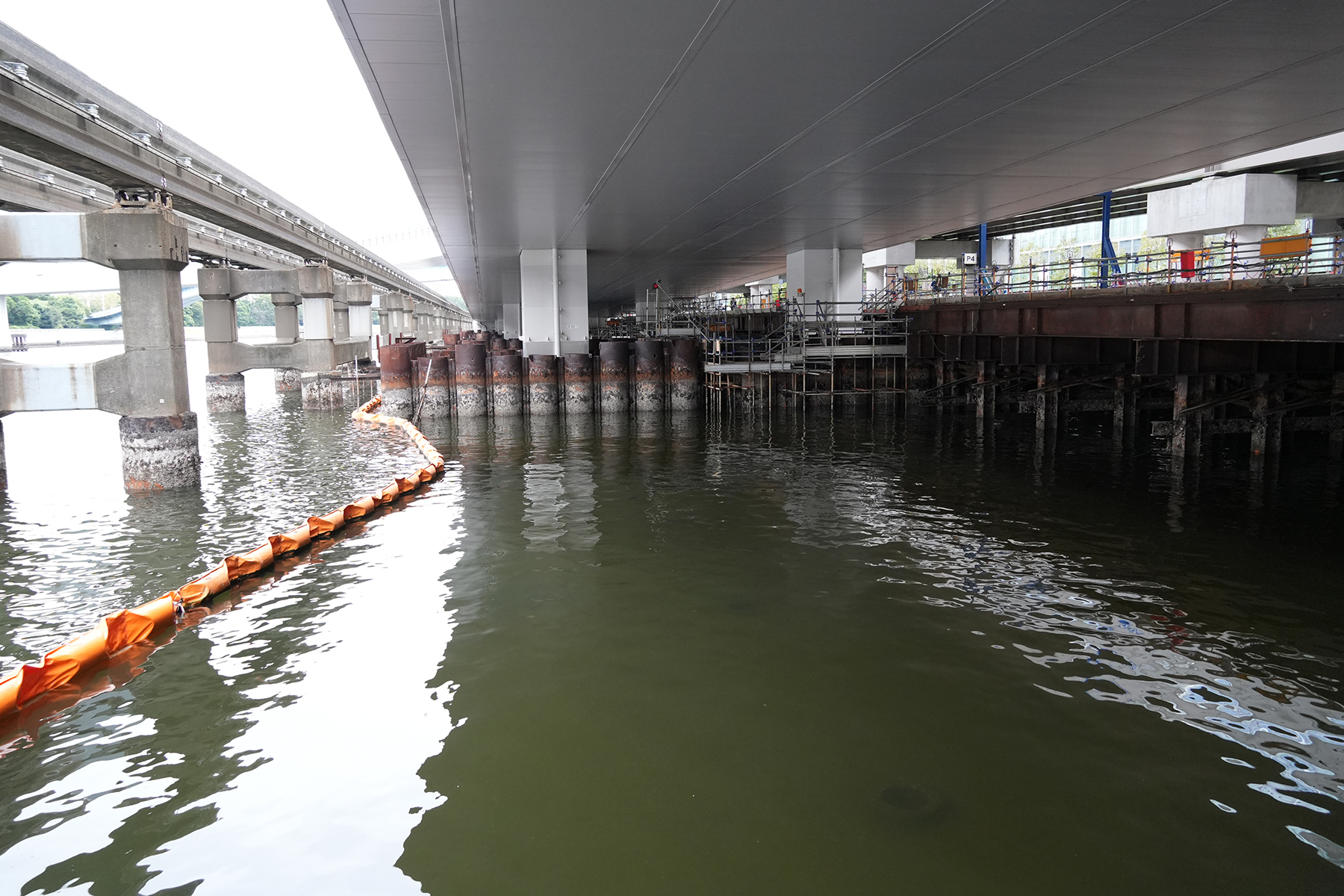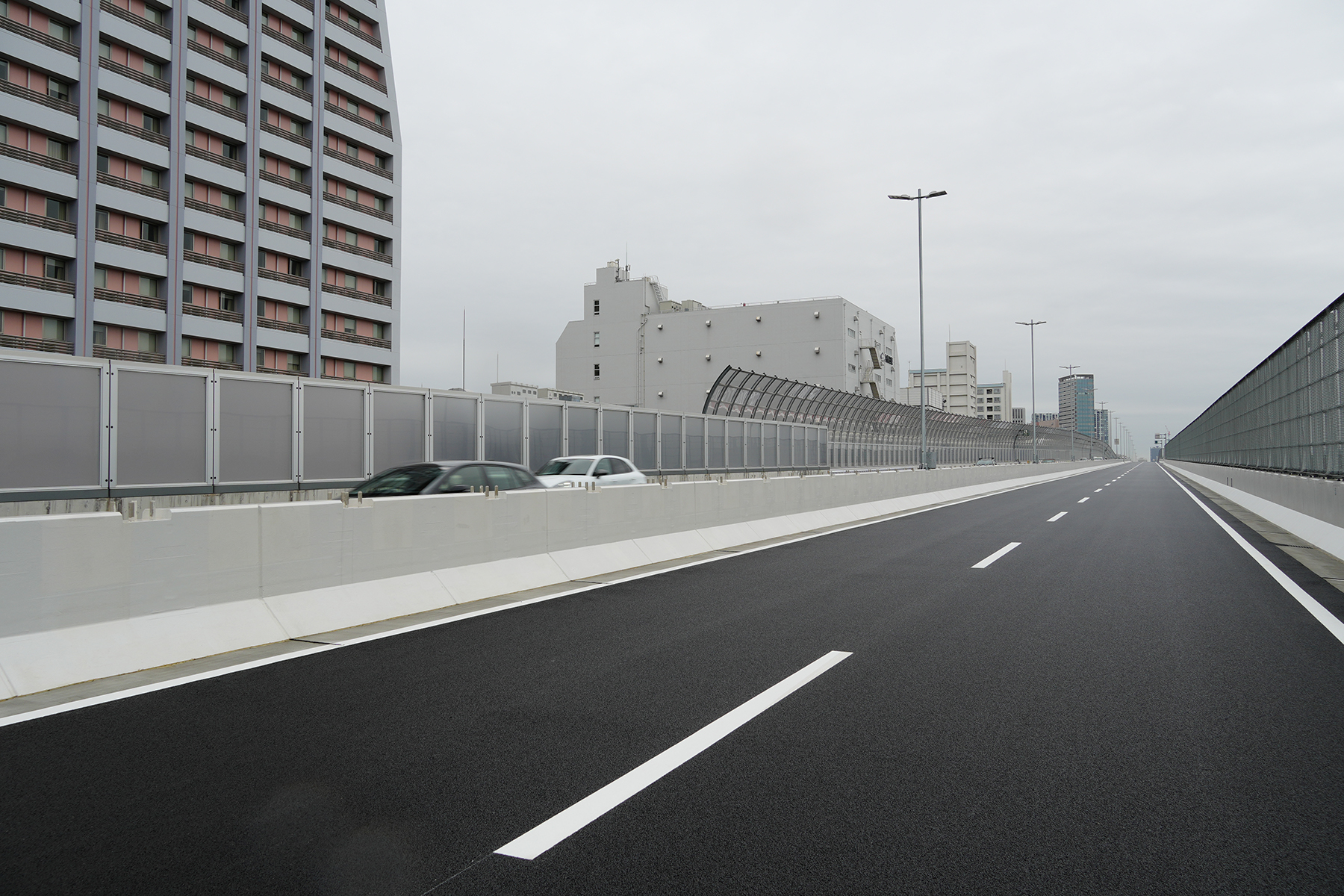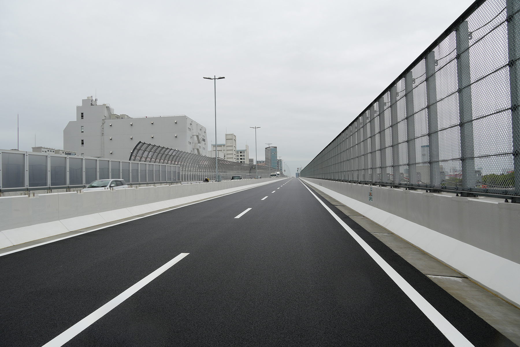 最初の段階では、護岸とのわずかな隙間を活用して迂回路を構築し、都心方向の交通を移行させた。これにより既設上り線が空き、その区間を更新構造物に置き換える施工環境を確保した。続いて、完成した構造物を暫定的に下り線として供用し、旧下り線の更新を進めることで、上下線とも将来形の構造物を段階的に完成させてきた。今回の現場公開は新設された下り線への交通運用の切替を目前に控えたタイミングで実施されたものである。