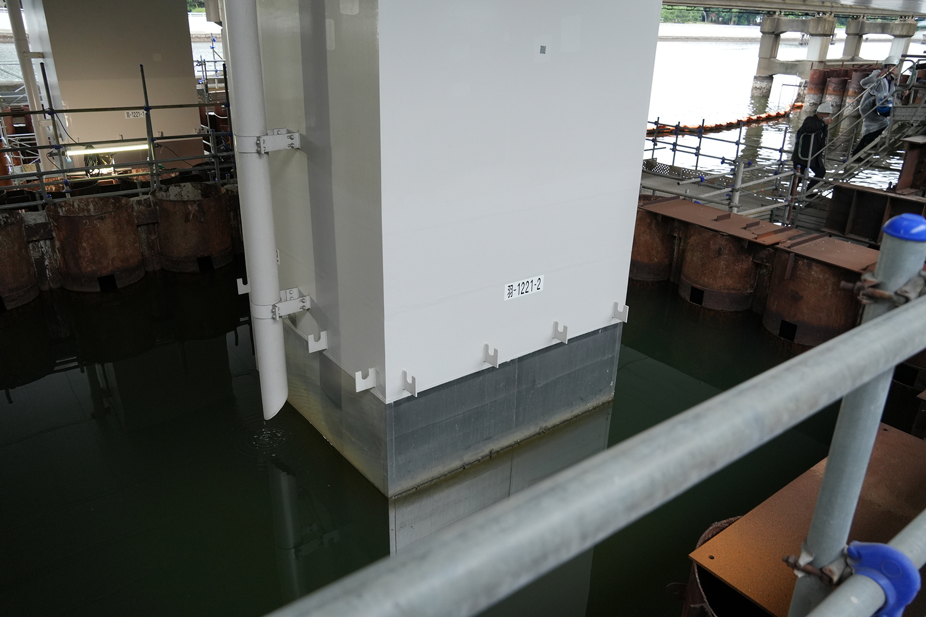 続いて案内されたのは、橋脚部である。橋脚部については、大気部にはAl-Mg金属溶射を防食下地とした重防食塗装、飛沫部及び海中部の潮位変動を考慮した範囲に角柱橋脚のためL型の角板と平らな帯板に分けて溶接されたステンレスライニングが施されていた。ローウォーターレベルからハイウォーターレベルまでの範囲に余裕を持たせて巻き立てることで、海水による腐食を抑制する構成である。さらに、その外側には重防食塗装が施され、複合的な防食対策が講じられていた。ここで示された「100年先まで」という言葉は、単なる目標値ではなく、維持管理と一体で初めて成立する時間軸として説明された。構造材料、点検空間、アクセス動線を含めて設計することで、長期にわたり健全性を保つ計画であることが述べられた。
